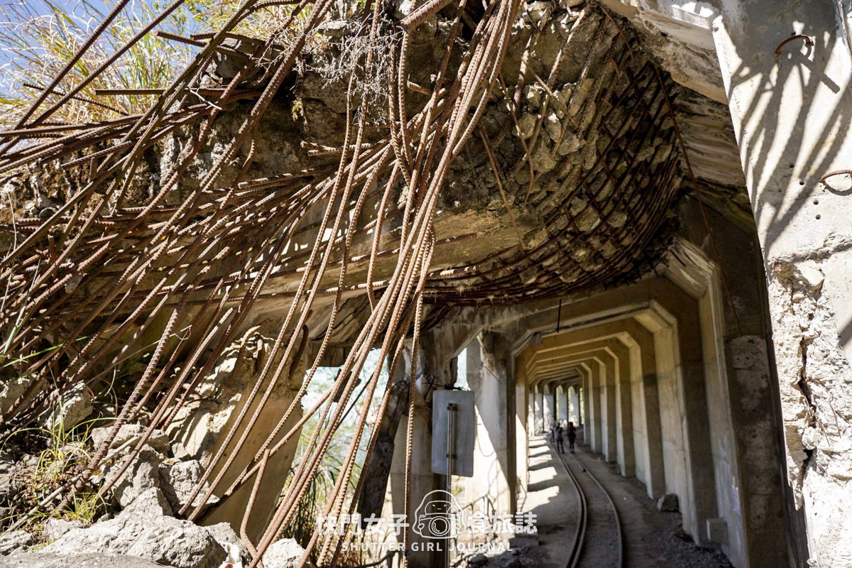 從這邊拍攝過去可以看到緊鄰山壁的隧道,尾端還有山壁石塊崩落的地形