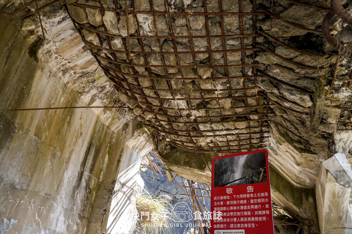 過了崩塌處抵達隧道的另一邊,因隧道受損的關係已經可以看到鋼筋及內部的水泥石塊