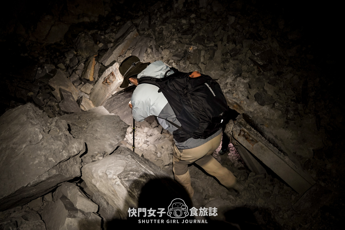 這邊的隧道被一堆石塊堵住,已挖出一條小道讓人通行,為了手腳方便真的會建議帶頭燈比較適合