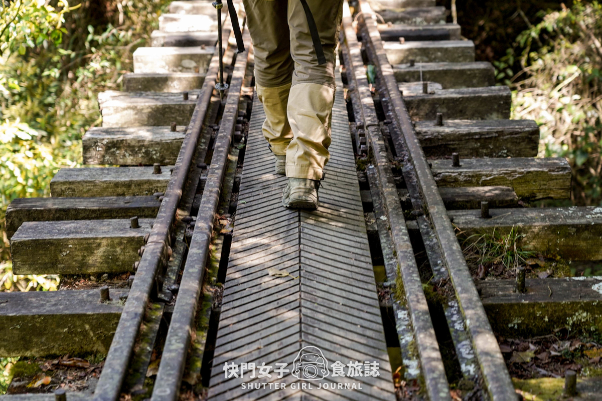 鐵道中間鋪設平的板材讓人行走,基本上是非常穩固且安全的,行走時要走在中間的板材上,不要走在旁邊的木頭上
