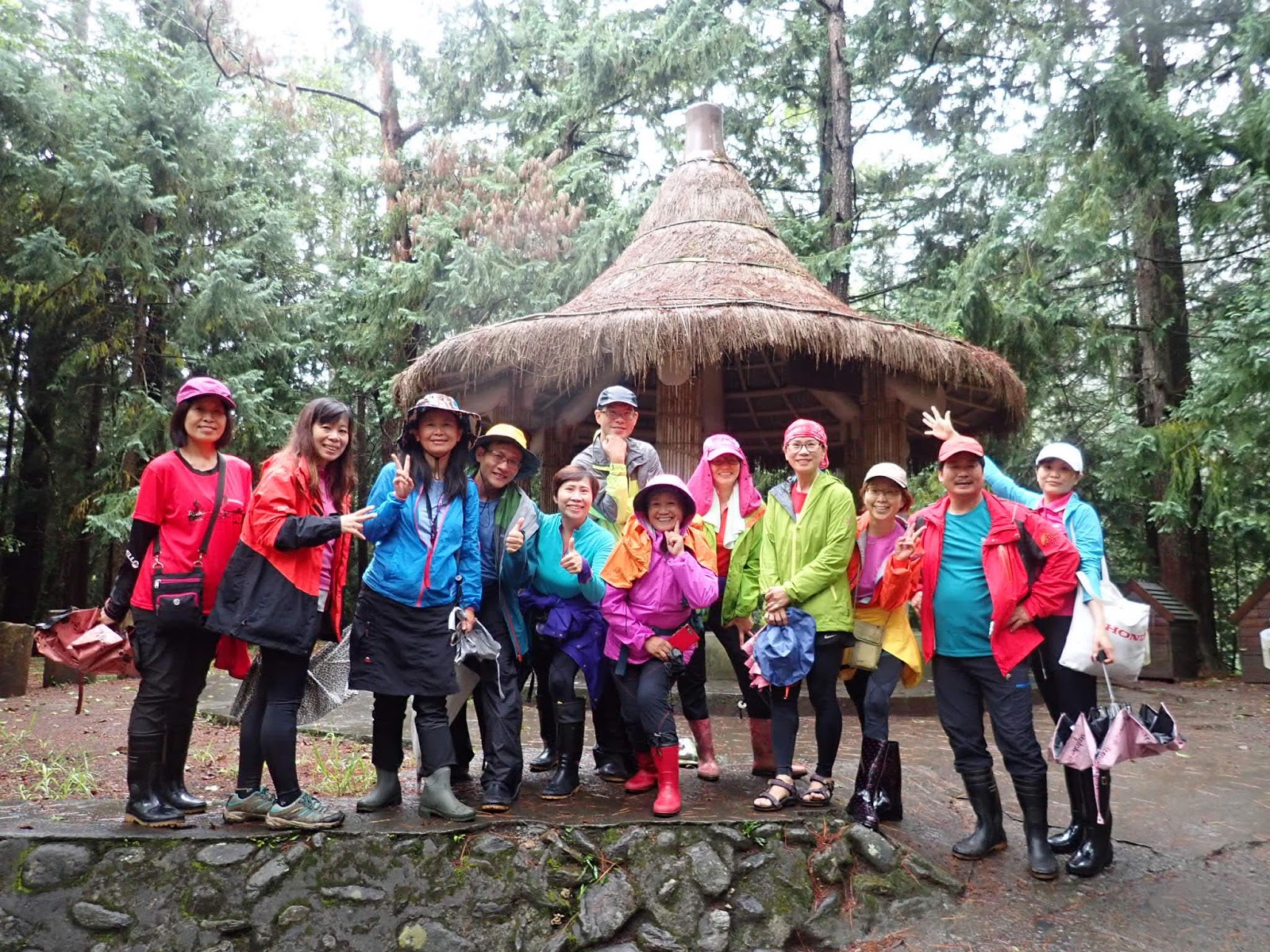 雪山, 睽別30年, 我來了, 按行程計劃走主東北峰, 6:40大橋頭集合, 4輛車16人(有3人放棄), go! 出門涼爽爽的天氣沒雨耶, 心安了不少, 希望能跟平多縱走一樣好運, 一路沒雨直到南山才開始飄幾滴, 到了武陵農場後雨勢漸大沒停歇, 10:45到露營區躲雨吃中餐, 電話先問過協作, 說此時山莊雨下更大, 考慮到安全, 不敢貿然上登山口, 決定先到桃山瀑布走走, 靜觀其變