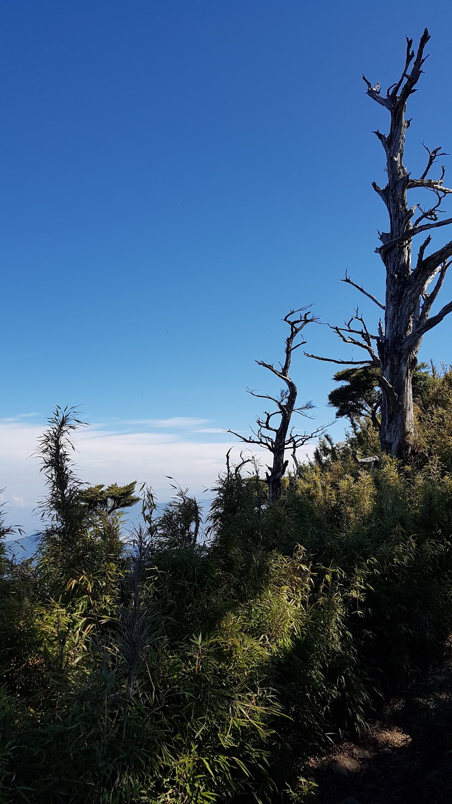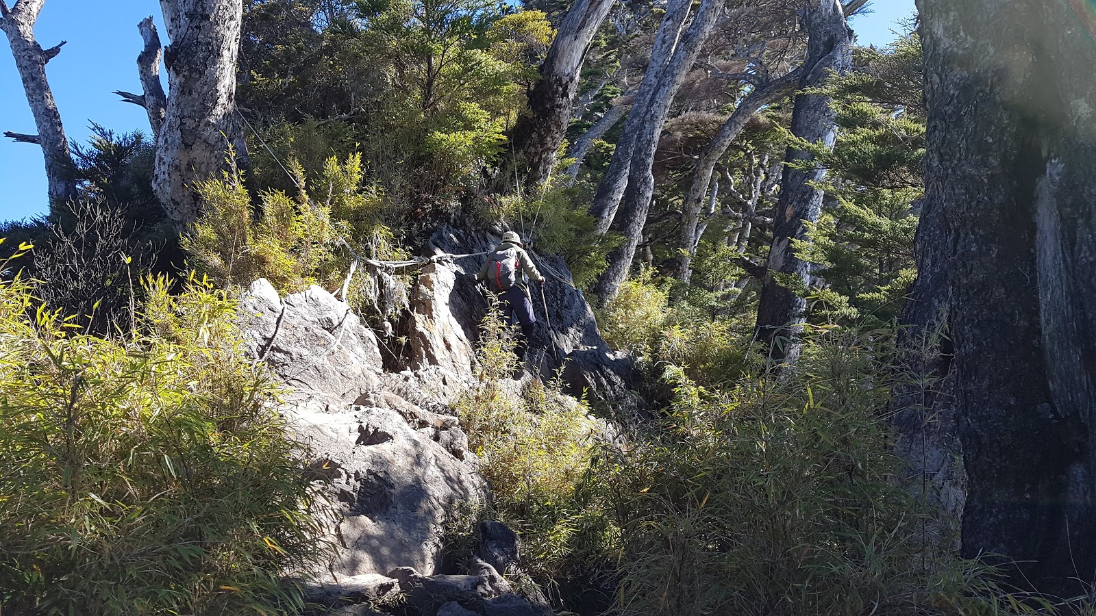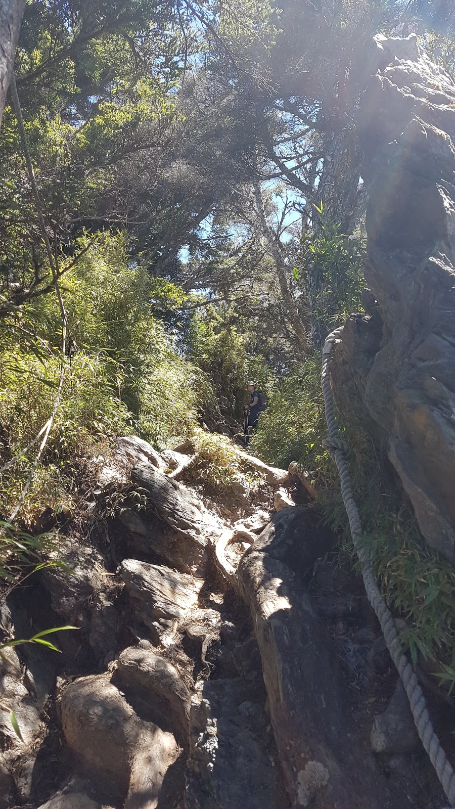 前半段多是在樹林裡不斷地陡上陡上再陡上,中間總有些小驚喜,例如超大的神木阿公,還有從石壁滲出的最後水源,還有一個此地無銀三百兩被封起來的觀南大武山的落石小懸崖。