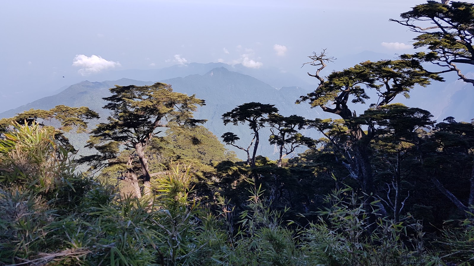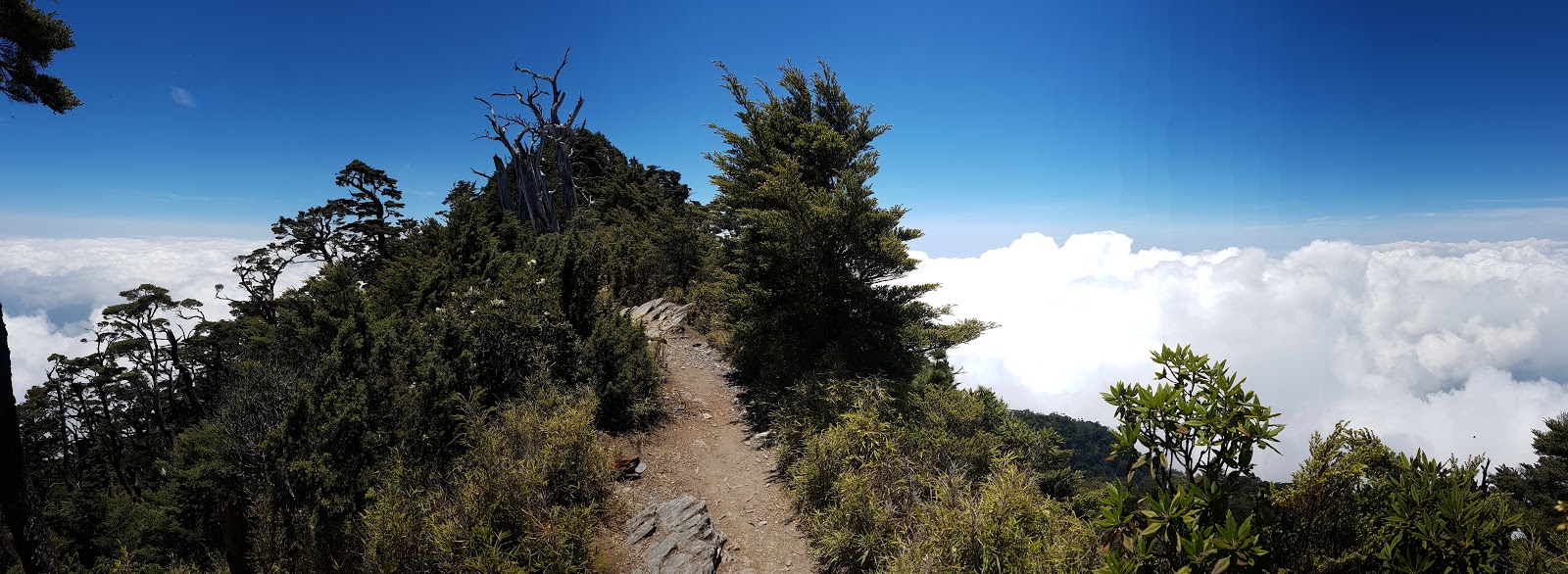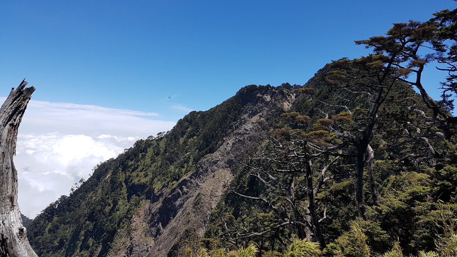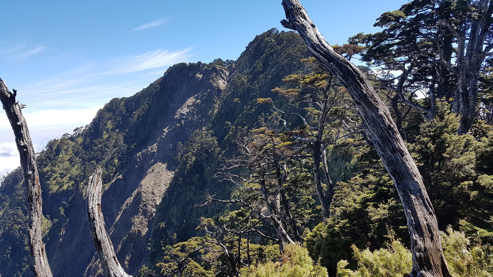 上陵線之後路線我覺得很像在走筆架連峰,只是地形更為陡峭,能踏站的地方有時候真的蠻少的,不過下面都有些鐵杉,若真的滑下去,也都還有鐵杉當作支撐,因此也沒有太強烈的裸露感。