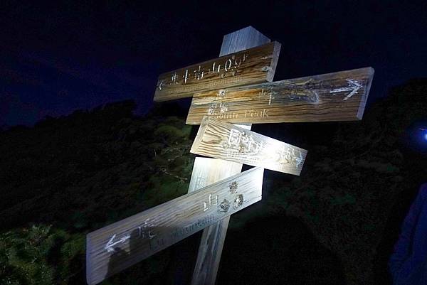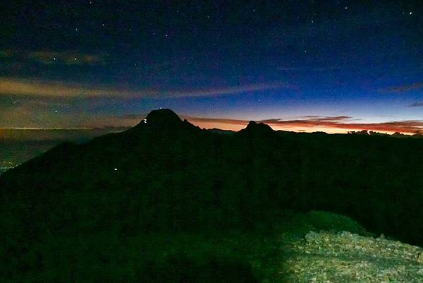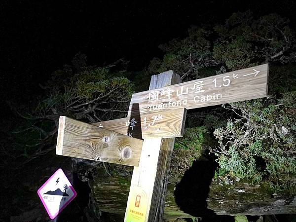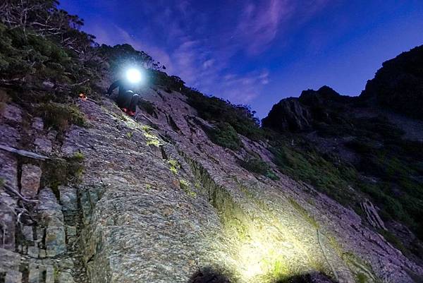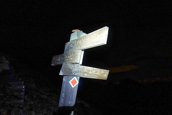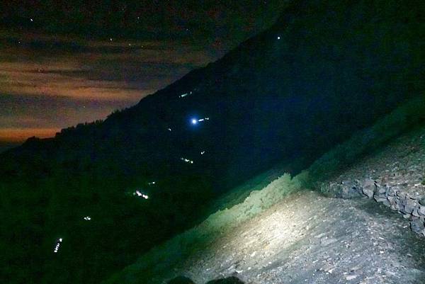 02:55 主南叉路,取往圓峰山屋,往圓峰的路上可以看到一排之字形的頭燈上主峰中,很有看夜景的感覺,而遠方的山下可看到一直有閃電,默默祈禱希望今天天氣別太差