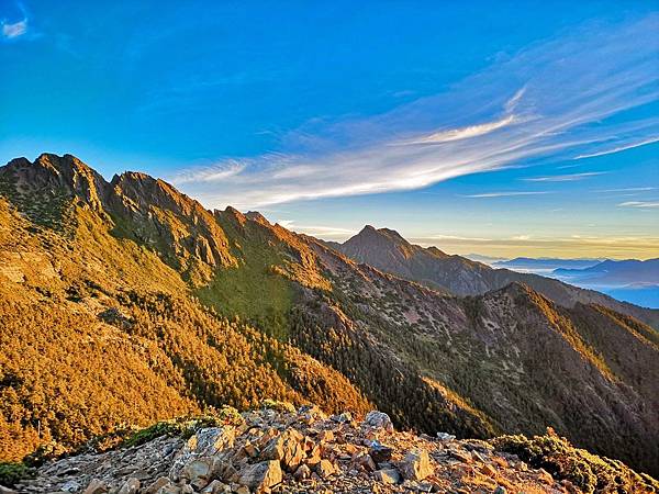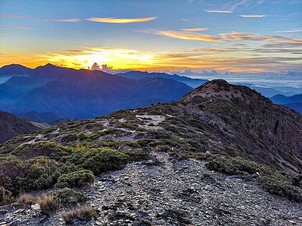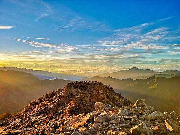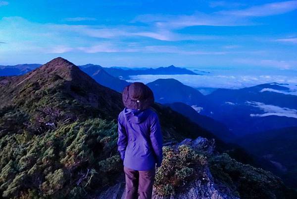 05:30 東小南山,往東小南山的路上很漂亮,走在稜線上面,展望很好,可以看到南邊有個超大雷雲包一直閃電,加上大片雲海,最後東小南山頂上,剛好日出了,超美,無論是陽光照射在南峰的岩壁上或是南二段、南一段,光線美得令人屏息呀! 這時的天氣越來越好了! 讚啦!