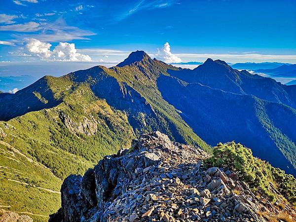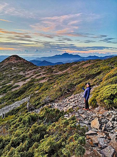 06:25 玉山南峰,從這邊可以看到之後玉山南稜的路…看起來好累呀…休息拍照,超讚展望! 從南峰西稜下山,要注意的是,要先上至南峰西邊的一個岩石山頭,之後在沿著稜線下到鞍部,路線不是很清楚,可以看到一些錯的路跡提早往左下切,在地圖產生器裡面的航跡有些都沒有走對,但如果走的是對的路,好走又很快地回到鞍部,形成一個南峰小O型