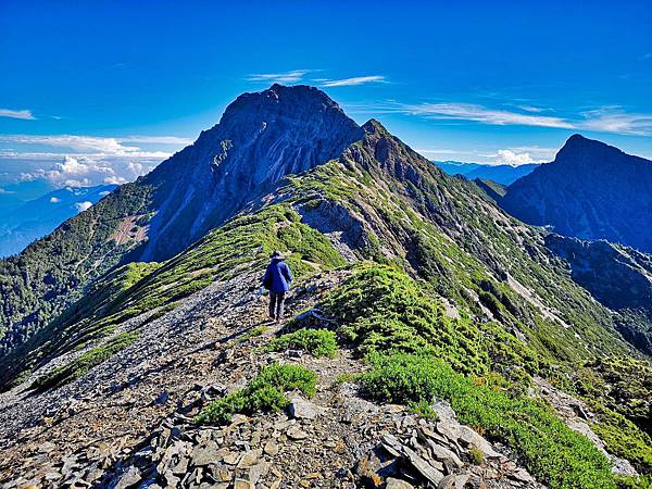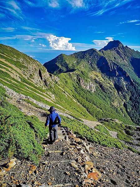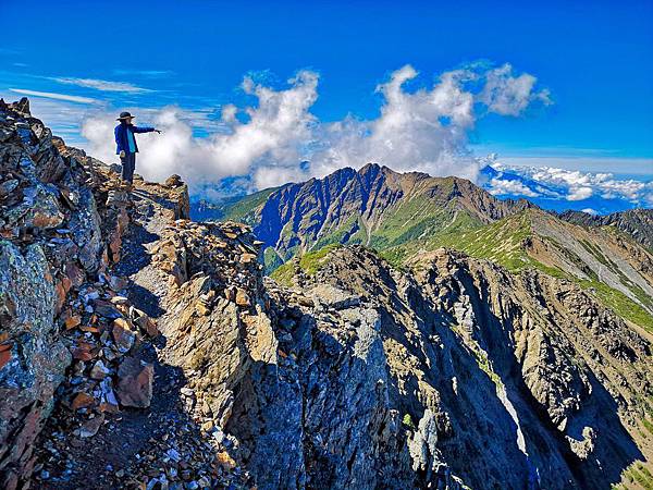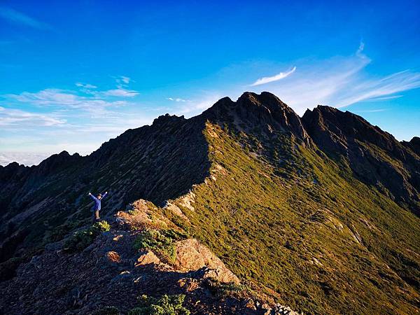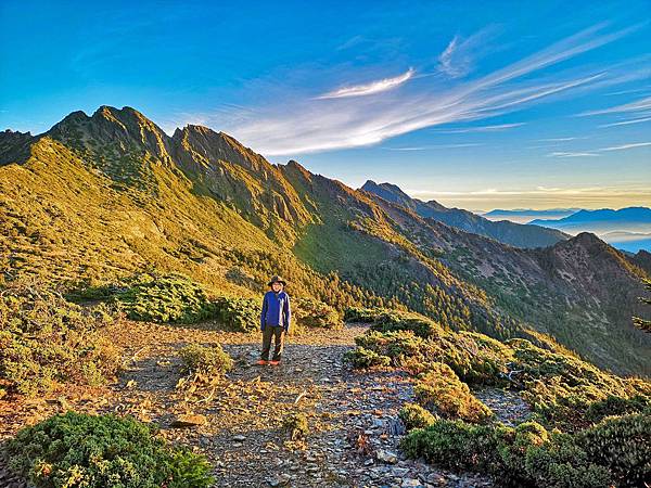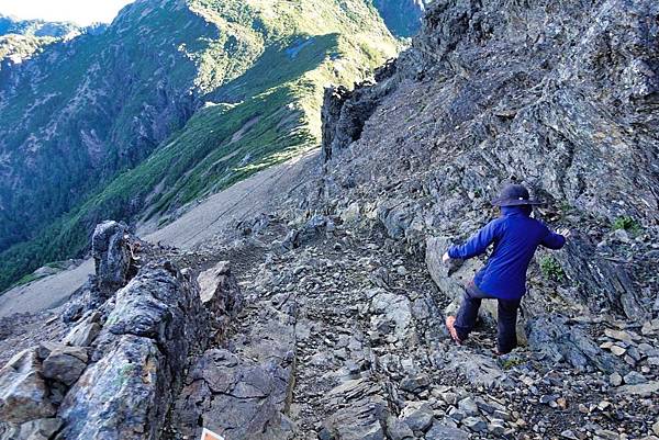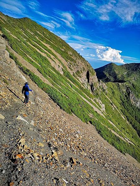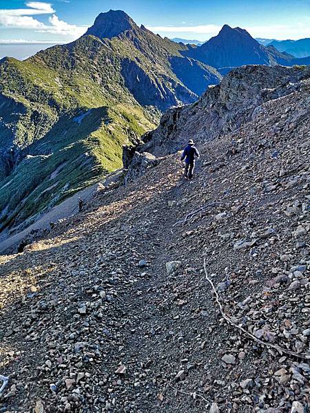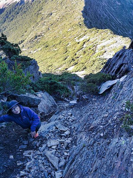 這次的走法有很多好處,可以一次將玉山南稜到南峰及東小南山的稜線全程縱走之外,由南稜上玉山真的比較有爬山的感覺,由那危稜、斷崖上到主峰,可以感受到主峰那令人震攝、屈服的崇高感,而不是大拜拜般的上去打卡活動。同時因為是O型走法,那惱人的之字形就不用重複走兩次了,多棒的路線呀!