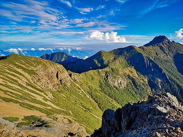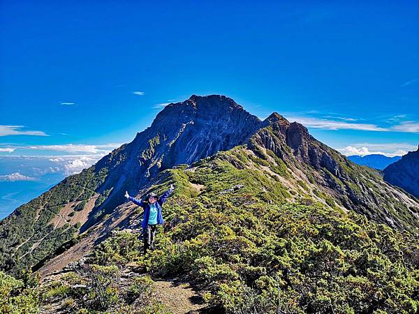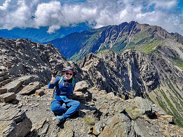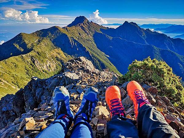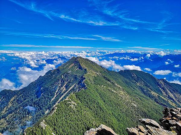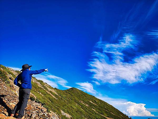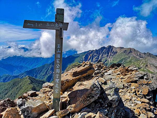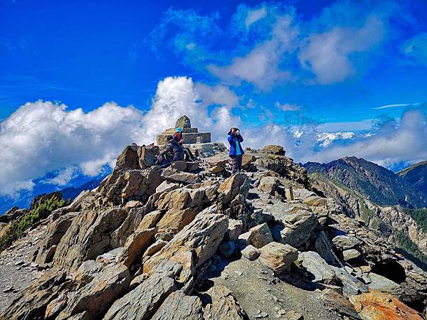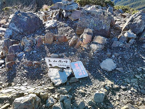 09:30 玉山主峰,總算是上來了,一大早從到東小南山,再一路南峰、南稜,辛苦的上到玉山,真的很感動,在此休息拍照,待會就會沿著傳統路線下山回家,完成今天的玉山南稜縱走,一眼望向南峰,心中想著,這一路那麼遠的稜線剛剛才走過來,很有成就感