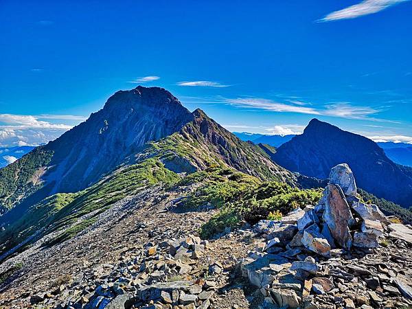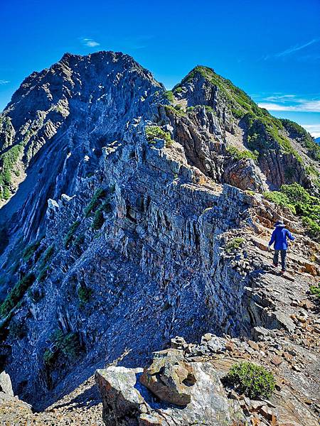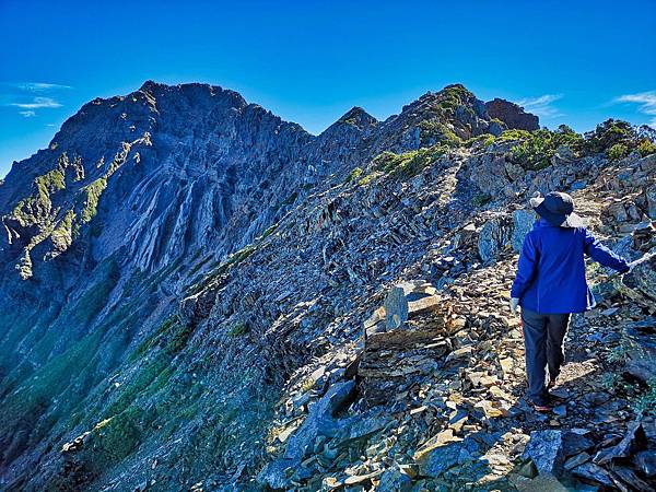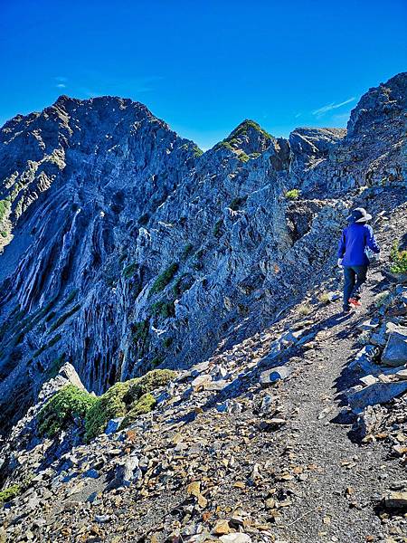 08:05 3804峰,山頂上有一顆立起來的石頭,擺盤的真好,玉山主峰越來越近了,由這方向看像主峰南面的岩石紋理,真是讓人震撼,一路上南稜的路徑其實都算明顯,不會有太大的問題,走在這稜線上好玩、好風景,美不勝收