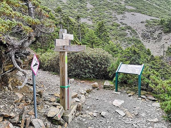07:50 路牌 (圓峰山屋0.3K,排雲1.9K),這裡開始沿稜上3804峰,一開始路徑沒有很清楚應該是怕不知道的人走錯吧,大概20-30米之後就可以看到布條出現,路跡也會約來越明顯