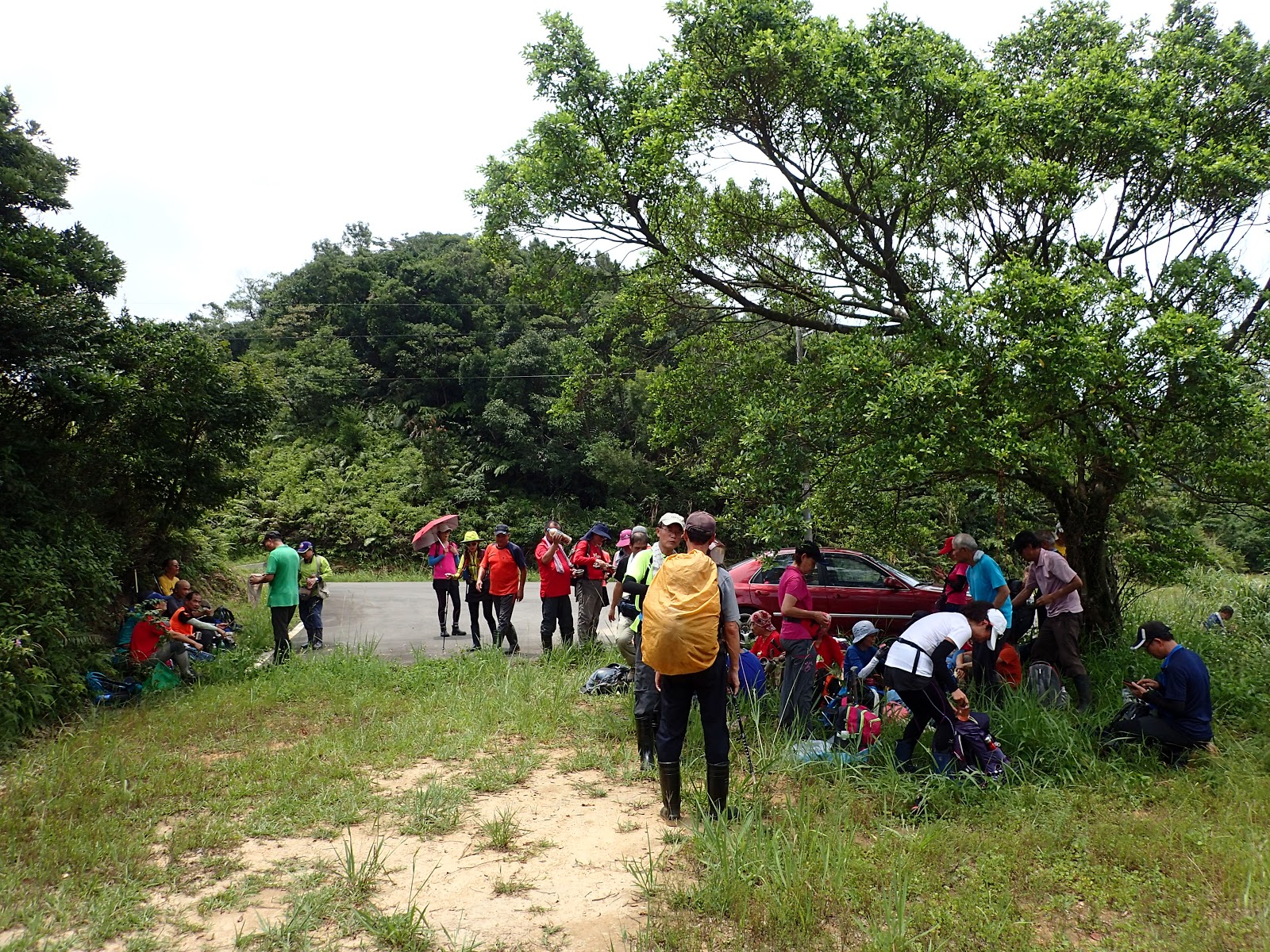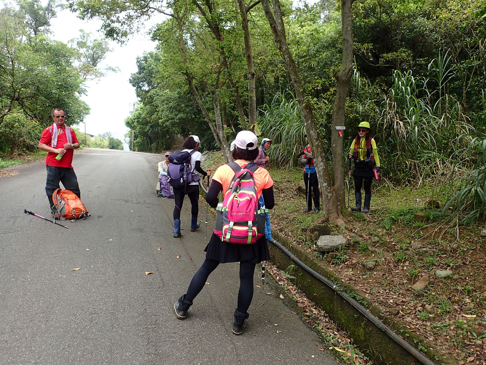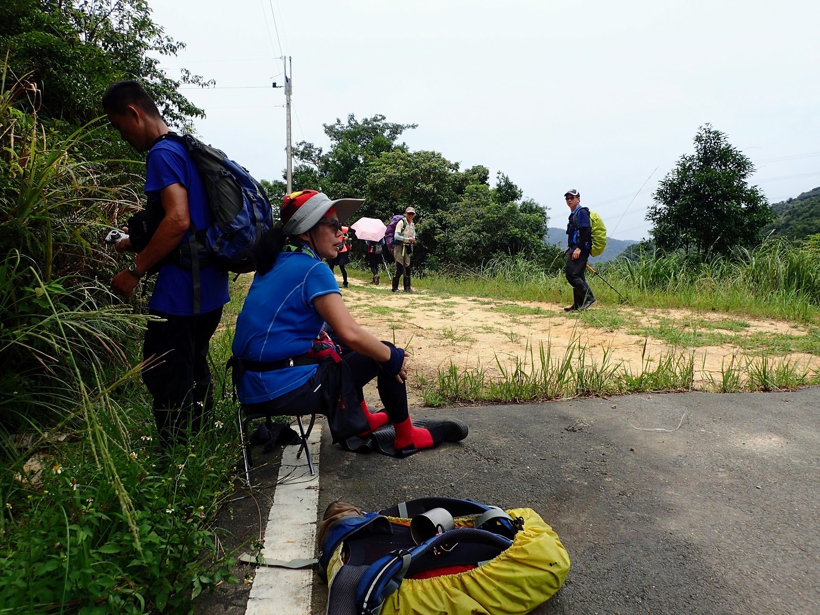 坐在路旁等大家凱旋歸來, 右下紅衣大哥的拉繩好用, 可以吊背包, 上肩也容易, 扣住肩帶利用額頭力量時肩膀比較不痛...