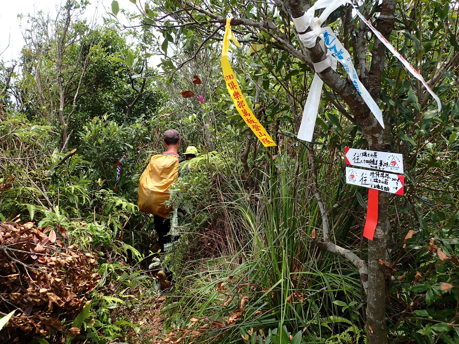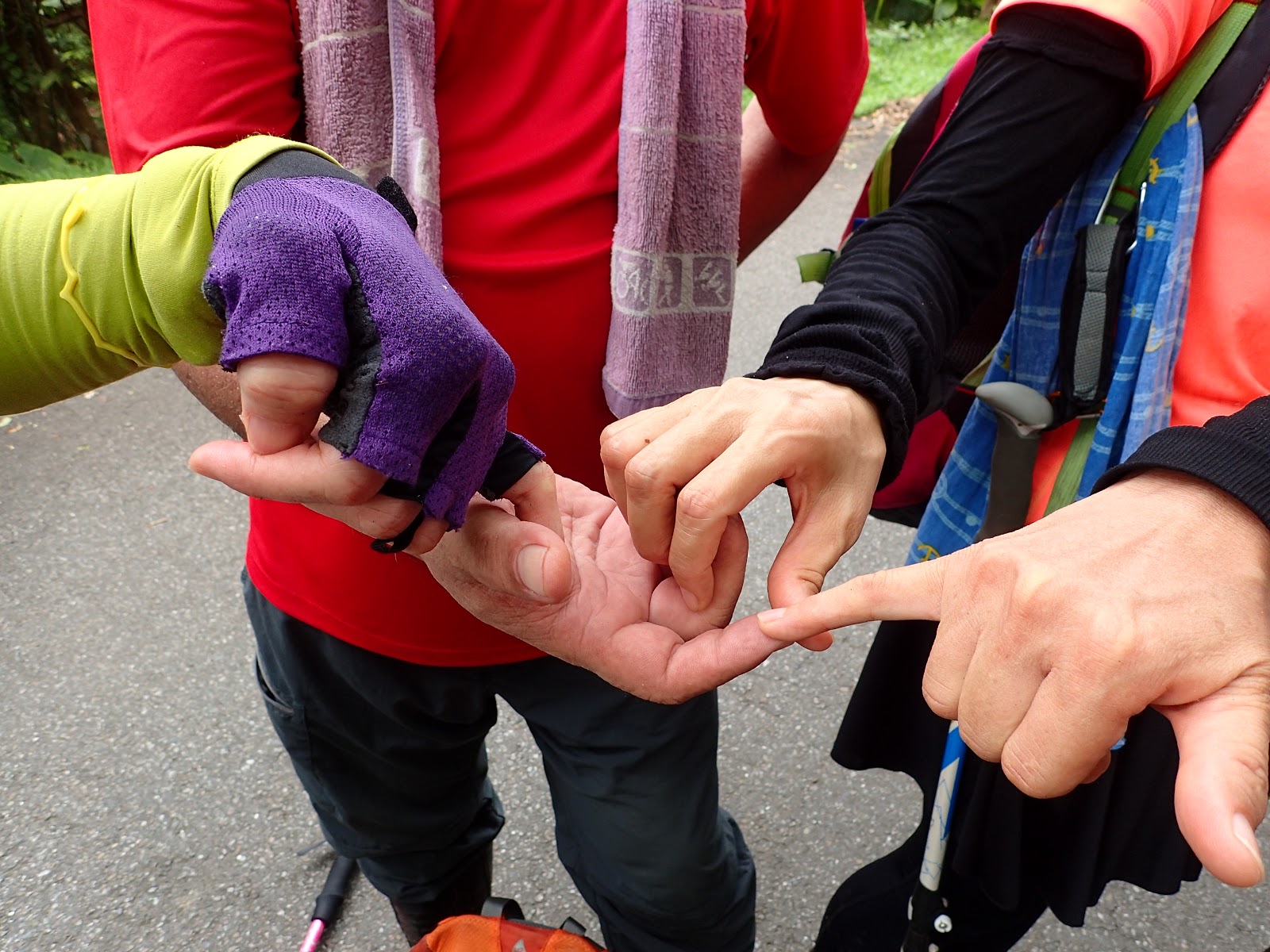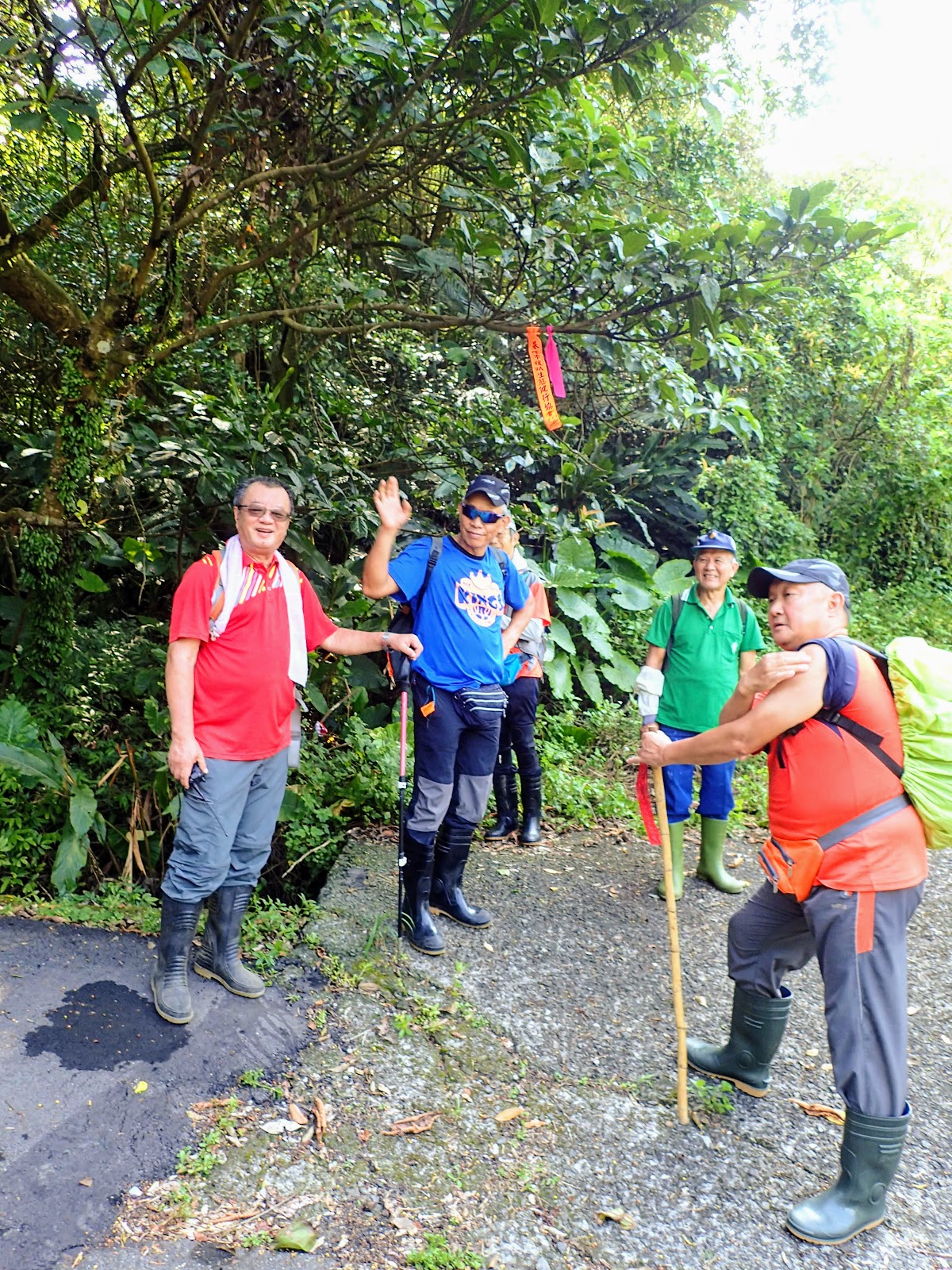 坐在路旁等大家凱旋歸來, 右下紅衣大哥的拉繩好用, 可以吊背包, 上肩也容易, 扣住肩帶利用額頭力量時肩膀比較不痛...