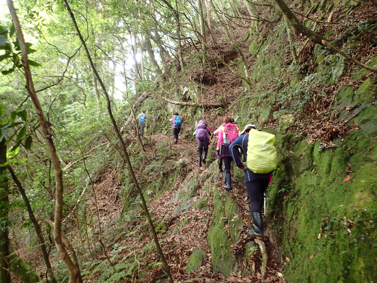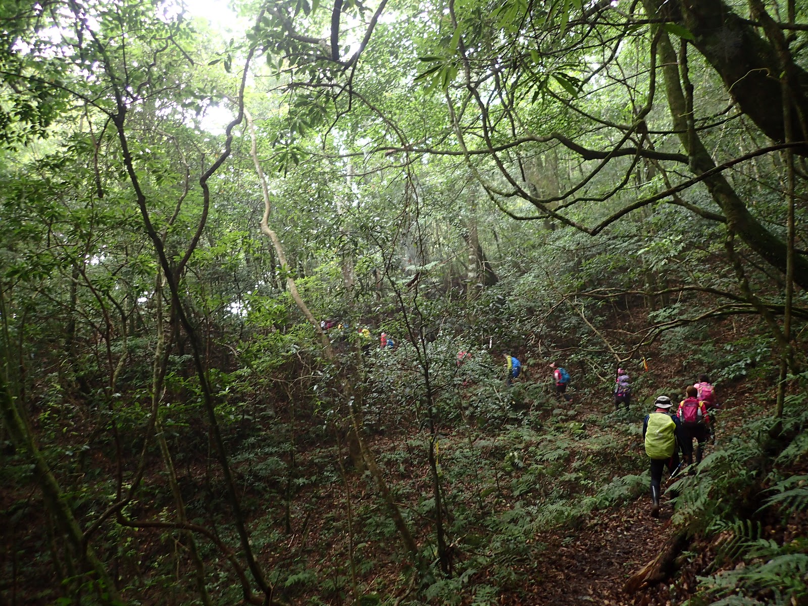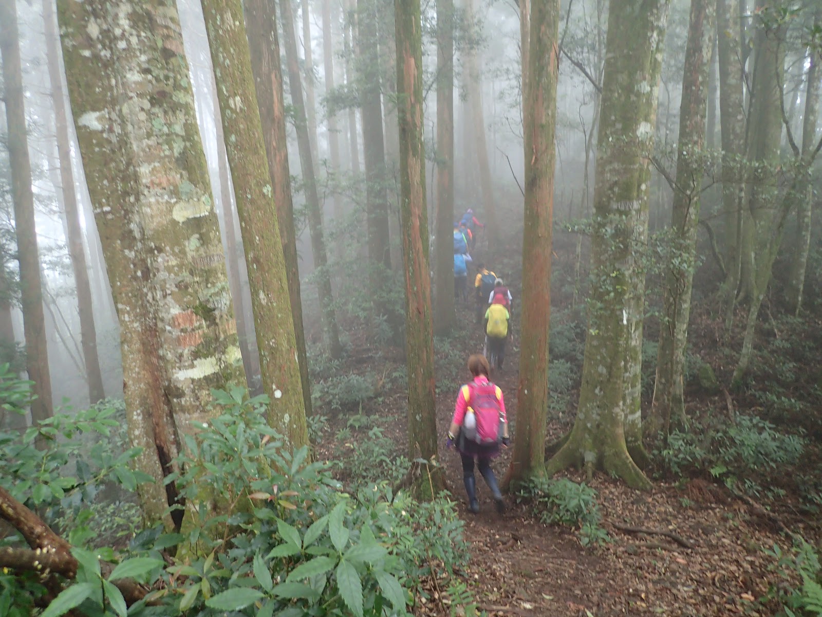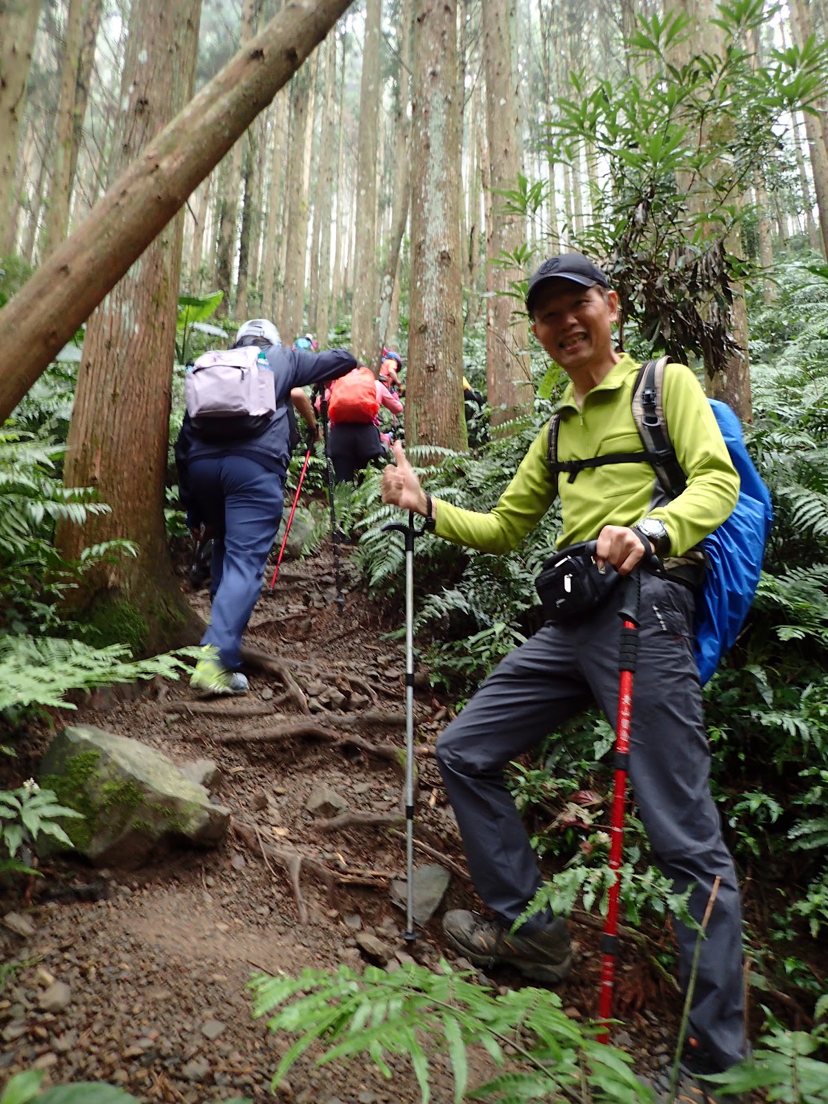 一整片筆直優美的杉木林, 涼爽舒適, 可能才下過雨, 步道微微濕潤 但不難走, 就是一路陡上累人啊