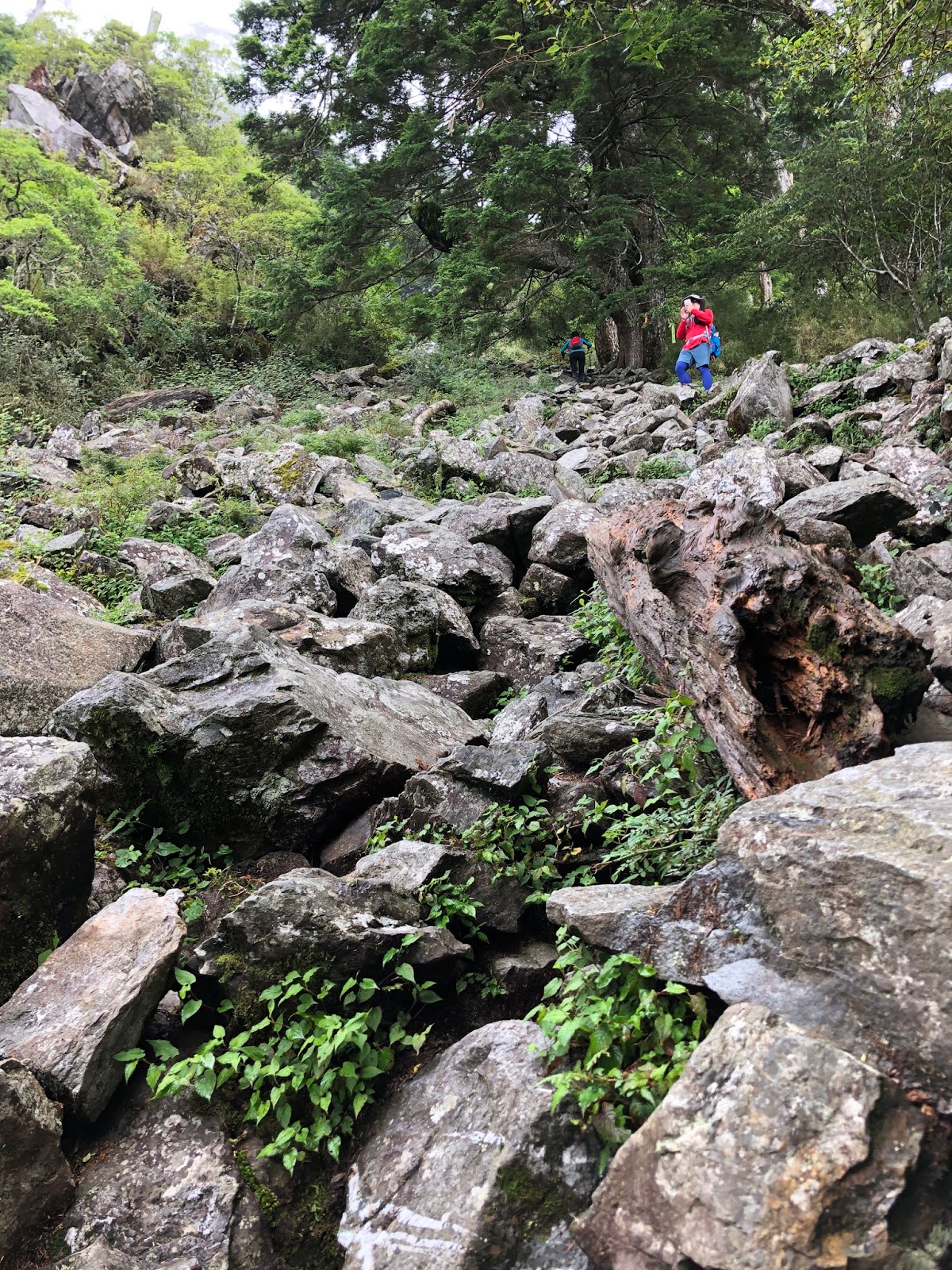 不過下山花了比較多時間,其實是因為在下山的路途中遇到一個新手山友,好像不太會選擇路線,我看他直接從石瀑的中間往下走,沿途還一直走到會滾動的石頭,感覺很容易滑倒,因此提醒他跟著我的路線走。然後又因為沿途只有我一個人在他附近,所以我也不敢離他太遠、免得他走錯路....。