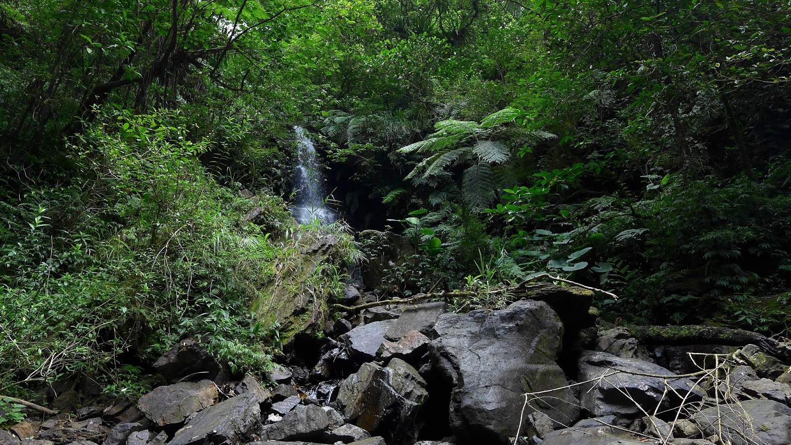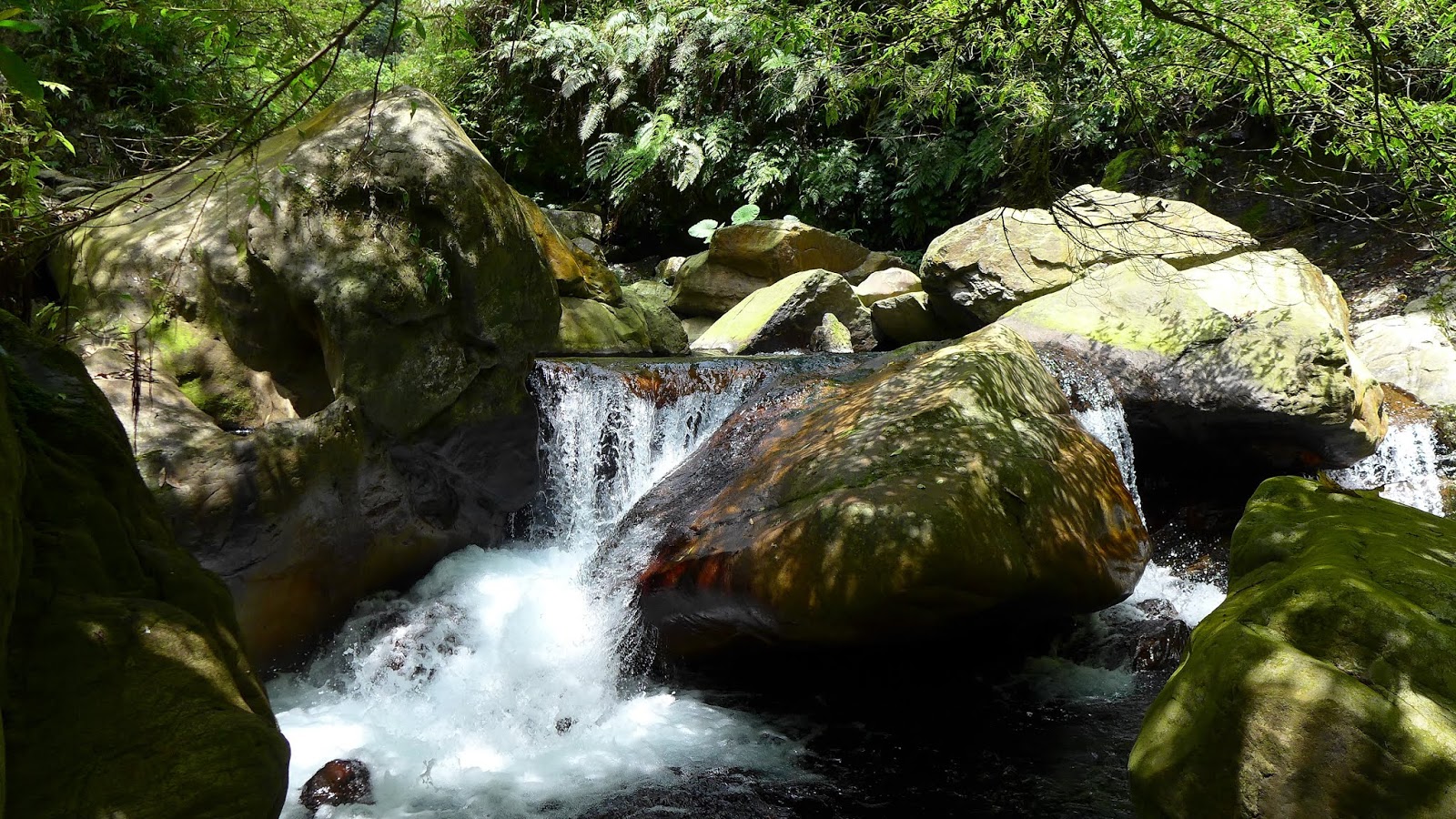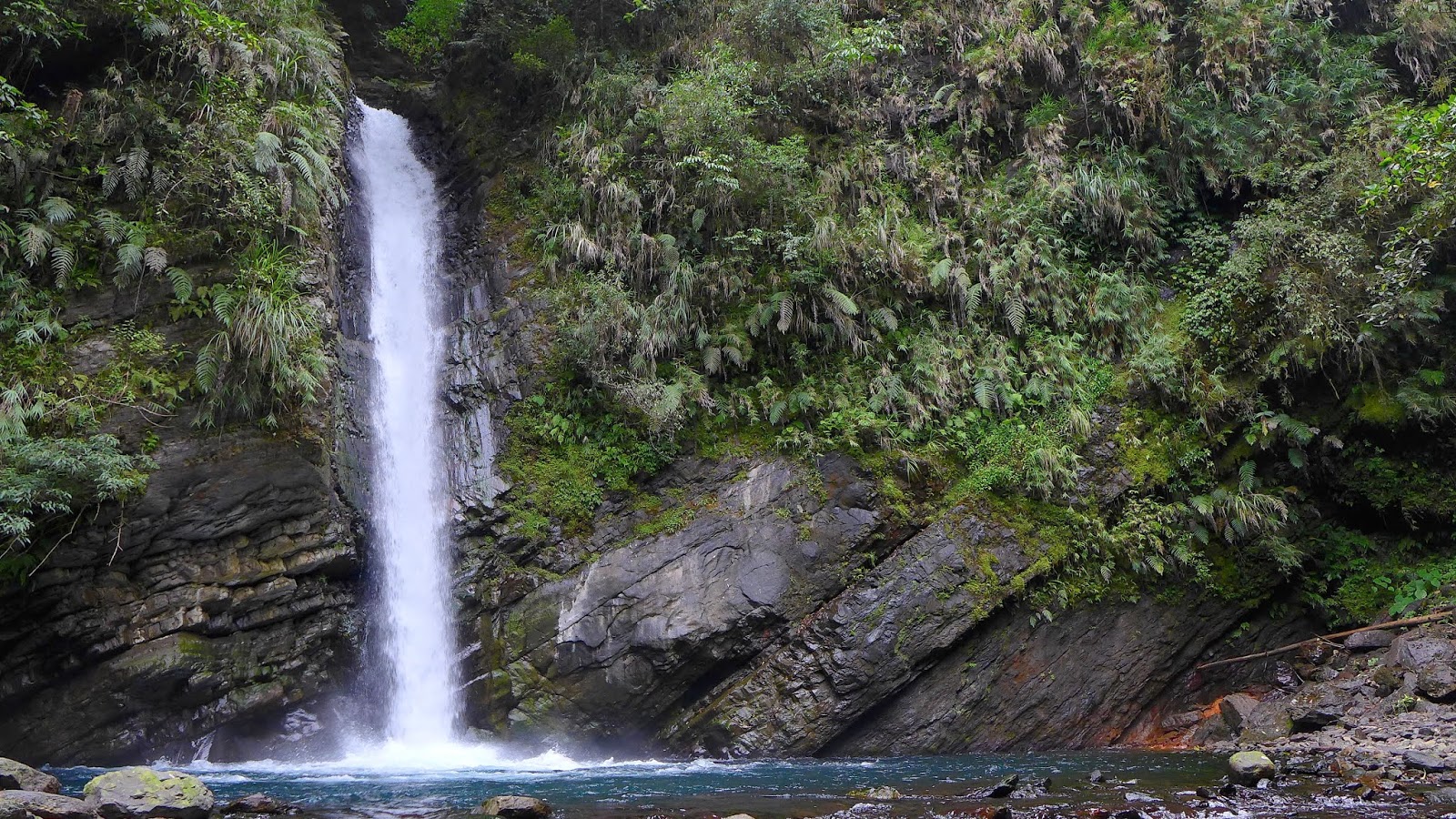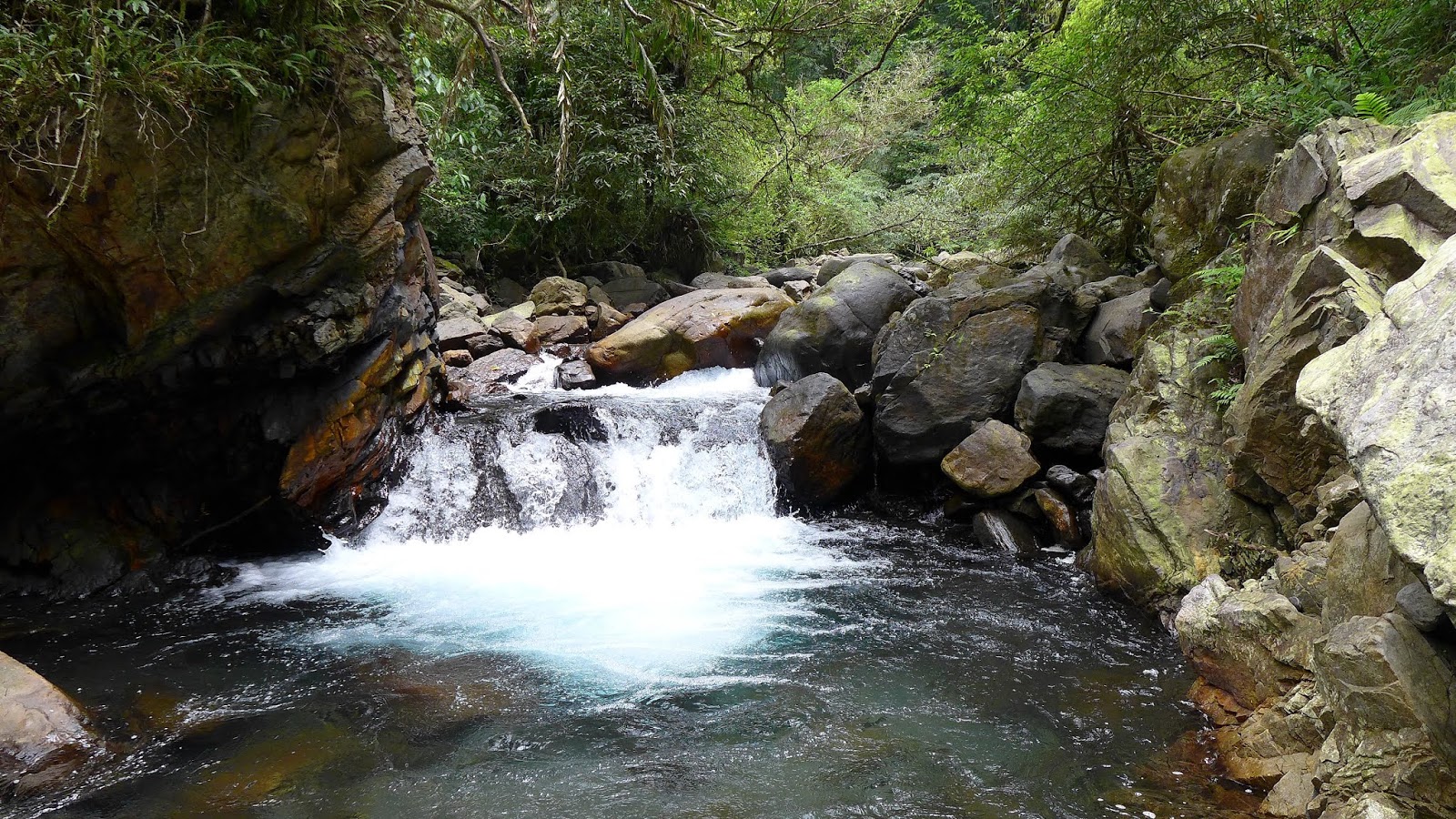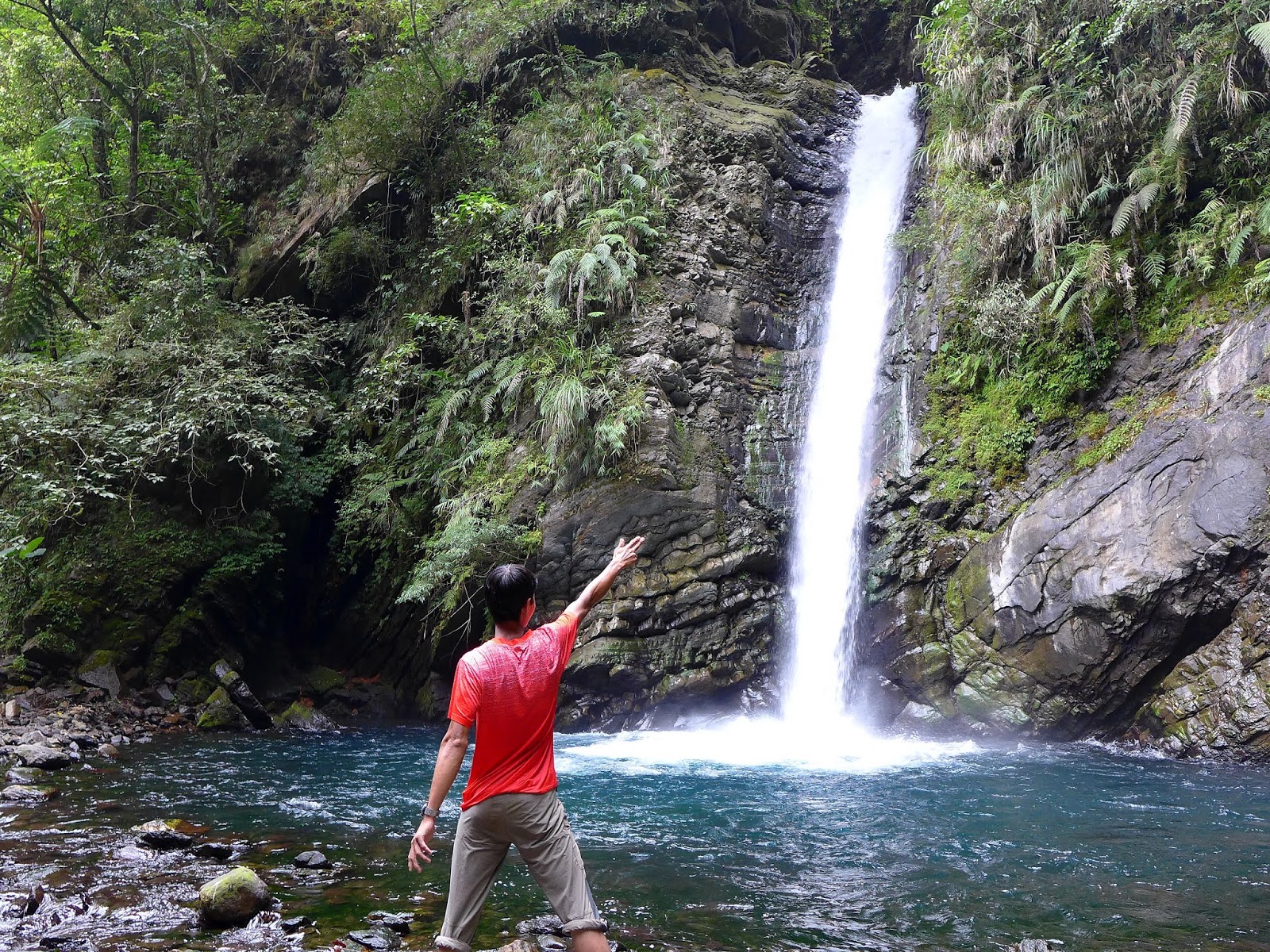 往上爬繞過剛那一潭後,問題來了,眼前有一處地型不好高繞,最快過去的方式就是下水切到對岸,但.....水深看過去至少到胸口,撐了那麼久上半身不弄濕,真不想破功,站在原地內心有夠掙扎,還在想一直看不到瀑布要不要回頭算了,眼睛餘光就撇到瀑布身影,終於要到了,不管身體會不會濕了,直接潦下去。