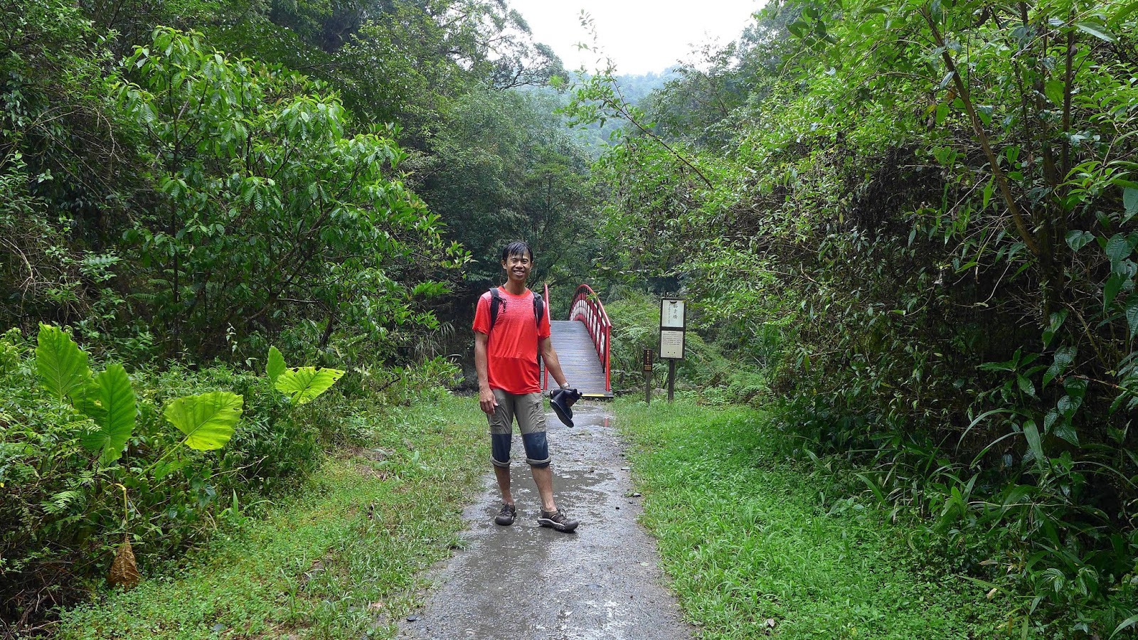回觀瀑臺和其他山友們聊天,休息一下換鞋準備繼續出發,此時天空開始下雨了,雨衣也省穿了,在步道上淋著雨慢慢走。