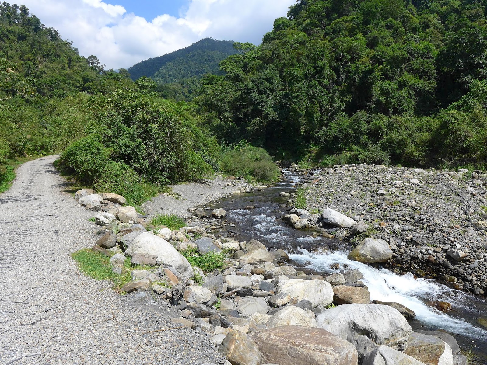 只有一開始是走碎石路徑步道,與車道交會後就一路走車道直到棧橋,中間幾度在溪邊停留休息兼拍照,尋找素材。
