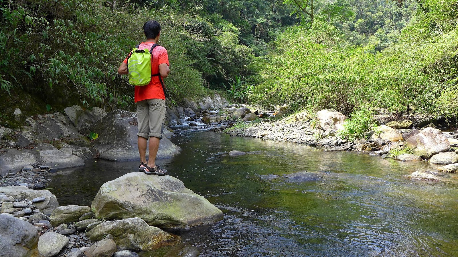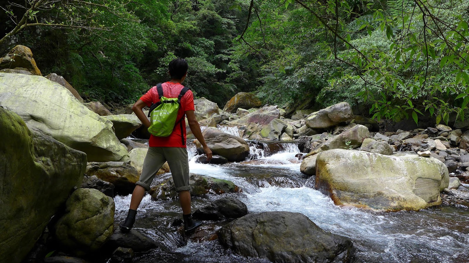 原本看資料到下一座破噹瀑布感覺不長,實際上卻不算短,事後看觀瀑臺到瀑布的GPS距離記錄,哇勒~~竟也有430M,一開始不換鞋繼續走,但隨著地型開始有落差變化,加上少有人跡,沒多久KEEN越來越難踩得穩,這已經不是效率慢的問題了,不過這部份早有預期,換上真正的溯溪鞋,在溪谷不斷左右過溪前進。