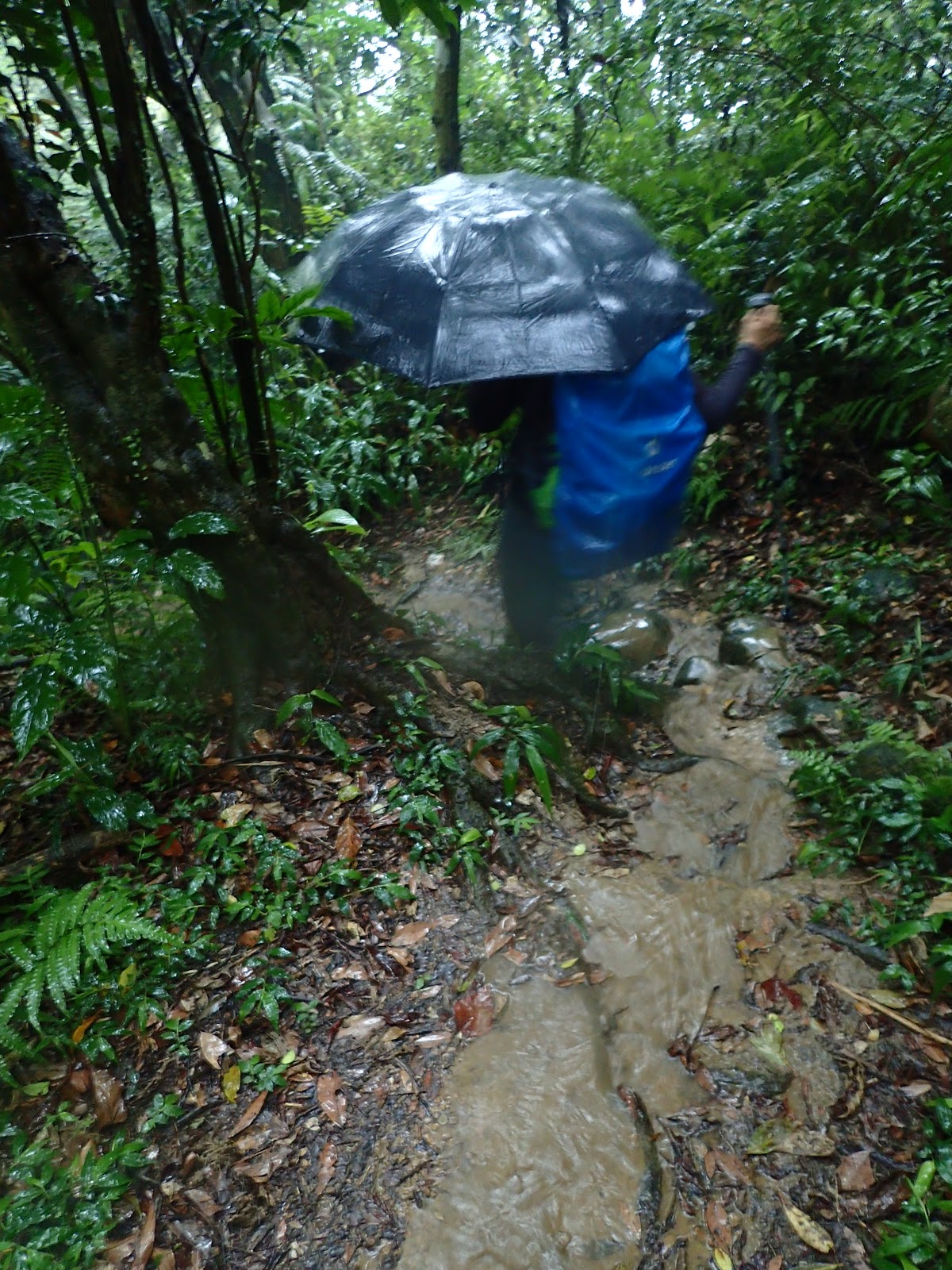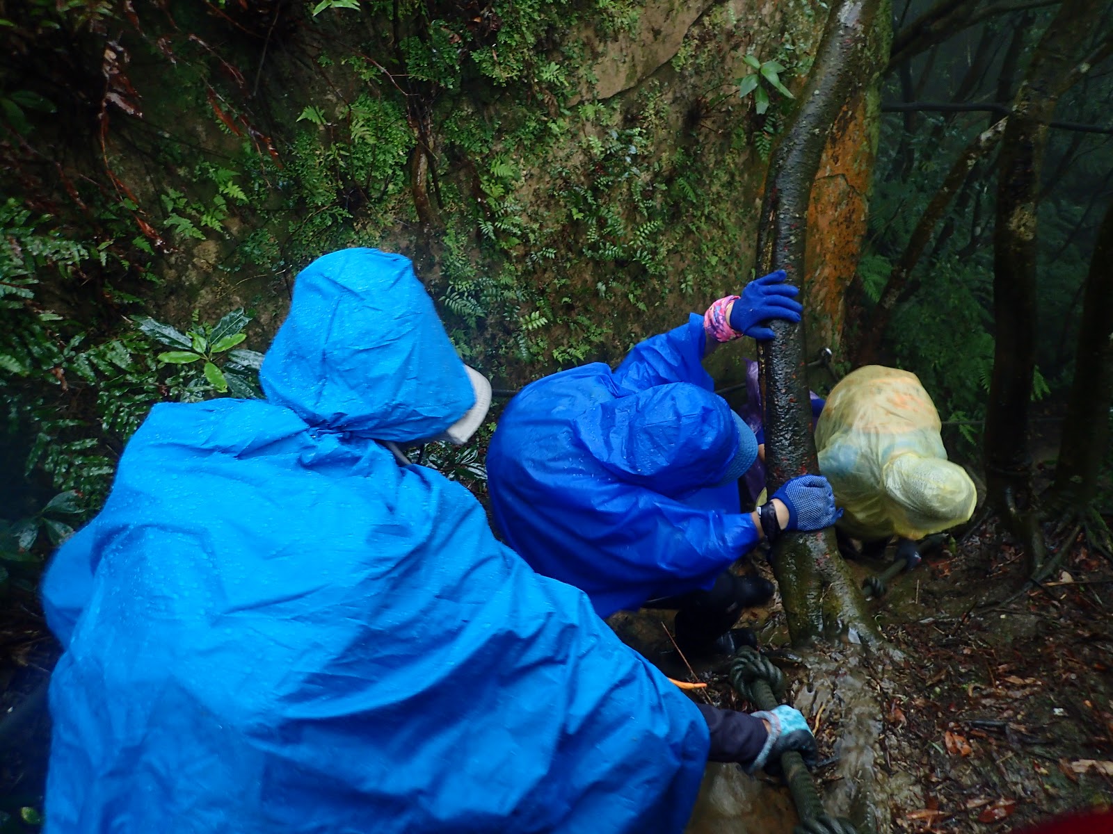 帶上手套, 雨衣穿好, 陡下垂直的峭壁, 積水直灌腦門, 好像在作spa般痛快