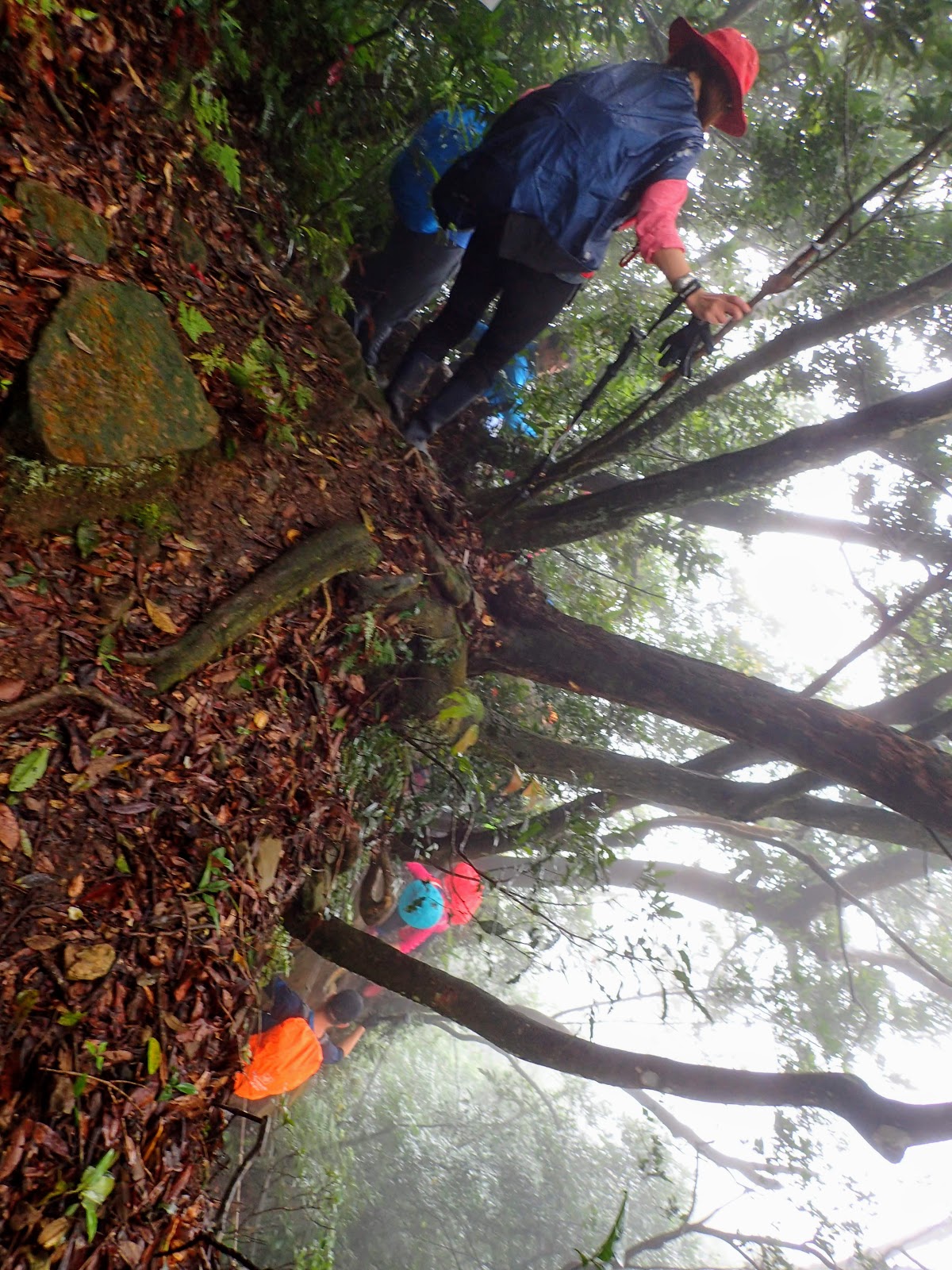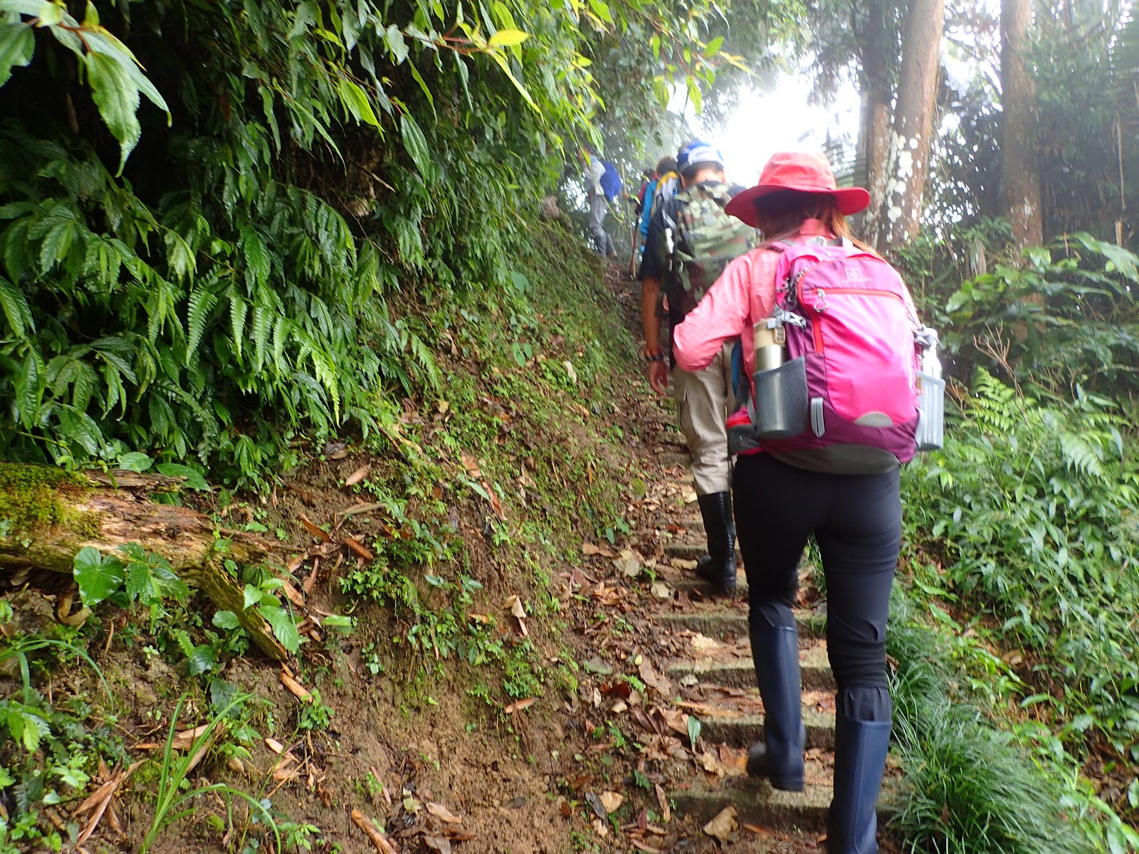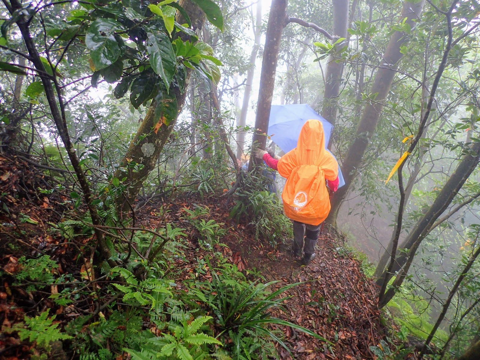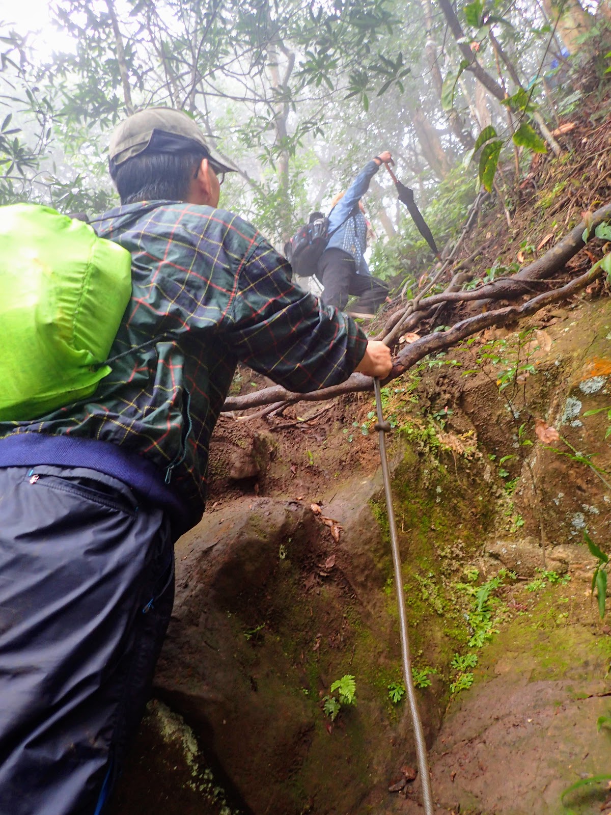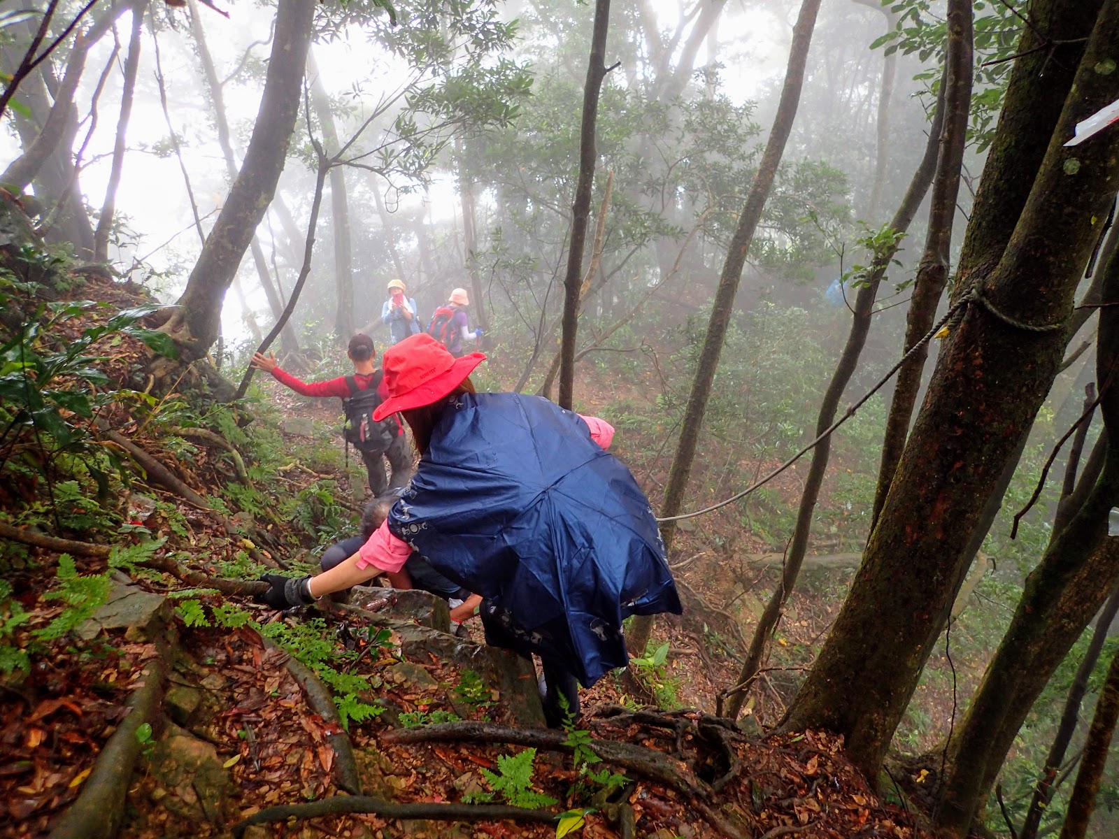 走在前頭的ㄚ姐說她都沒爬過山, 撐著雨傘穿著一般球鞋跟著翻山越嶺