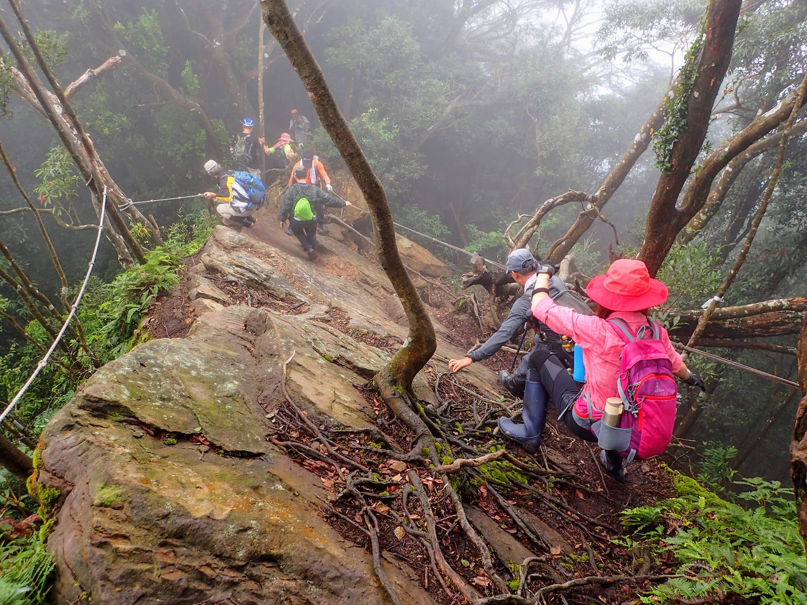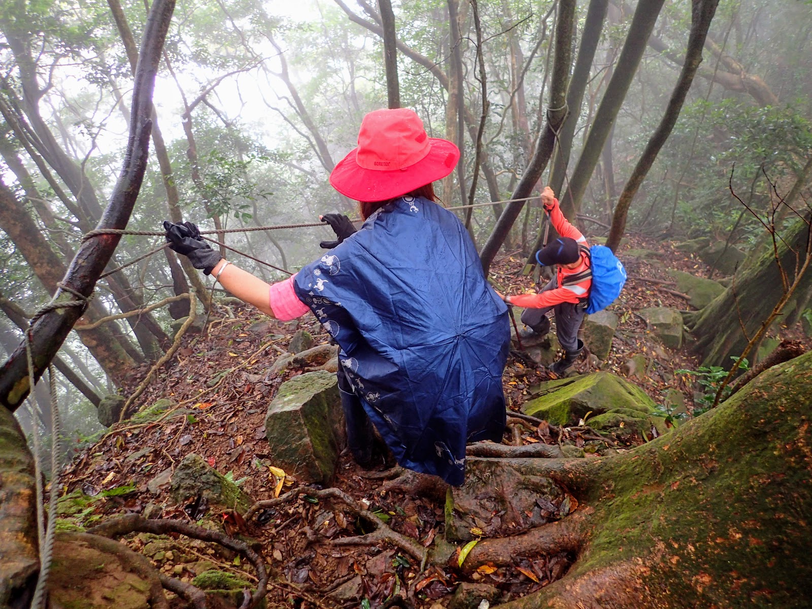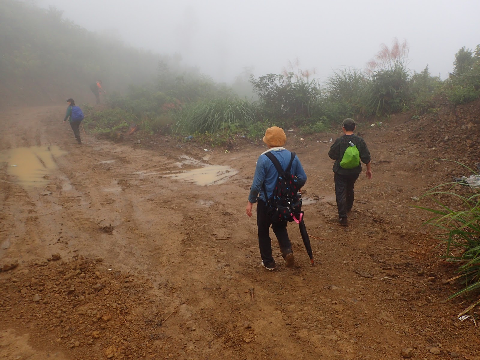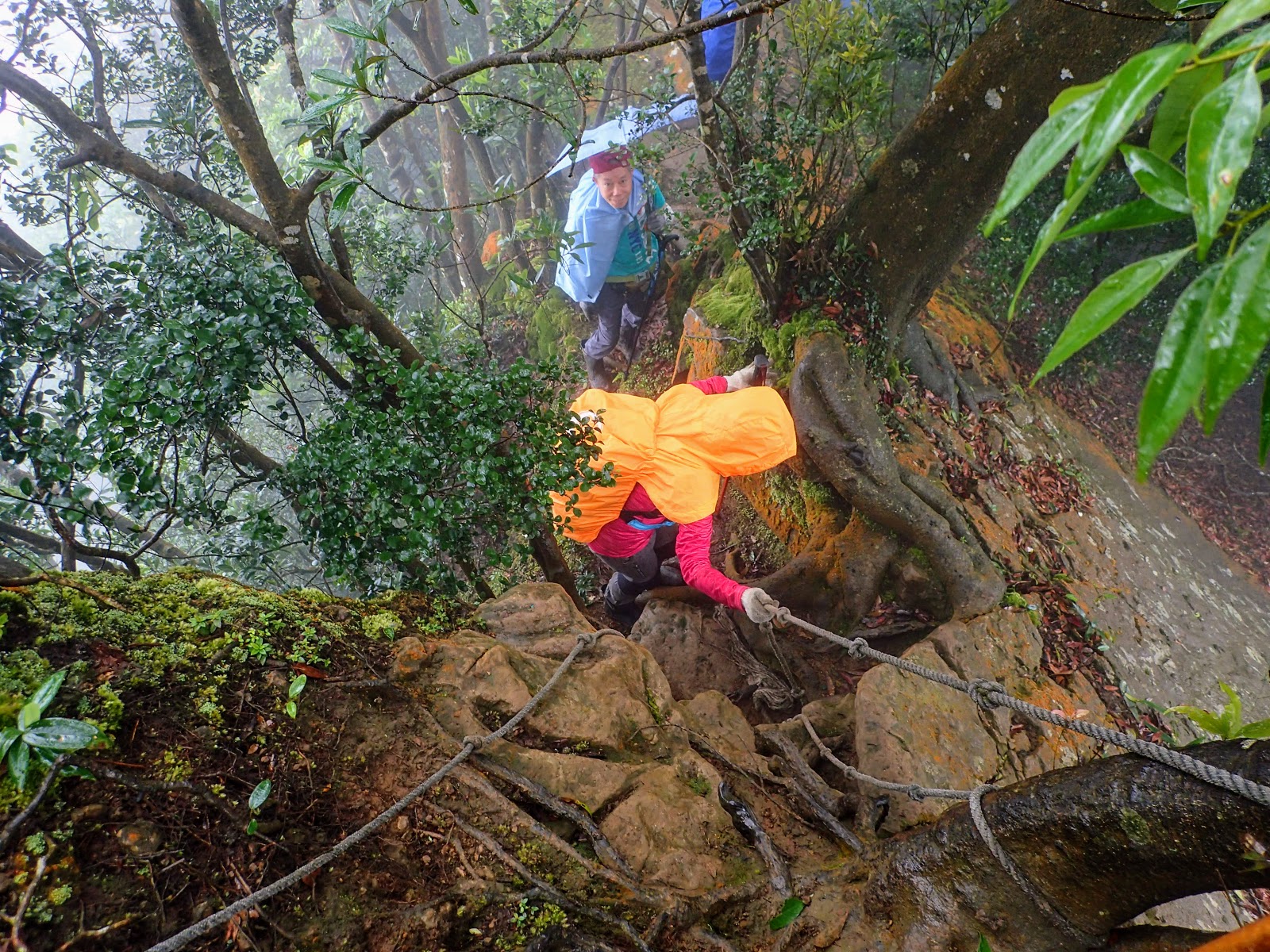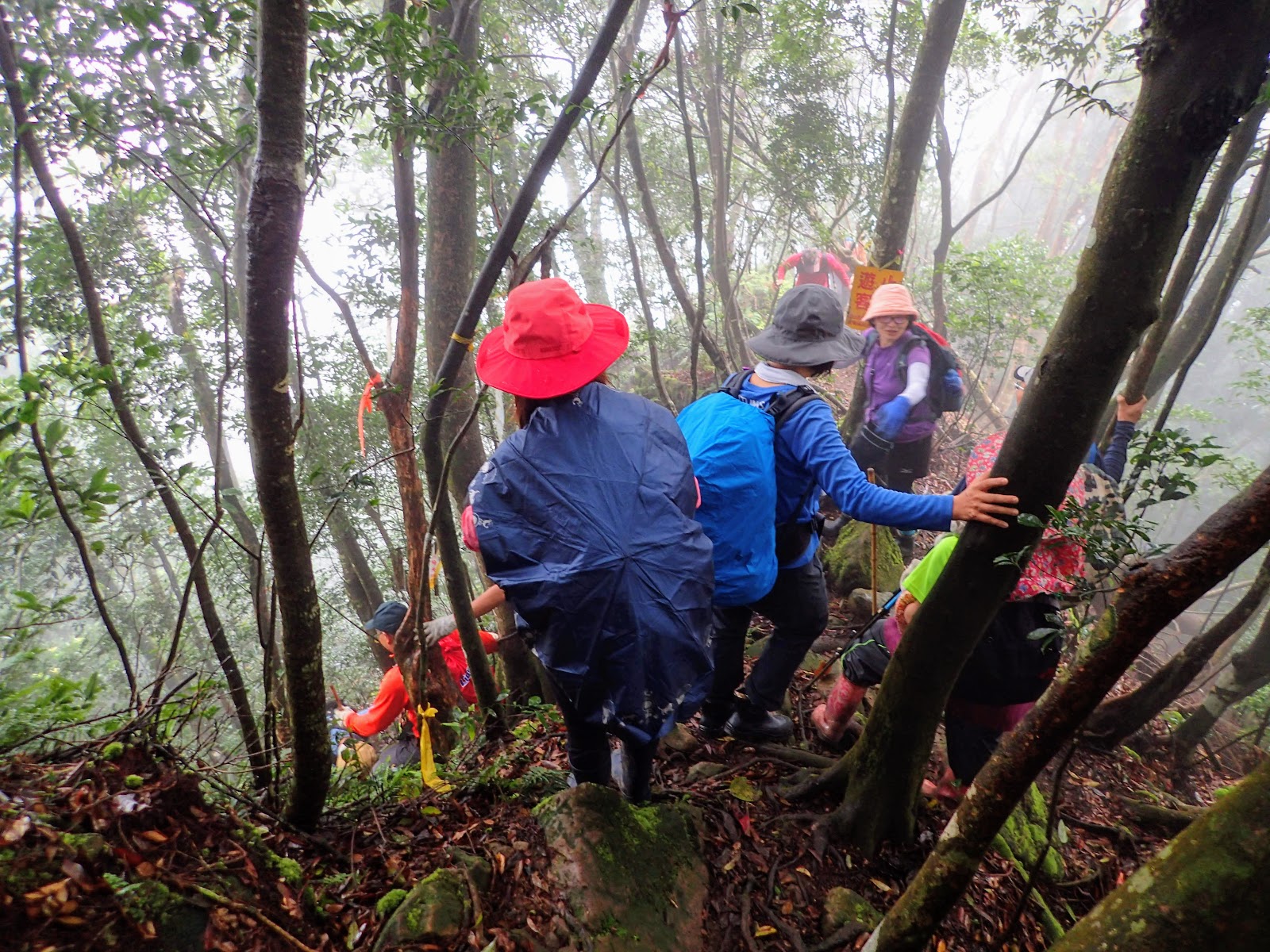 走在前頭的ㄚ姐說她都沒爬過山, 撐著雨傘穿著一般球鞋跟著翻山越嶺