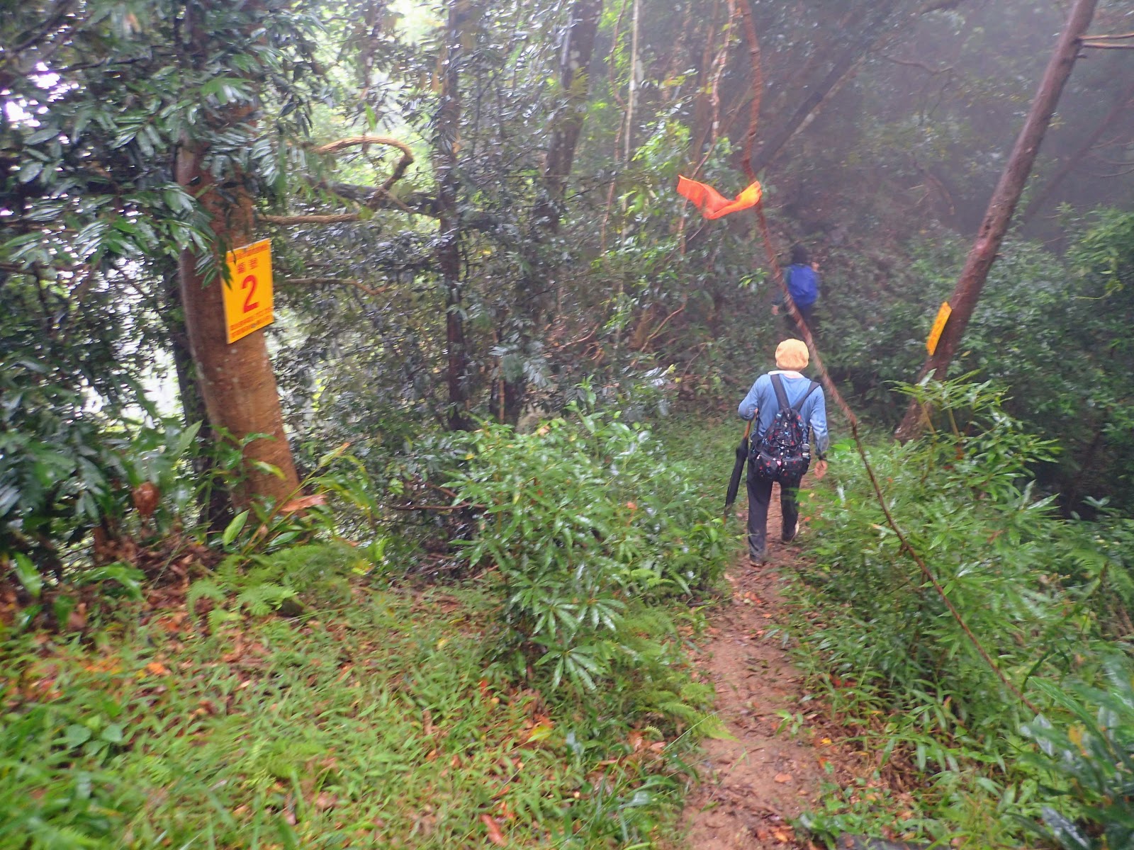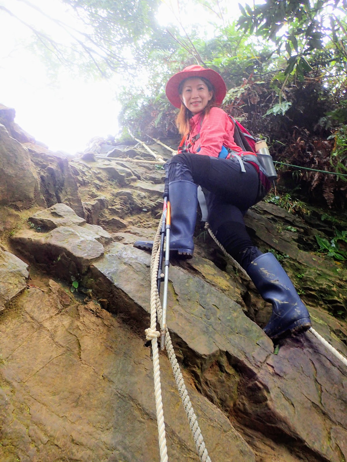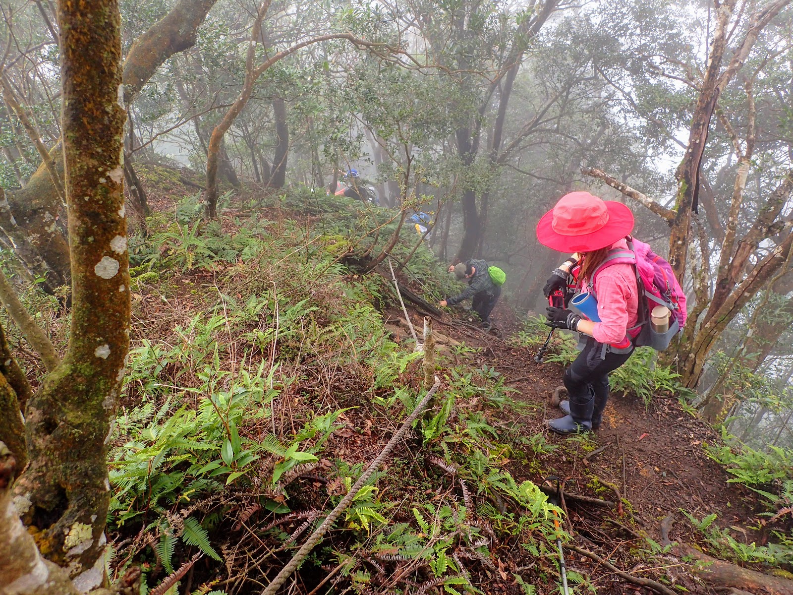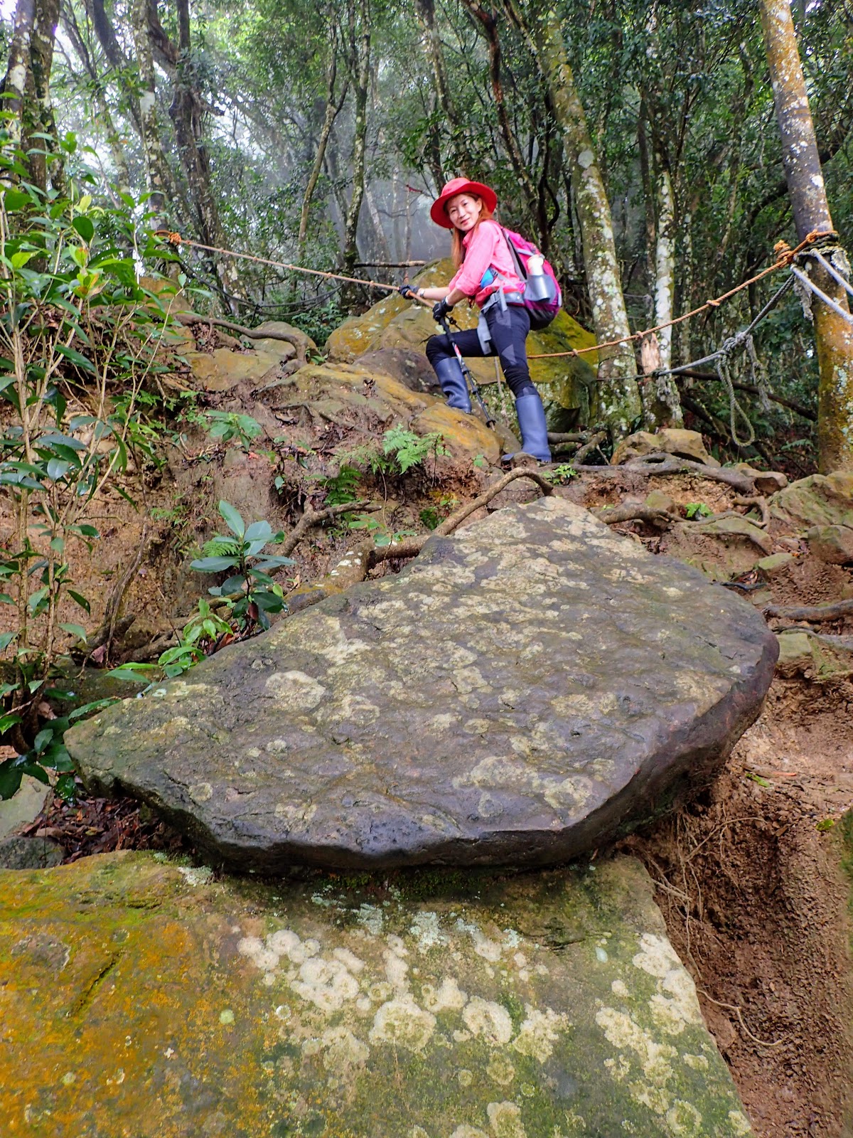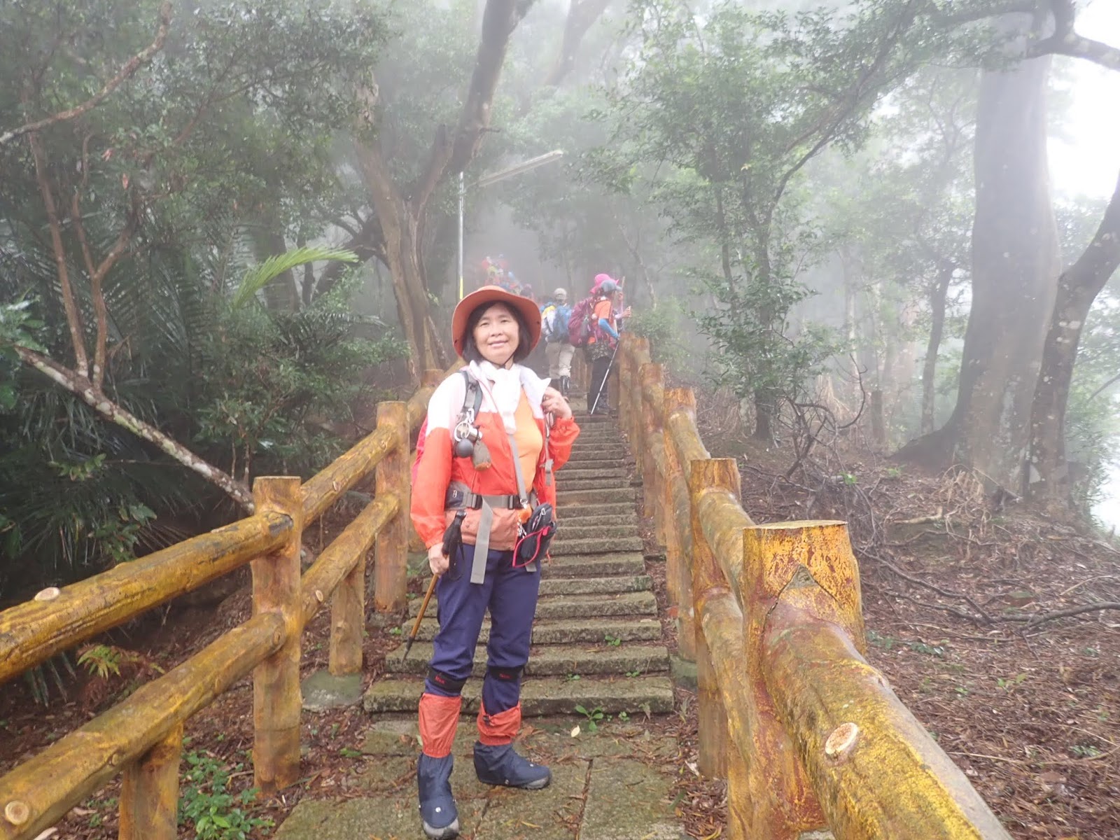 走在前頭的ㄚ姐說她都沒爬過山, 撐著雨傘穿著一般球鞋跟著翻山越嶺