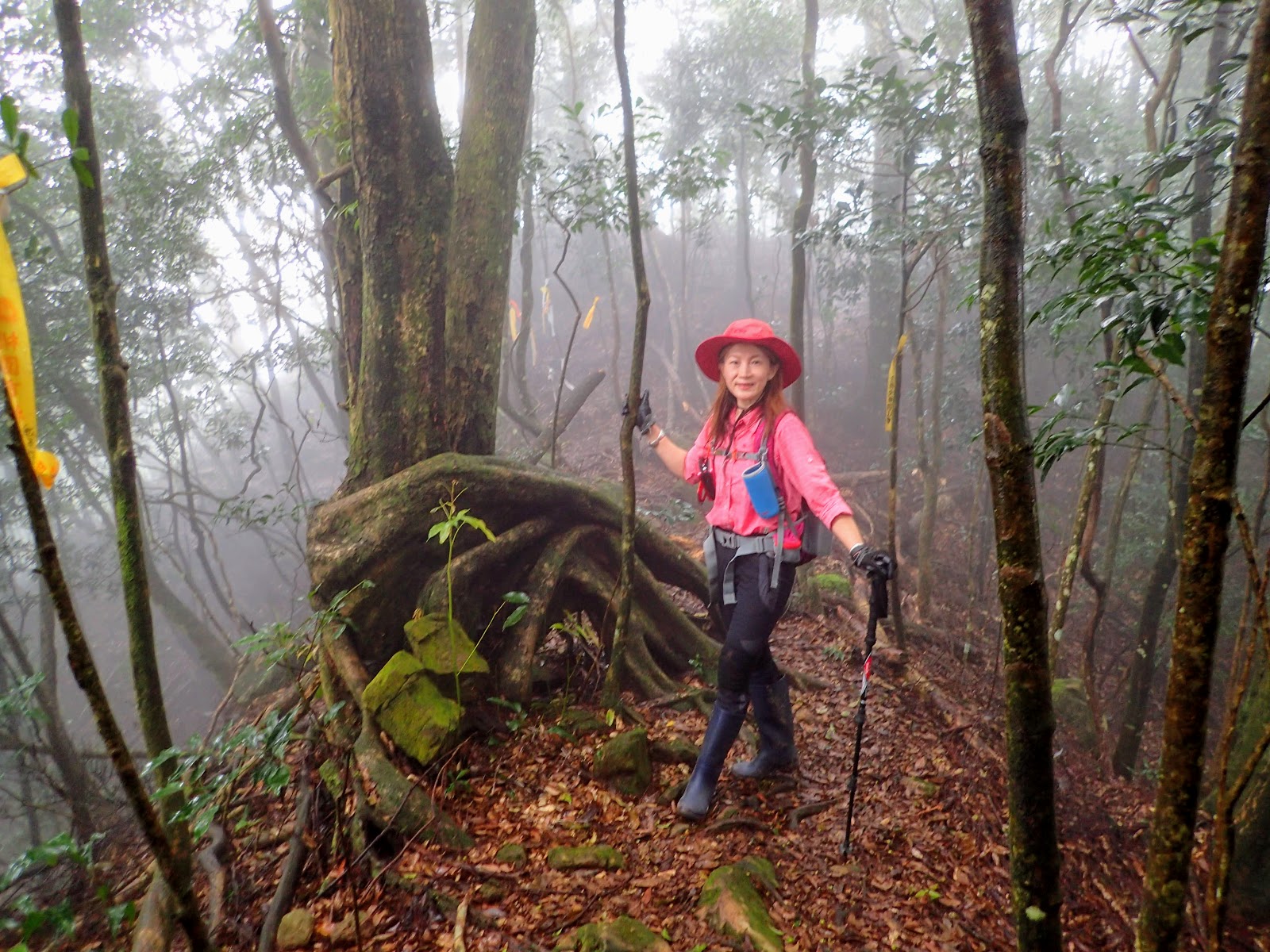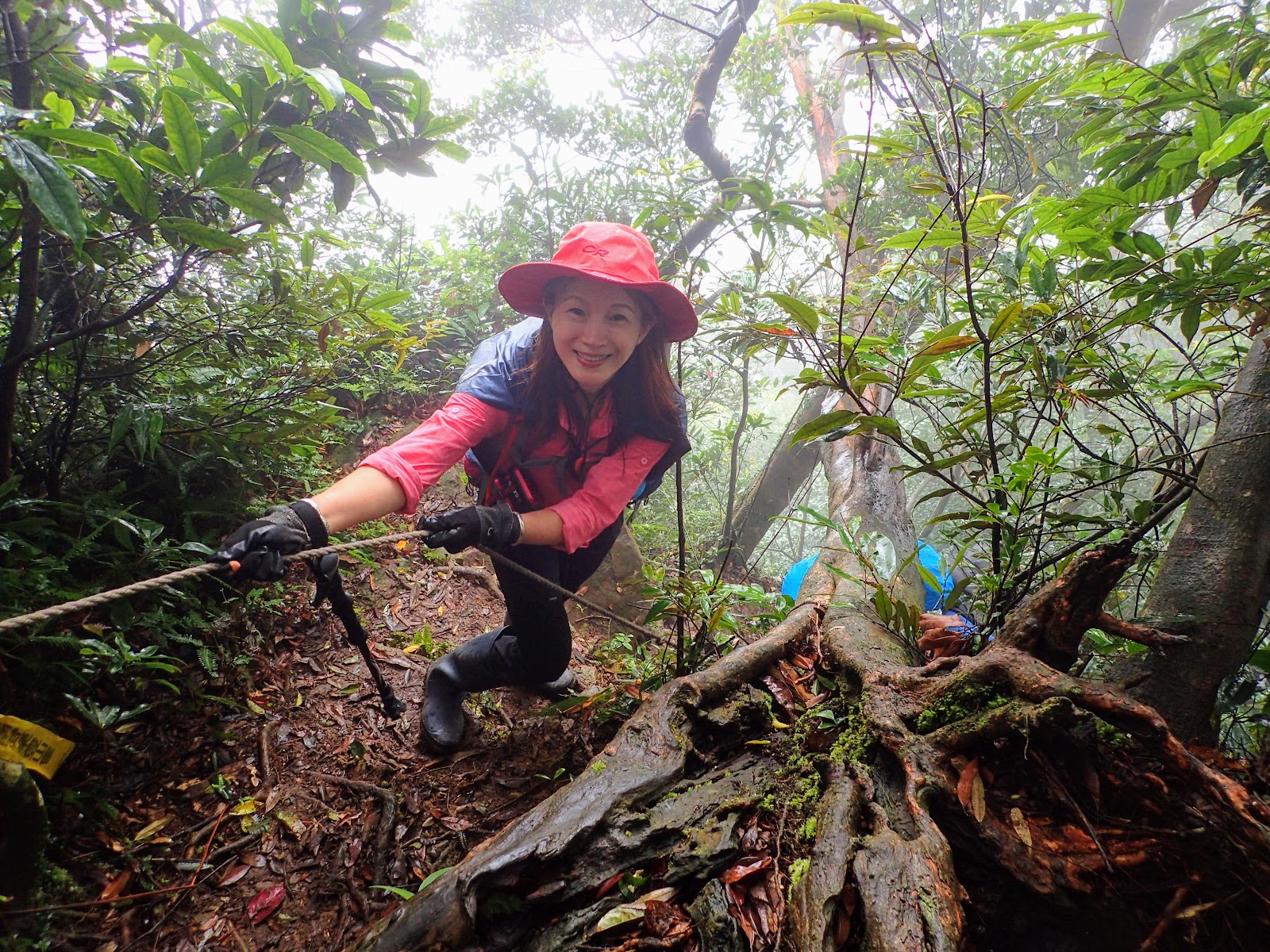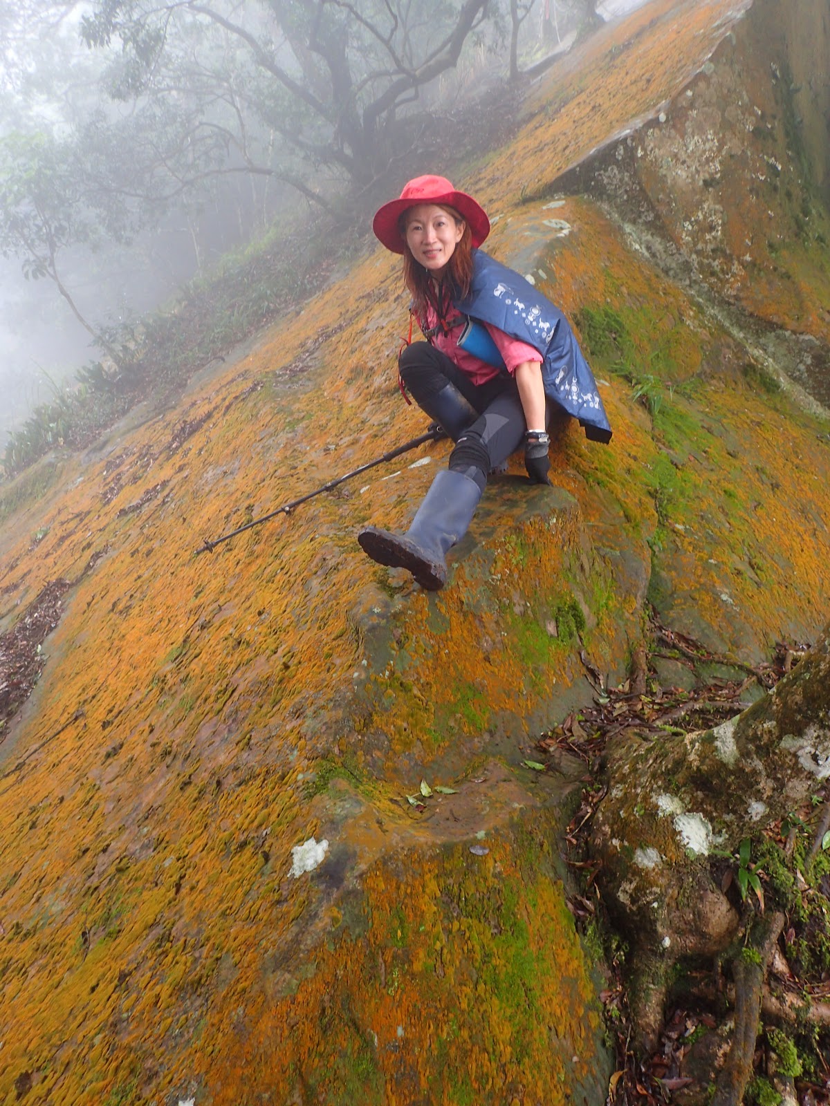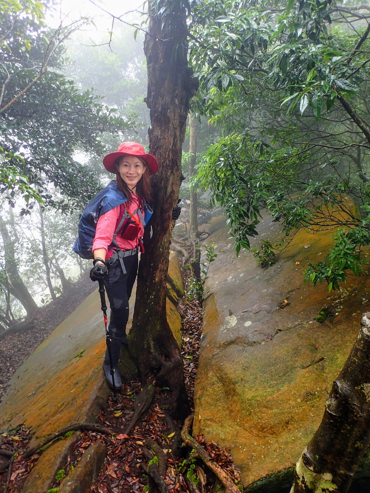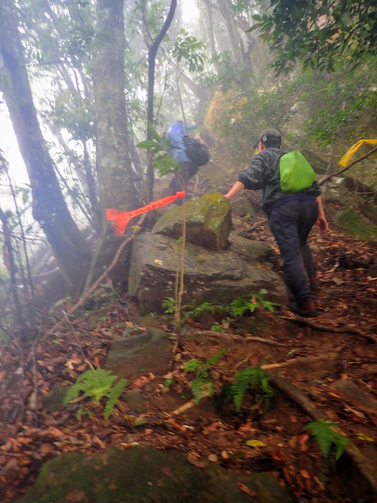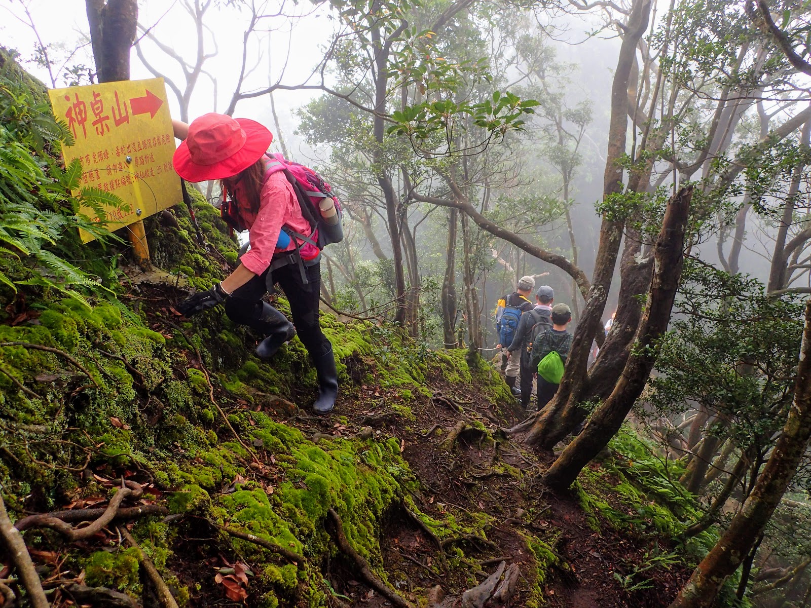 走在前頭的ㄚ姐說她都沒爬過山, 撐著雨傘穿著一般球鞋跟著翻山越嶺