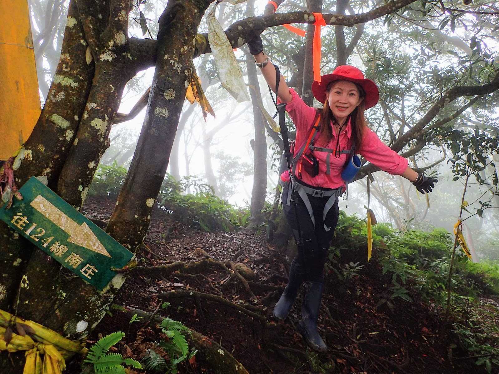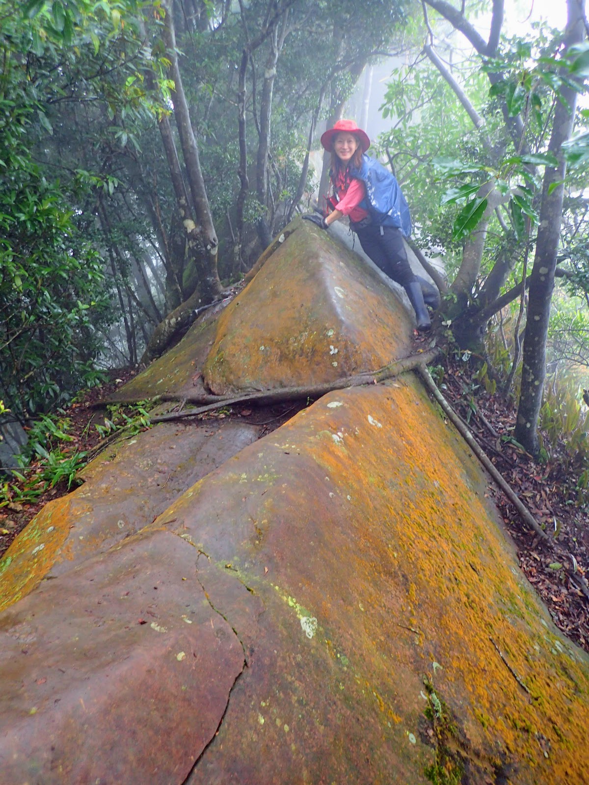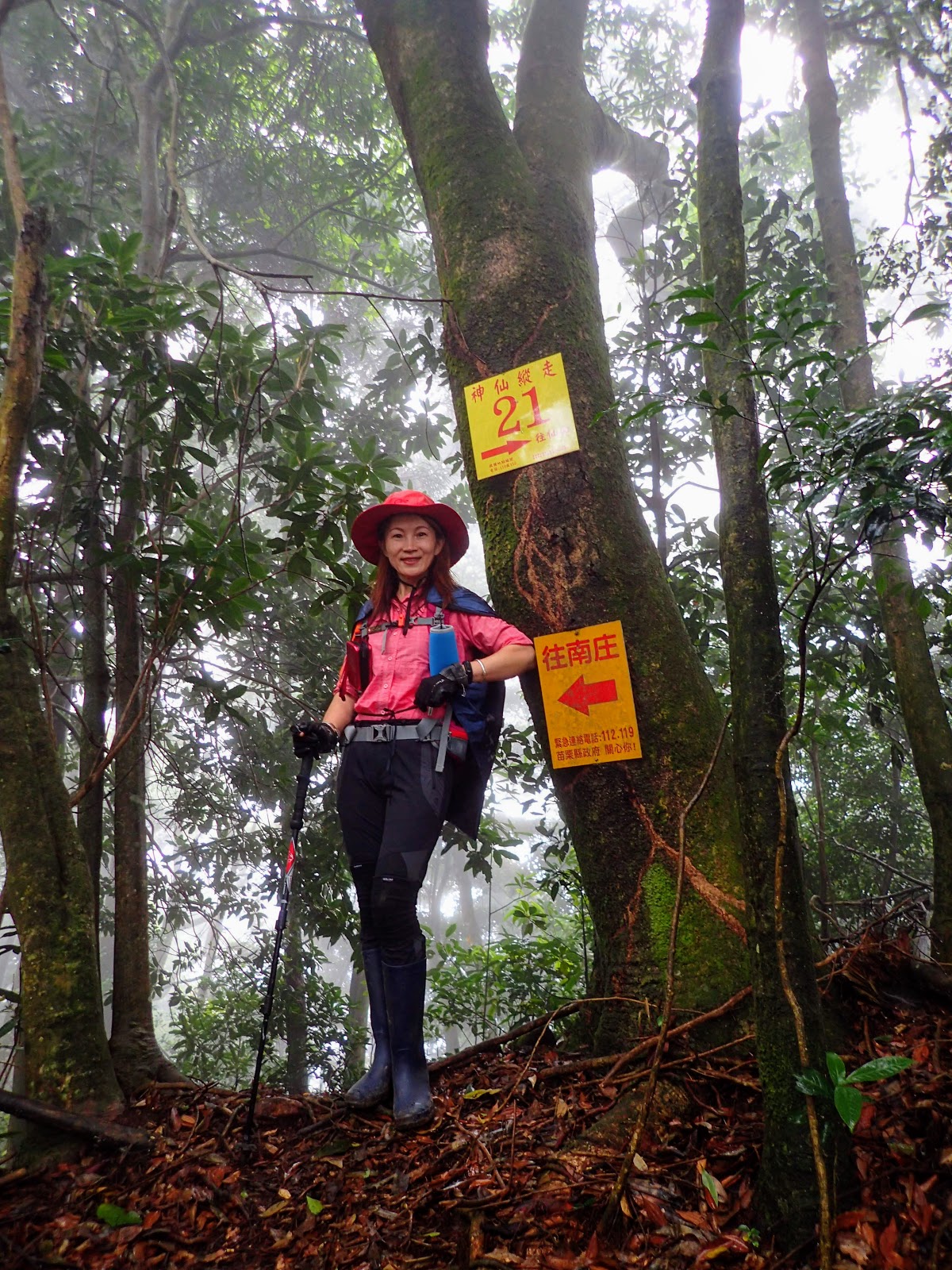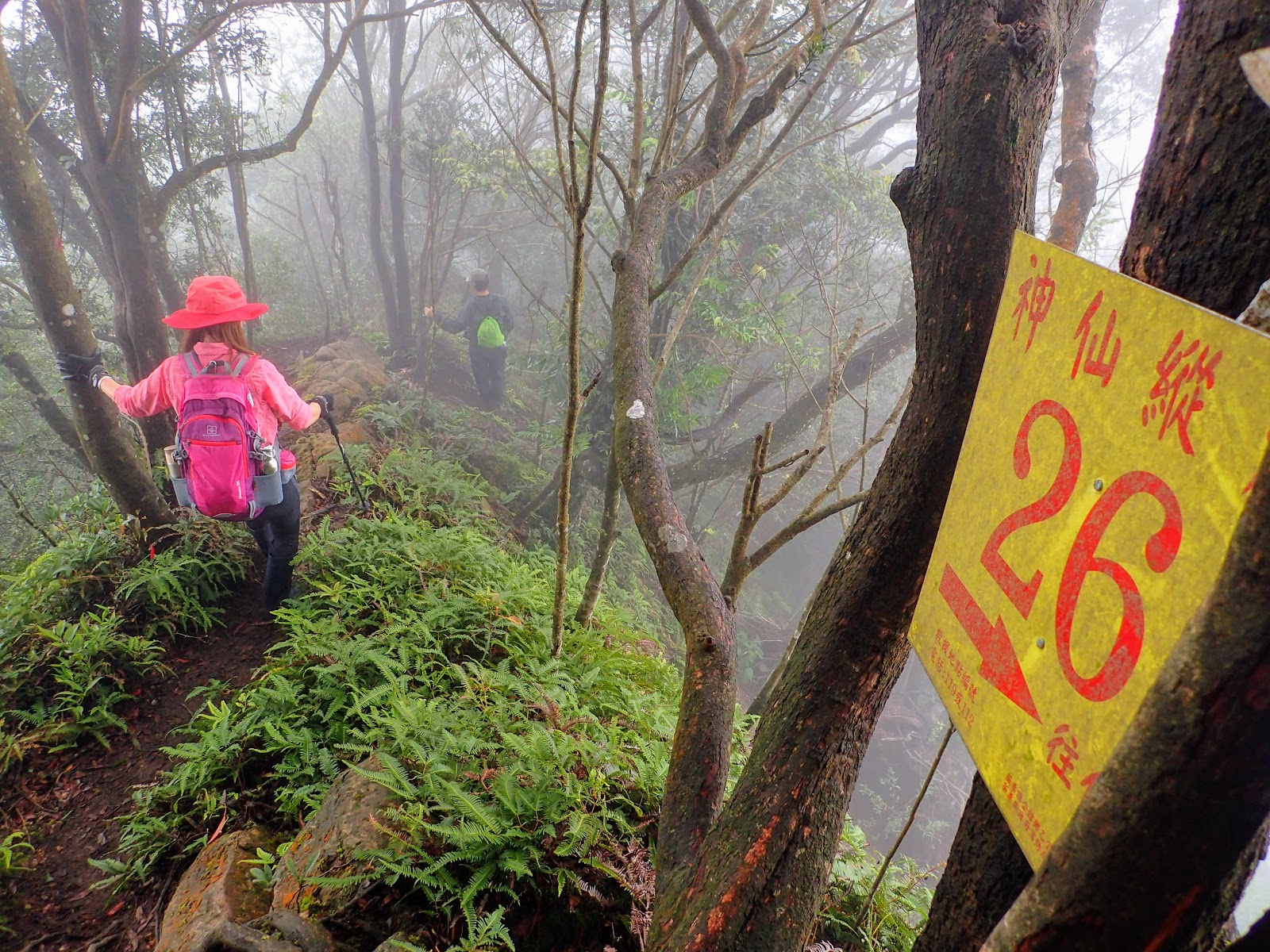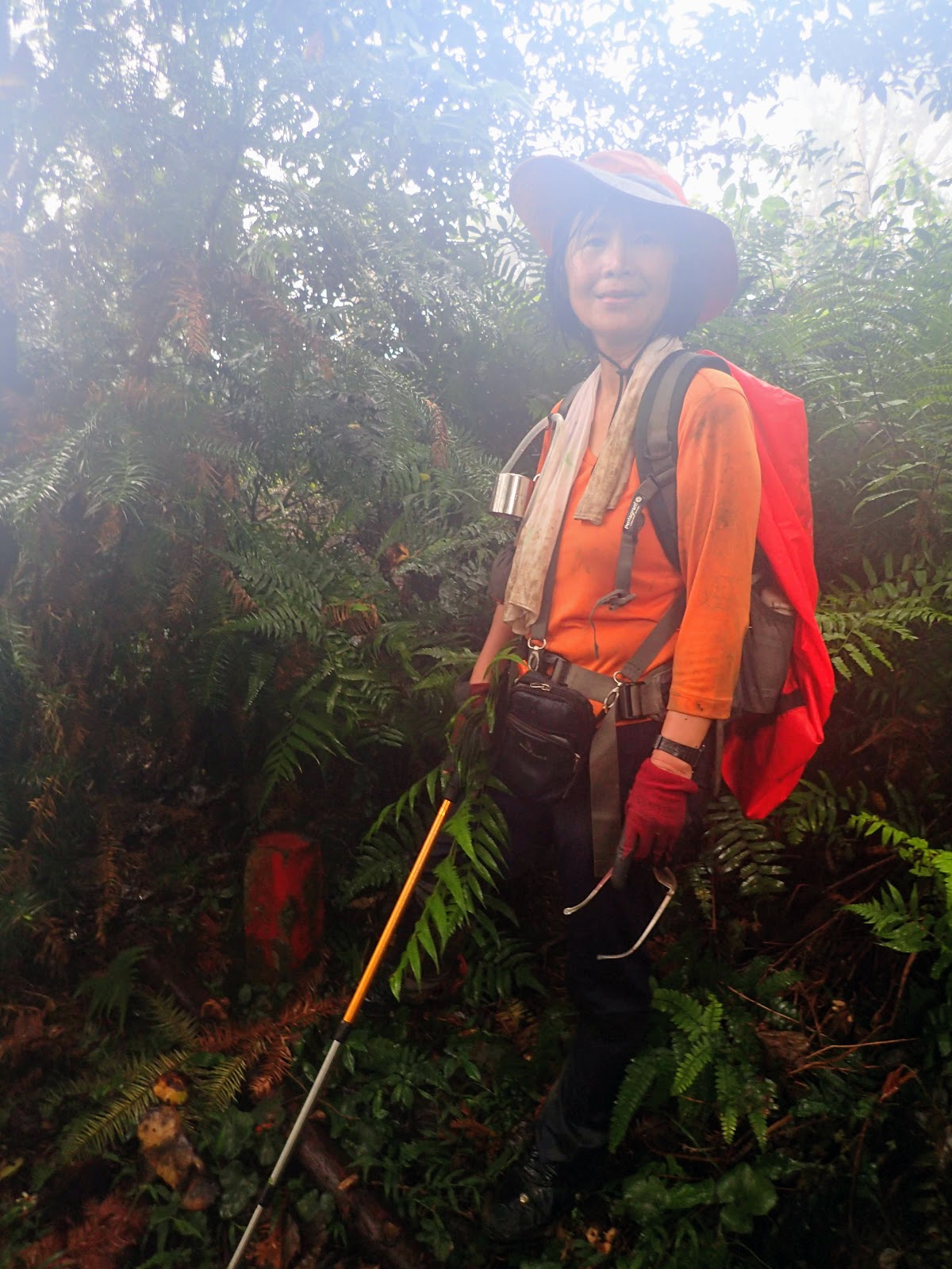 走在前頭的ㄚ姐說她都沒爬過山, 撐著雨傘穿著一般球鞋跟著翻山越嶺