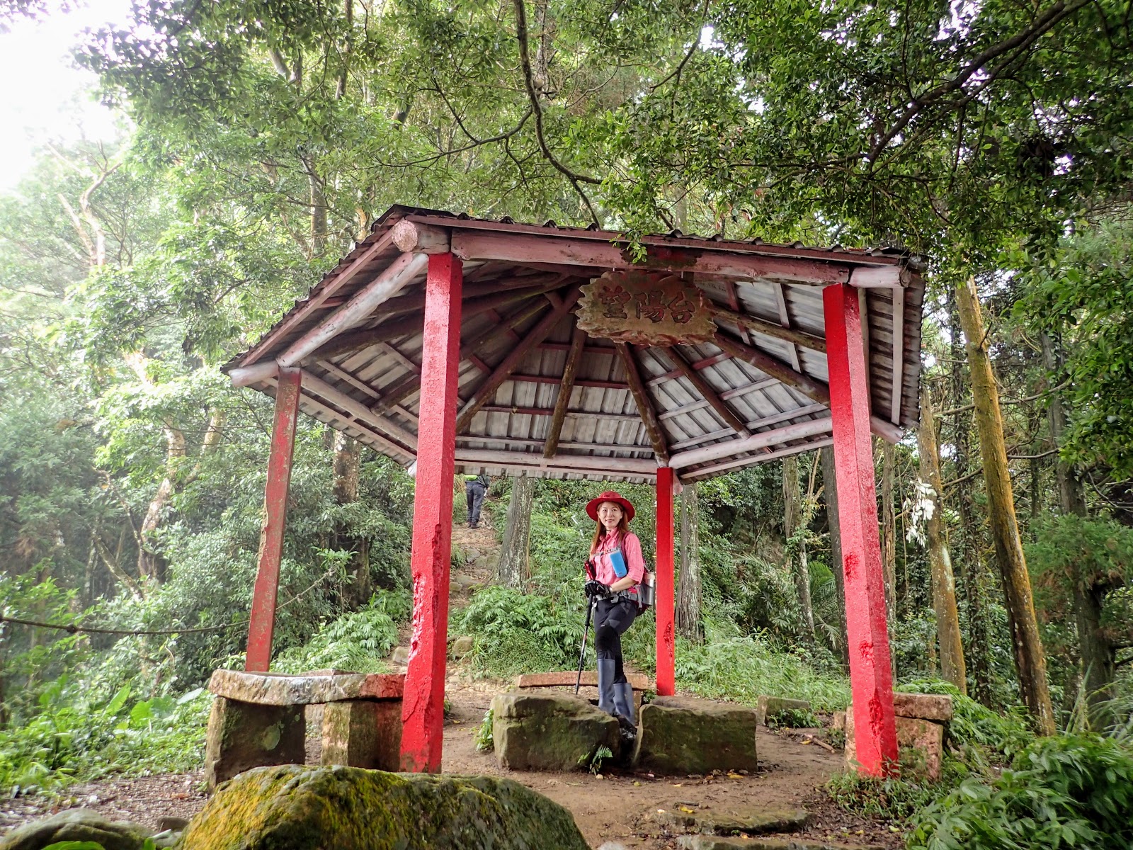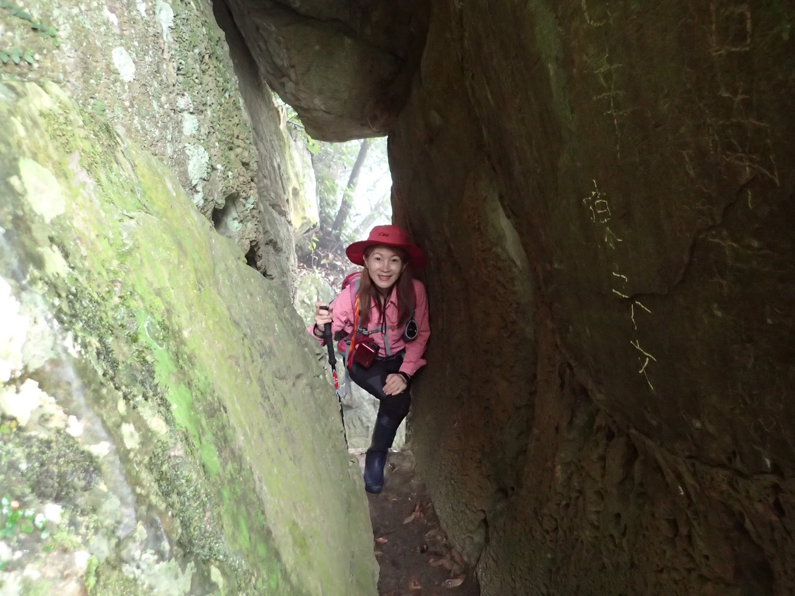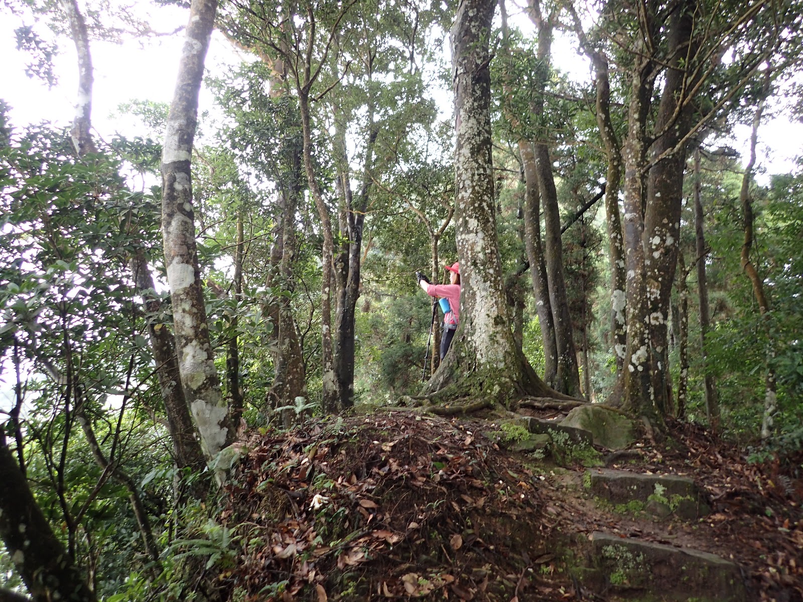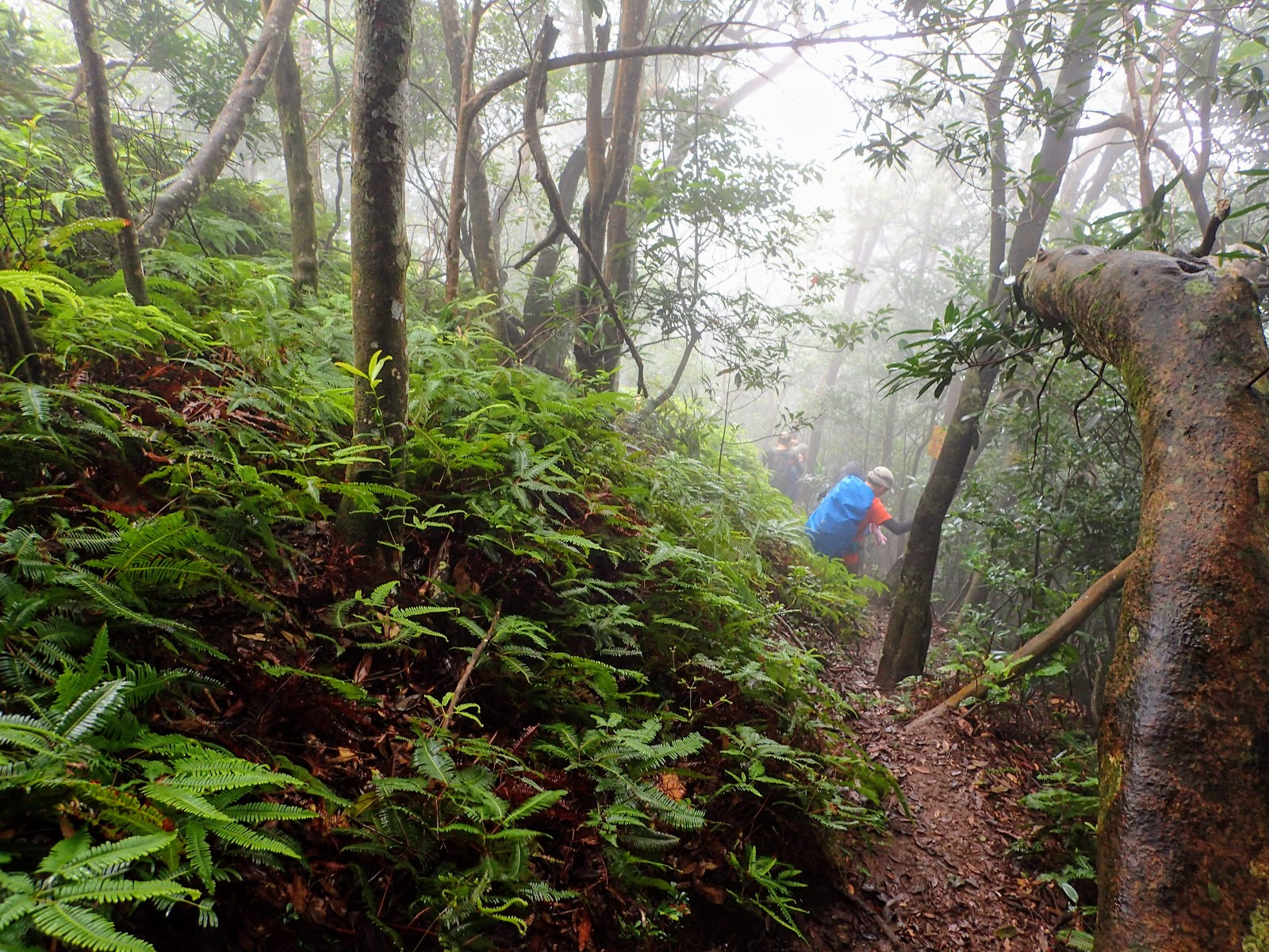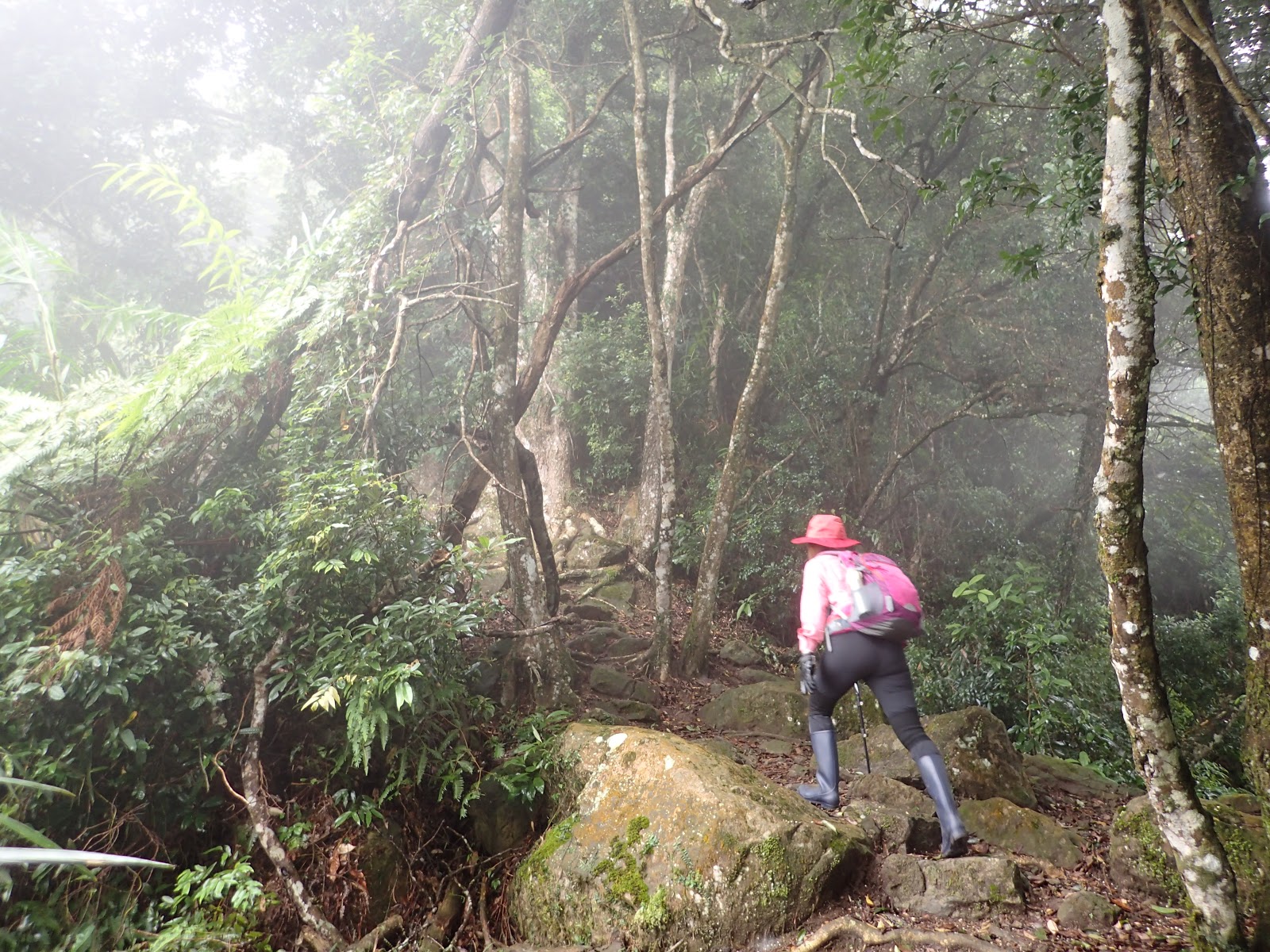 走在前頭的ㄚ姐說她都沒爬過山, 撐著雨傘穿著一般球鞋跟著翻山越嶺