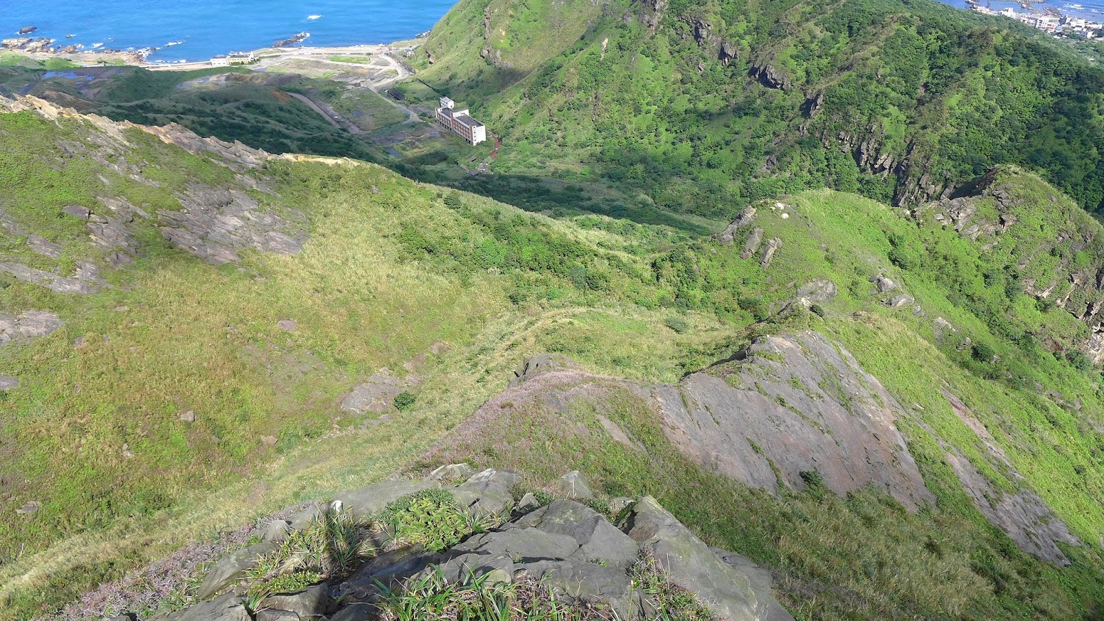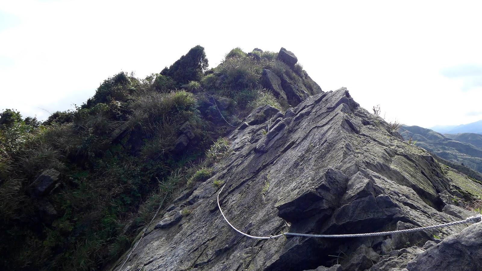 攀爬能力如果還不錯,大可直接就往上爬岩稜上去,並不難爬,觀察那條橫渡路及綁繩的方式,其實也沒多好走。