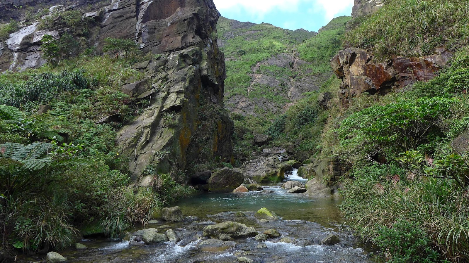 到溪邊又傷腦筋了,從稜線聽水聲就知道水很大,但實際一看水位,不管怎麼閃,一定都會遇到水深高過鞋筒的地方,更不要想在滑溜溜的石頭上跳石,保證摔一個媽媽認不出你是誰,大概花了快15分鐘才慢慢在大溪石間翻越到對岸。
