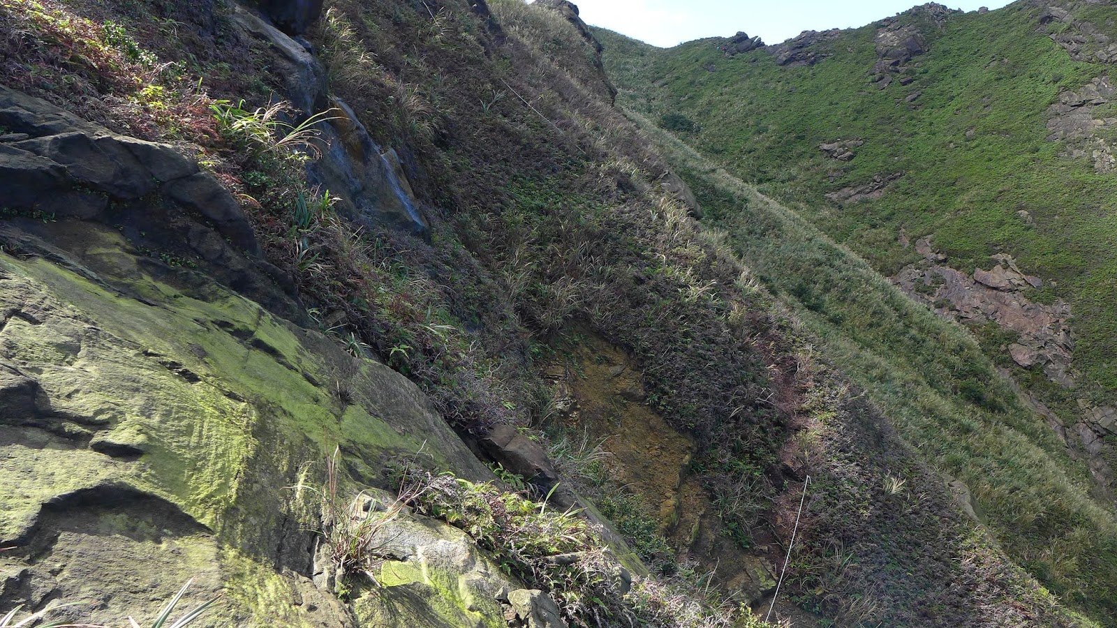 再來到V型缺口一路繩子真的是綁到底耶....還敲了岩釘,路徑基本是沿著山腰橫切,並不難走,之前有高落差處留條繩就罷了,現在牽一整路,無言........。