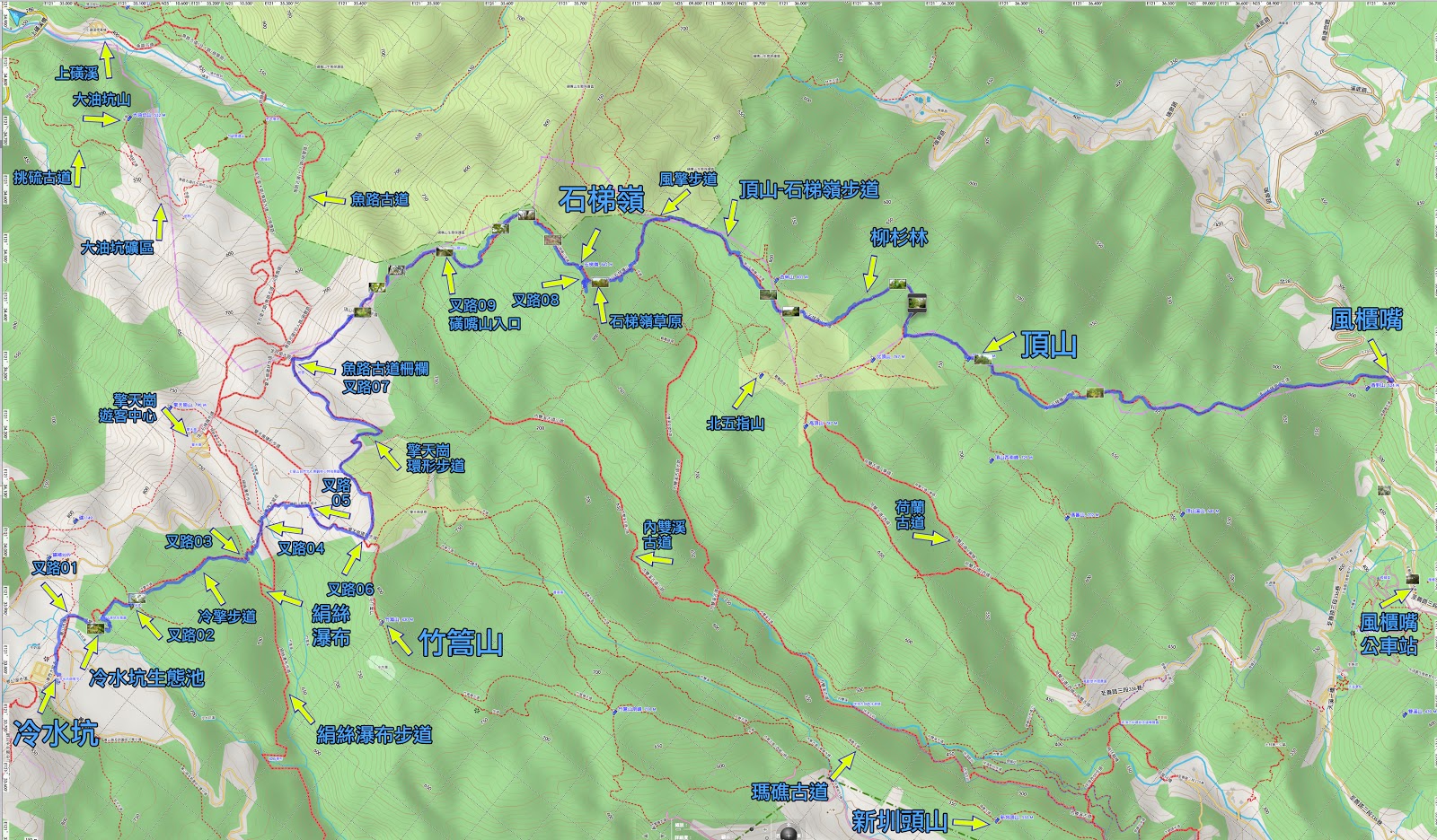 從「冷水坑」出發,經由「擎天崗」、【石梯嶺】、【頂山】,到達「風櫃嘴」。