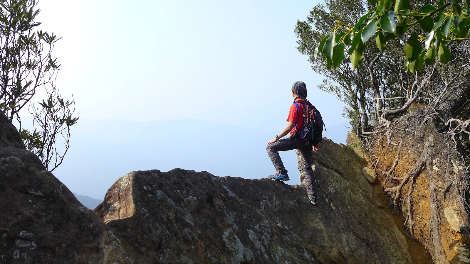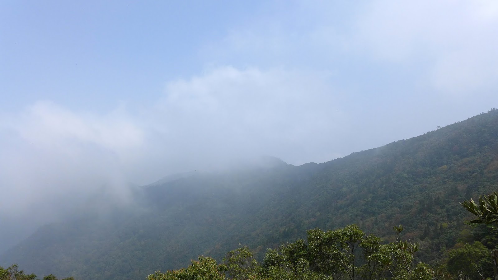 上爬中唯一展望,看樣子今天等不到霧霾降下來,而雲霧也上來了