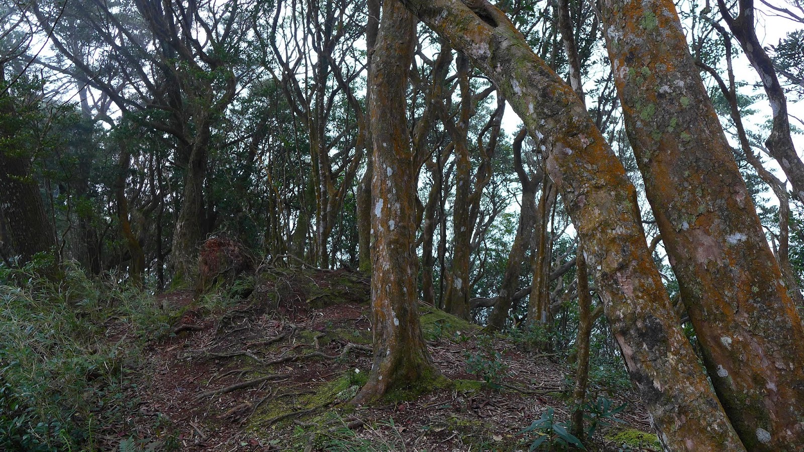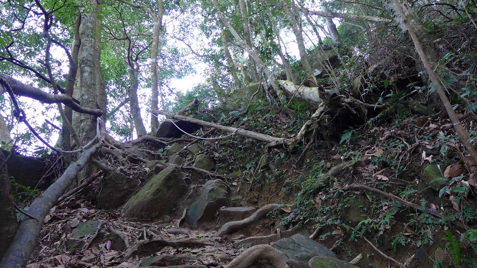 從再次轉入林道開始路徑明顯潮濕,尤其是過溪後開始上坡,不但有夠陡又濕滑,要花上更多力氣站穩腳步,距離不長卻要爬升500多,從溪谷開始完全是一路陡到稜線,狂風嶺還真沒對不起這名稱,真的有夠狂。