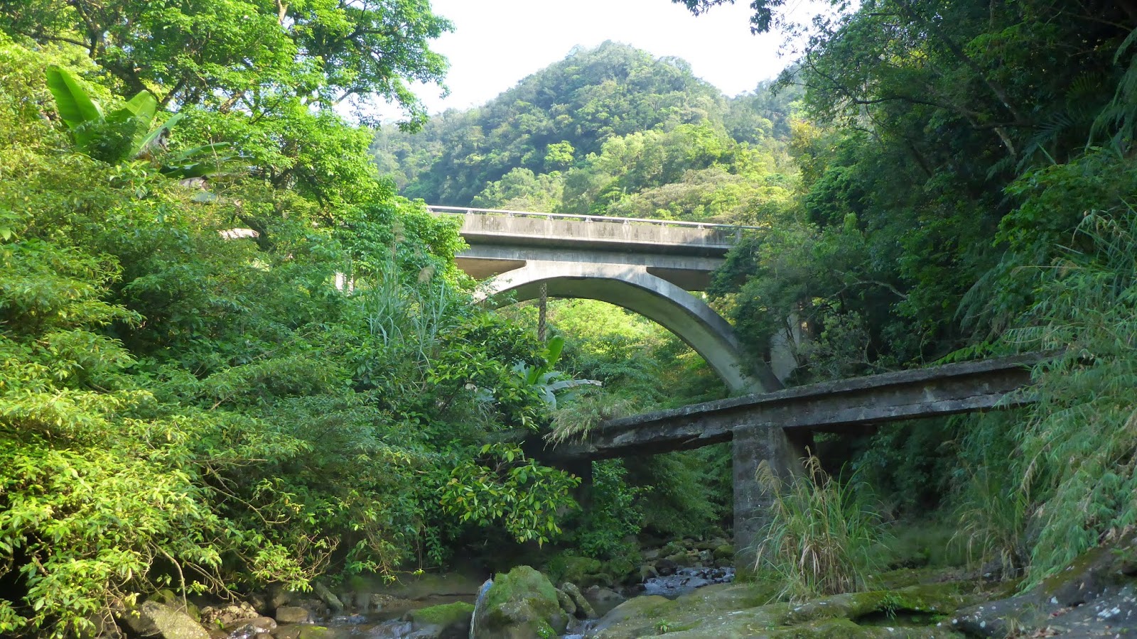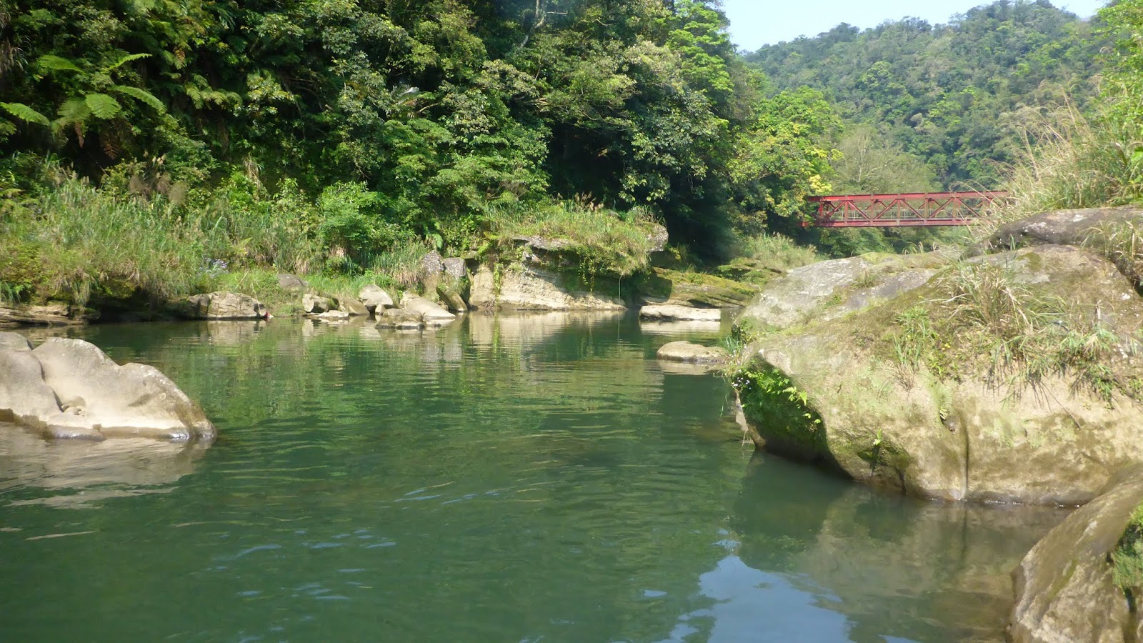 看到紅色鐵橋,大華車站就在右岸上,接下來一樣就是遇潭游,能走岸邊就走岸邊,目光終於撇到十分瀑布的一點點瀑簾。