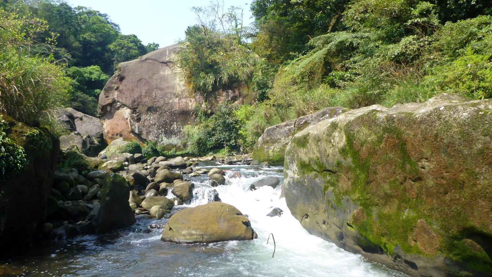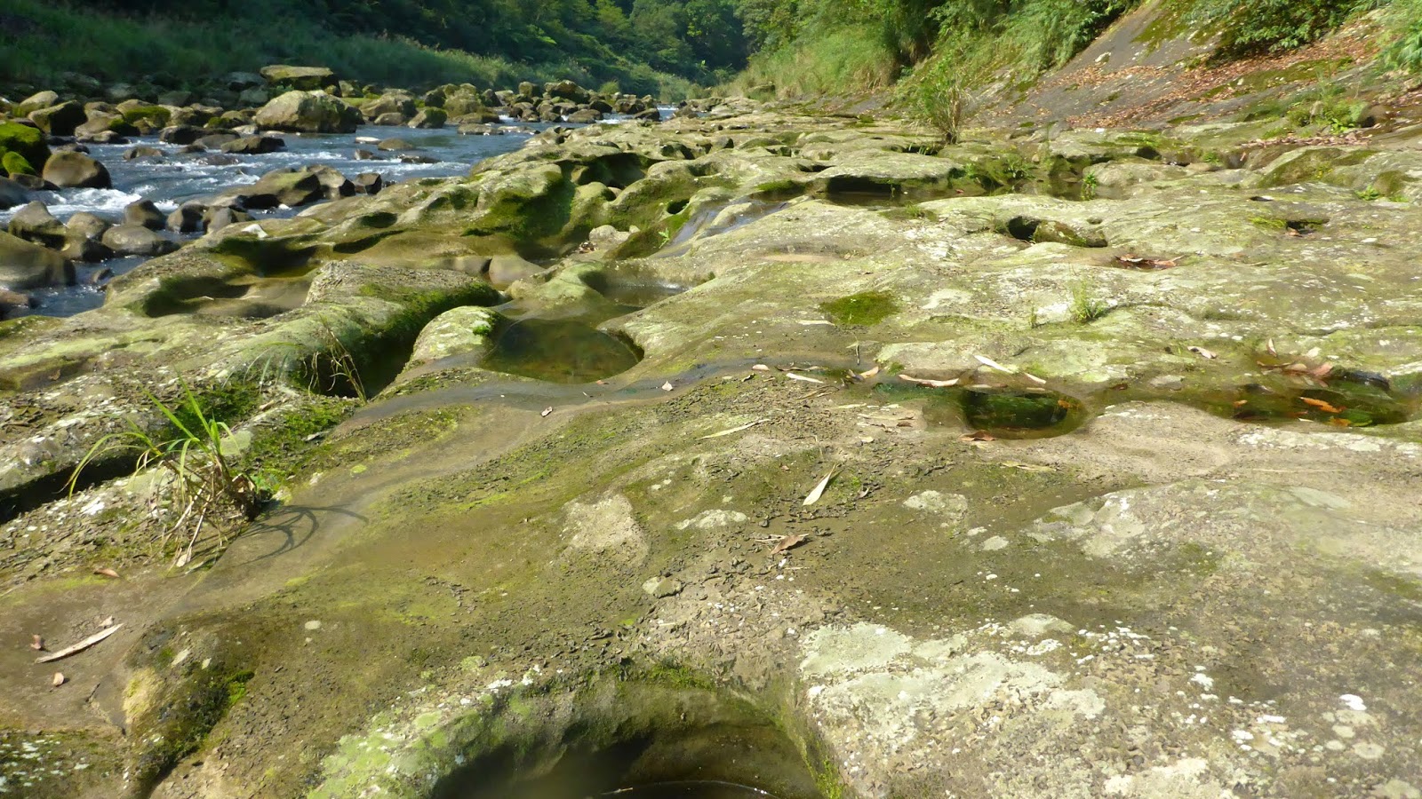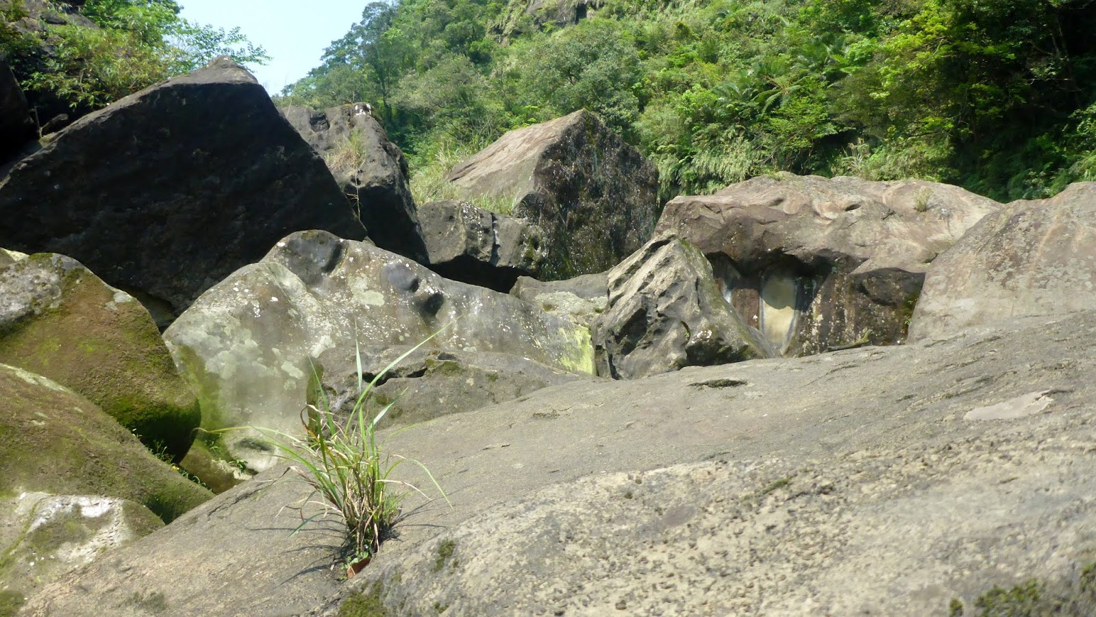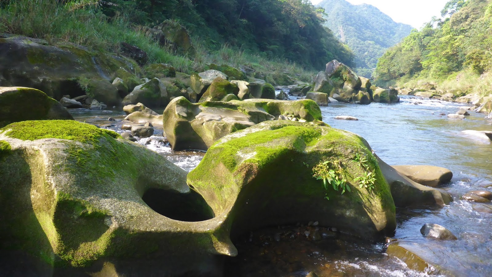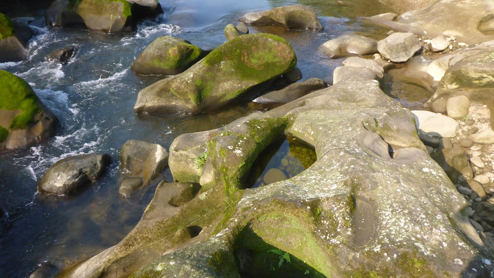 一到河床就是大華壺穴群,從這到幼坑一帶滿怖河床,一堆大大小小圓弧的坑洞,就是壺穴,岩層硬度不均的河床經年累月的沖刷侵蝕所形成。