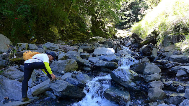 休息完前往最後水源地馬上先遇到一處大崩塌地,地鬆軟易滑動,爬上去後沿路徑到最後水源,真正的陡爬現在才要開始。