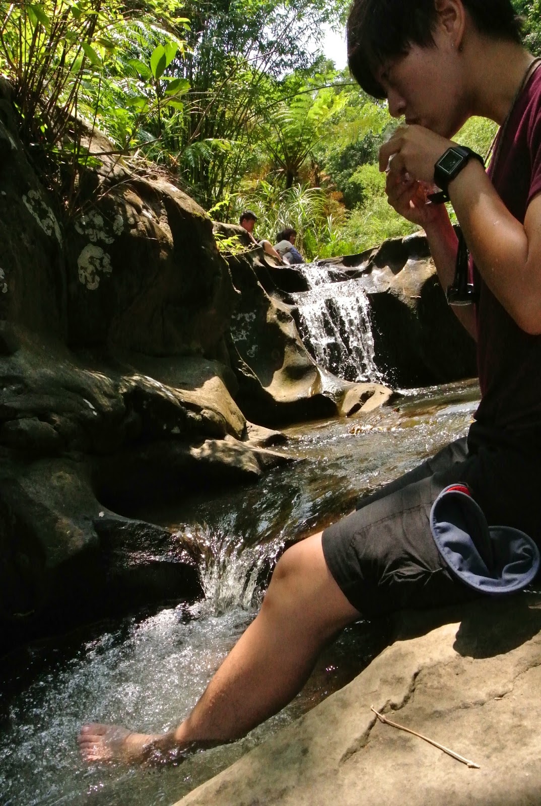 枇杷洞瀑布上方,也就是三貂嶺瀑布群步道接近終點的地方,有一塊小平台,不知道是不是當天水量還沒有太多,剛好有很多地方可以坐著休息,吃午餐,搭配著樹蔭,還可以泡涼涼的腳,超舒服得。