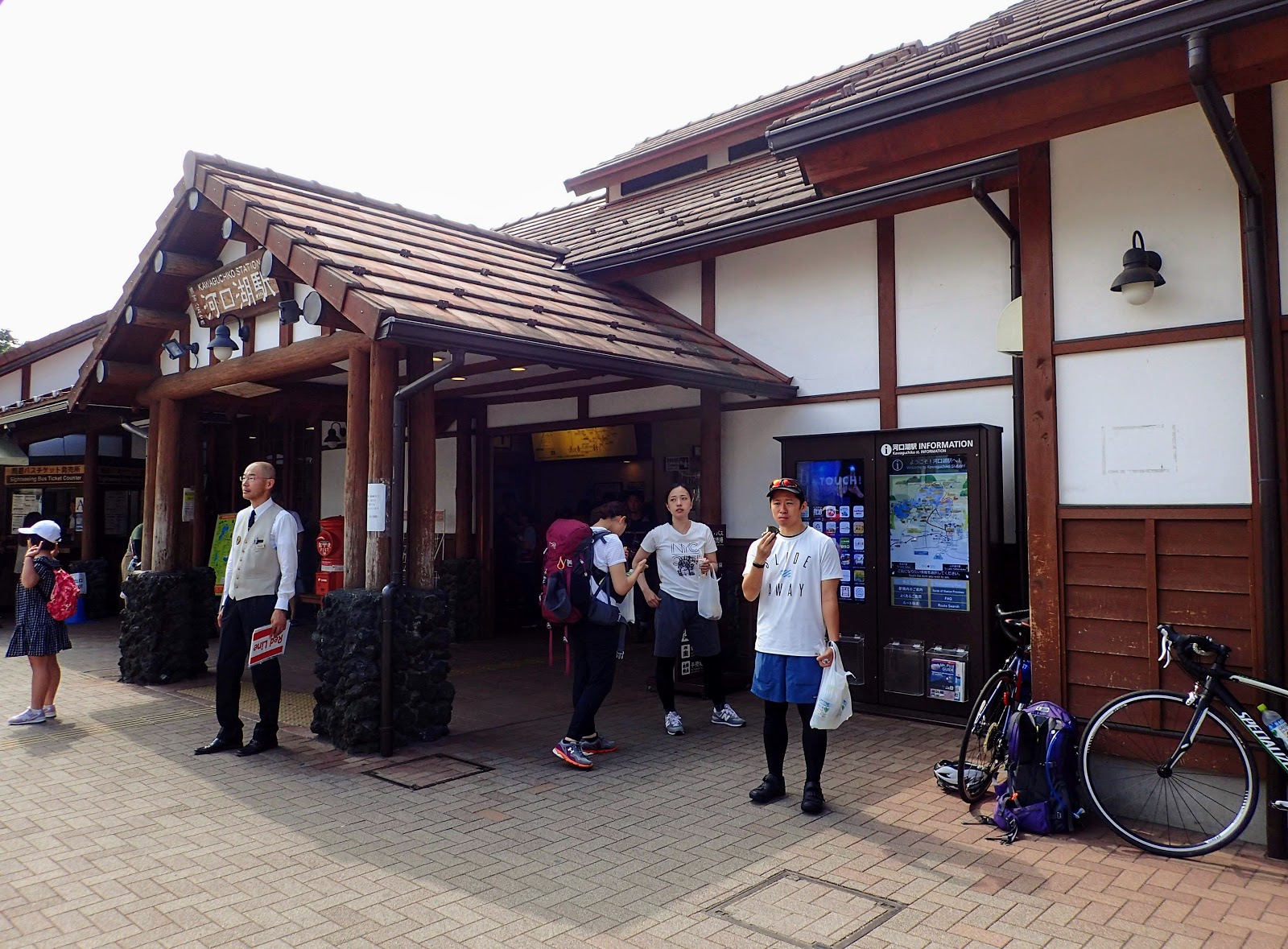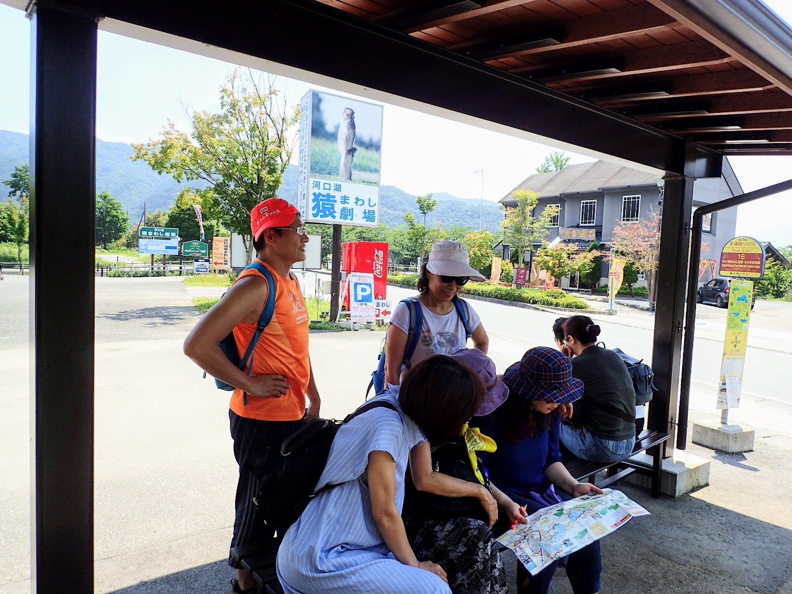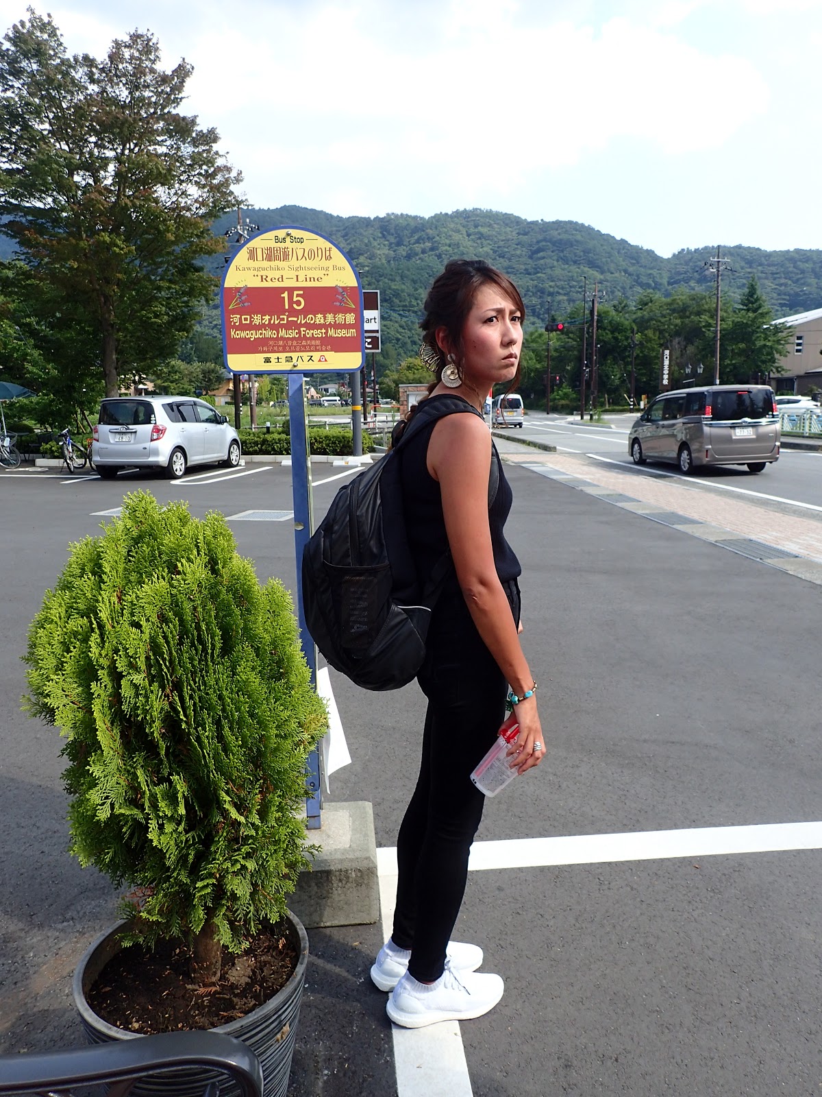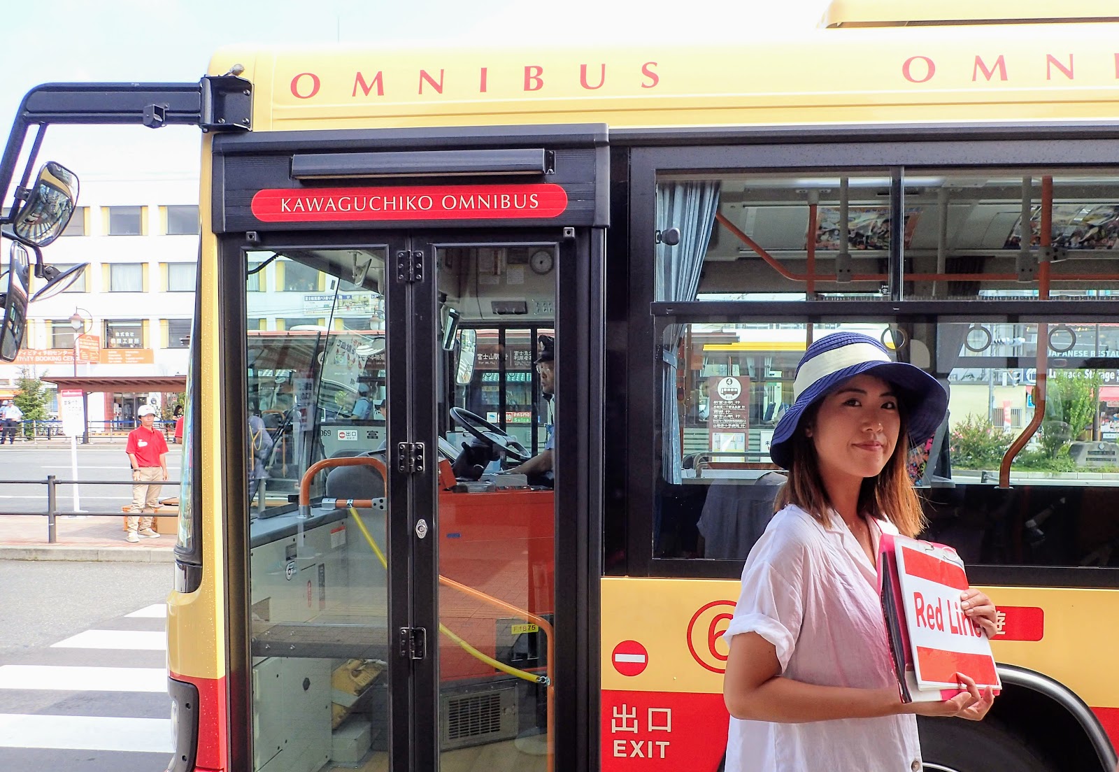 站牌旁的地上用顏色還有拉繩區分, 並有專人維護秩序, 計劃先走河口湖紅線, 沿著河口湖沿途景點遊玩, 經香草館, 纜車, 河口湖遊覽船, 河口湖美術館, 河口湖音樂盒之森美術館, 木之花美術館, 久保田一竹美術館, 自然生活館等熱門景點, 不曉得大家會走哪, 嗯, 隨便啦