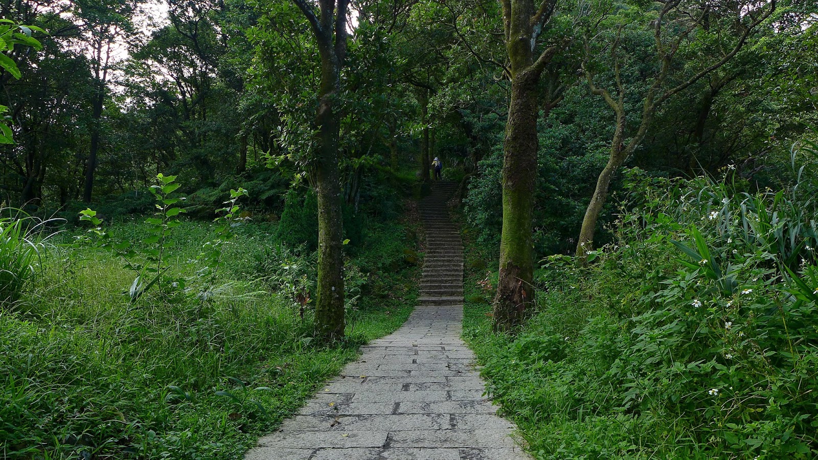 從汐止市區往大尖山看,錐形的山頭可知其名由來,登大尖山一般都從天秀宮開始走,這裡供奉的主神是關聖帝君,從這上到大尖山不長,0.7k而已,卻是一路陡上的石階,一早大家集合完,開始啟程。