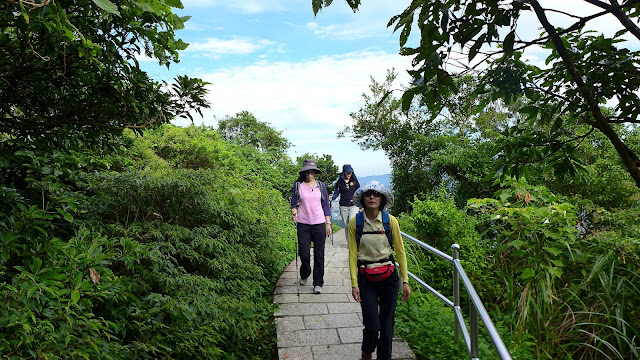 休息一會後,續步道往四分尾山2.2K,這邊到四分尾山多半在稜線上,沿途平緩涼爽好走,爬升不多,經過往清修天道院叉路可下秀峰瀑布,預定回程再走,經和尚頭山叉路也不取,續行,登四分尾山前左側有一叉路是茄苳古道可下茄苳瀑布,等會要走的路徑,先登四分尾山。