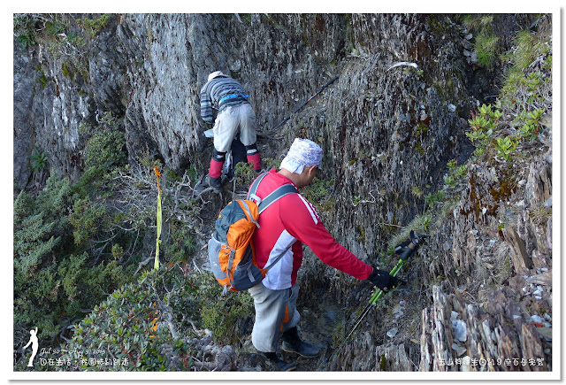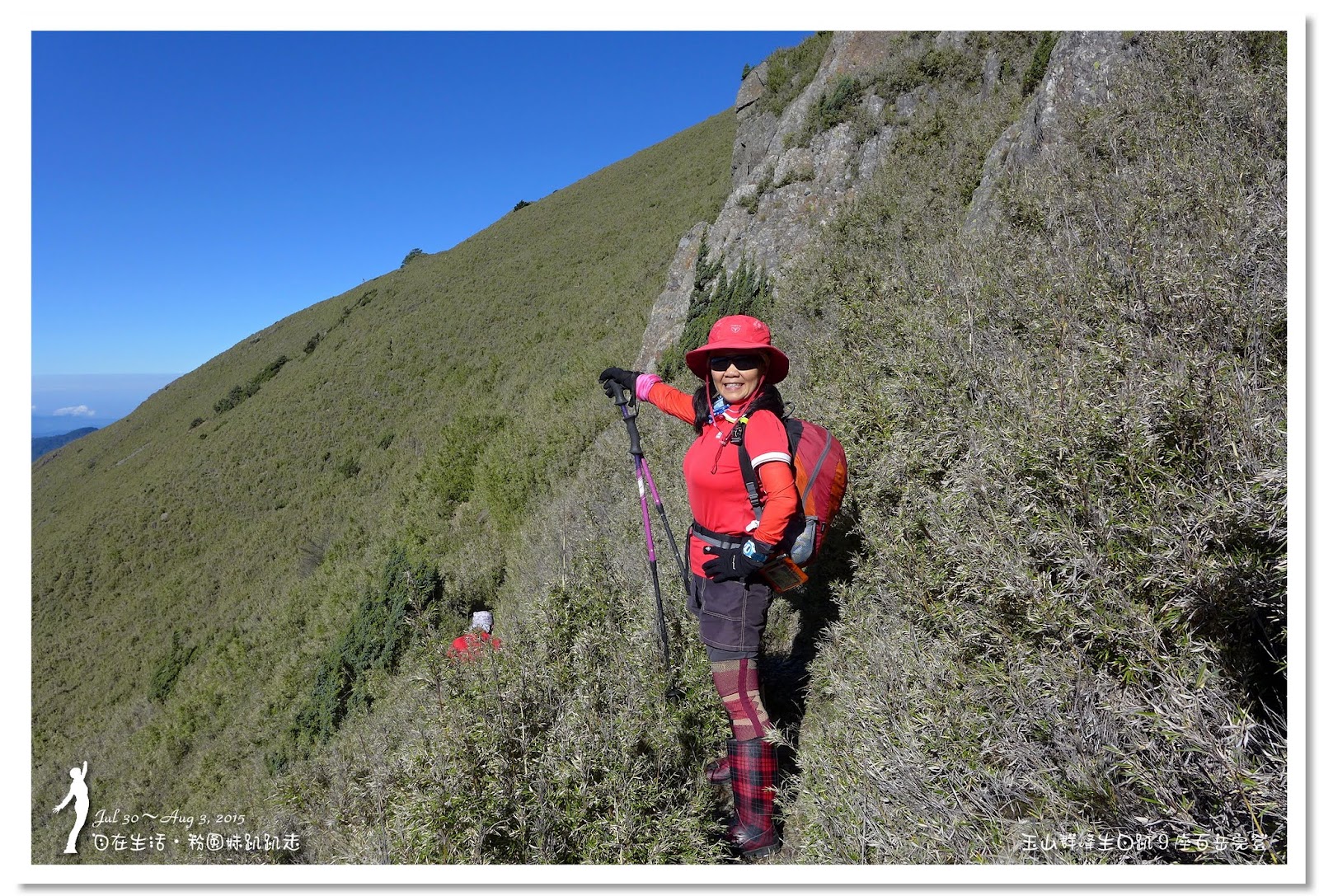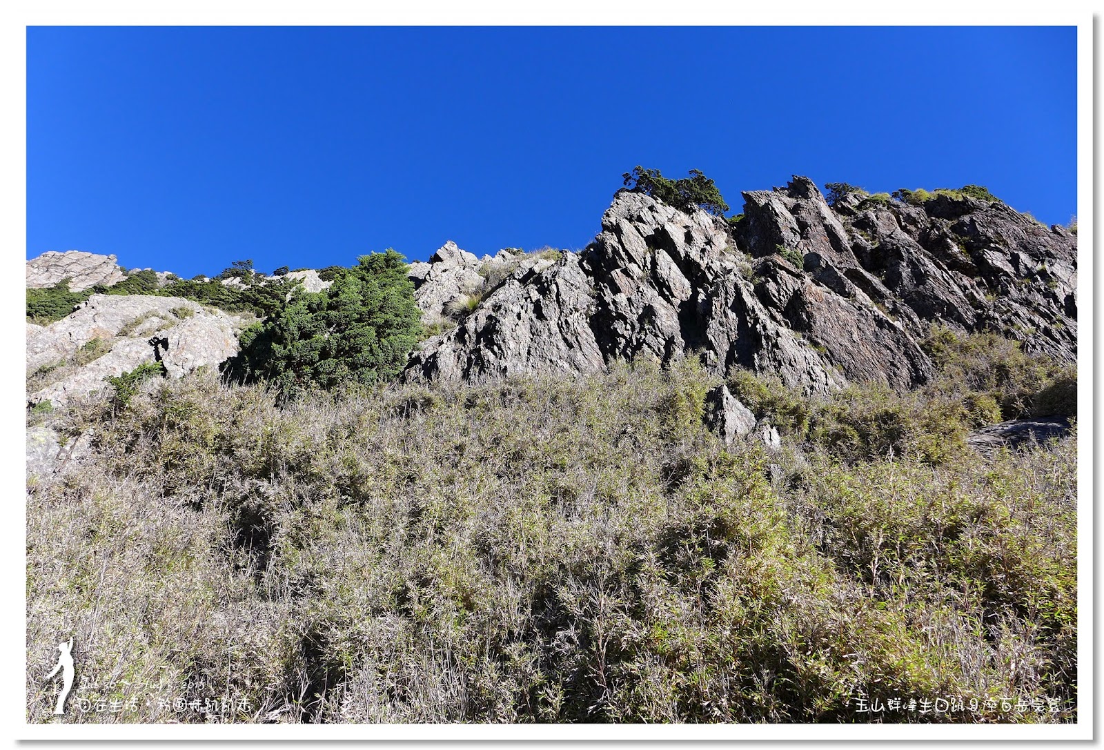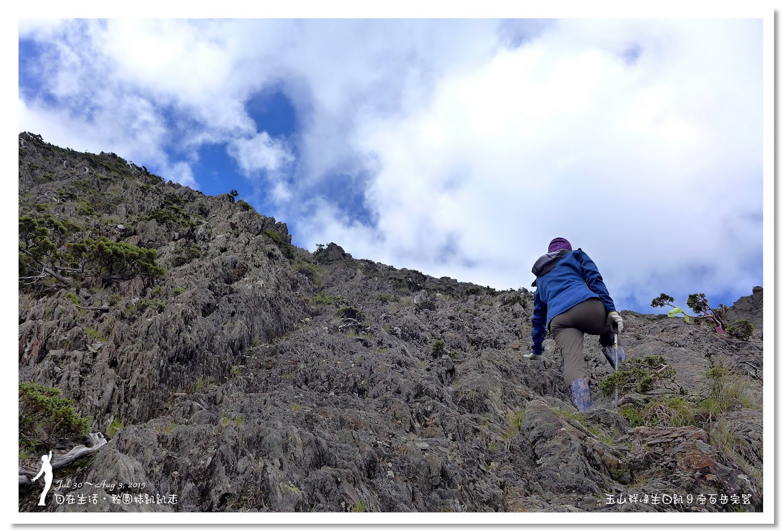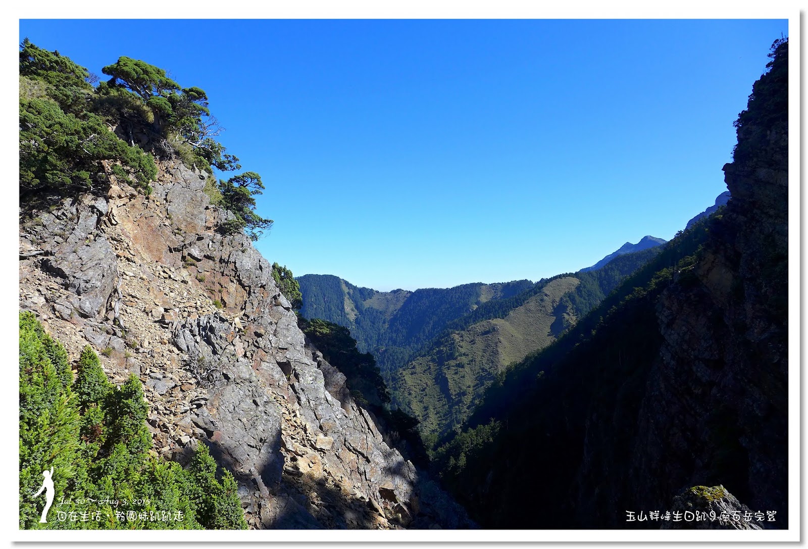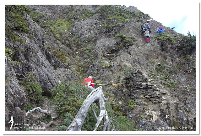 南玉山前段的懸崖危地,確實是有驚險度,天候不佳,就不適宜前往,很幸運二次來都是艷陽天。這裡布條、疊石很多,但常常不注意,也會忽略,隊友太健腳了,我常常在後面落單,雖然第二次來,還是不免會走錯,在山林裡與隊友間隔3分鐘呼叫就聽不到,人就像螞蟻一樣渺小,或被樹林等天然路障擋住看不到隊友,所以要全神貫注,這時候手機GPS就是預防迷失的好工具,第5天玉山西峰就救了自己一命(後篇再補述)。