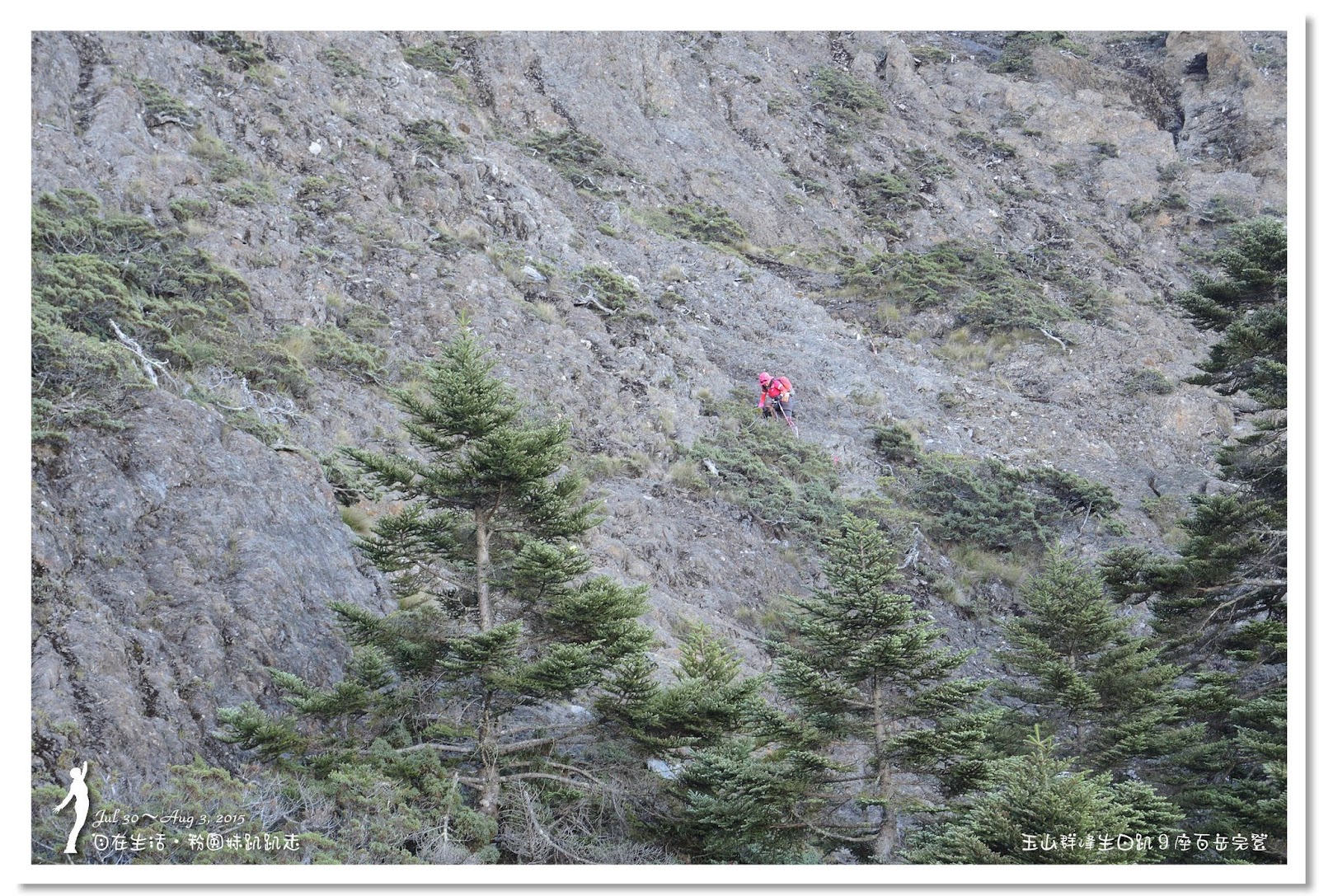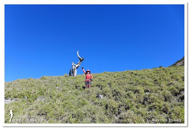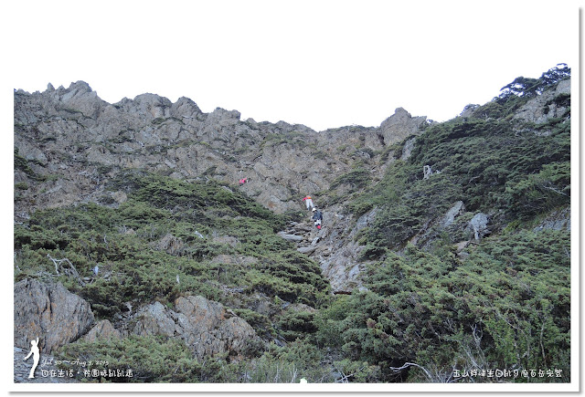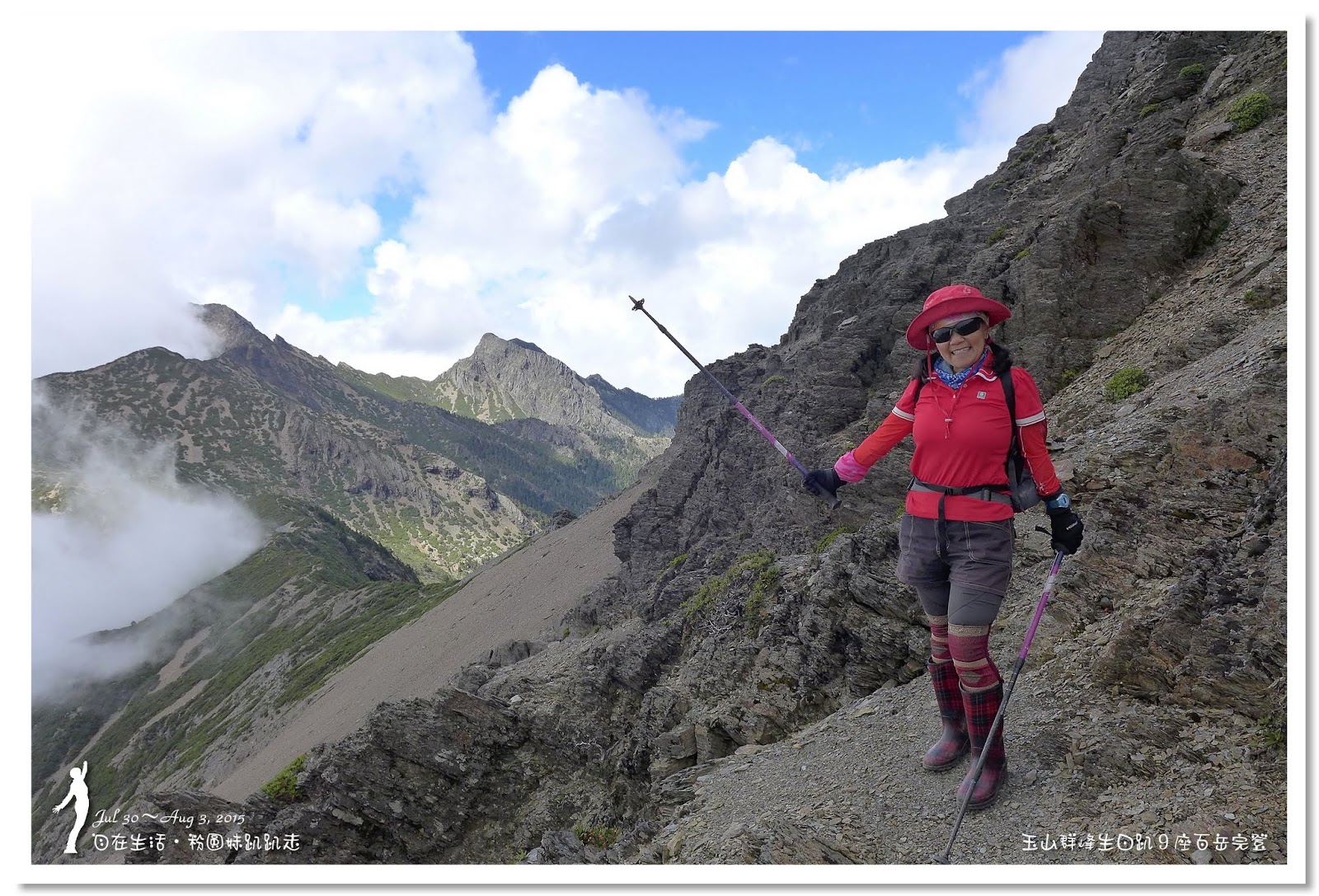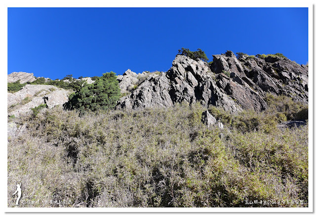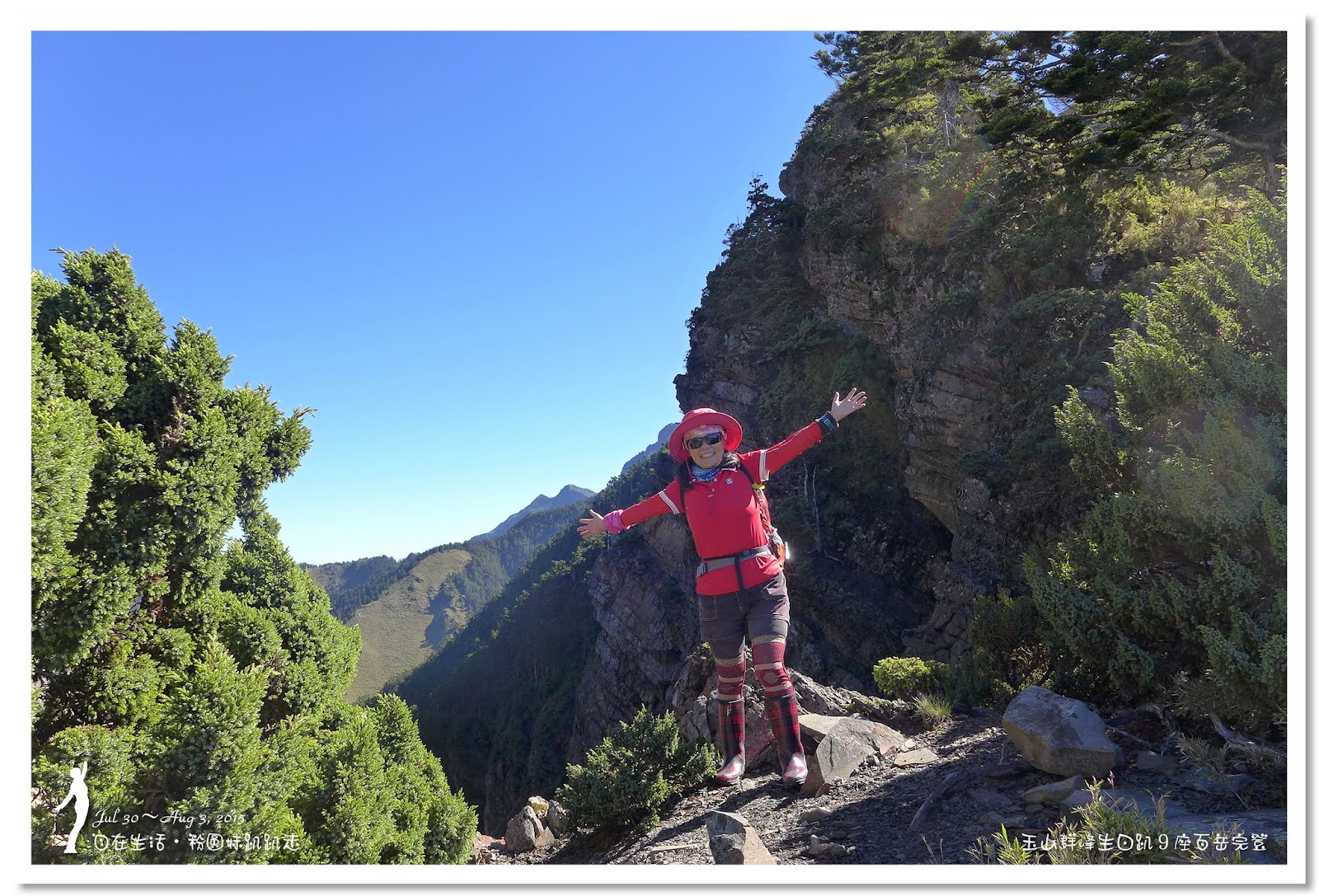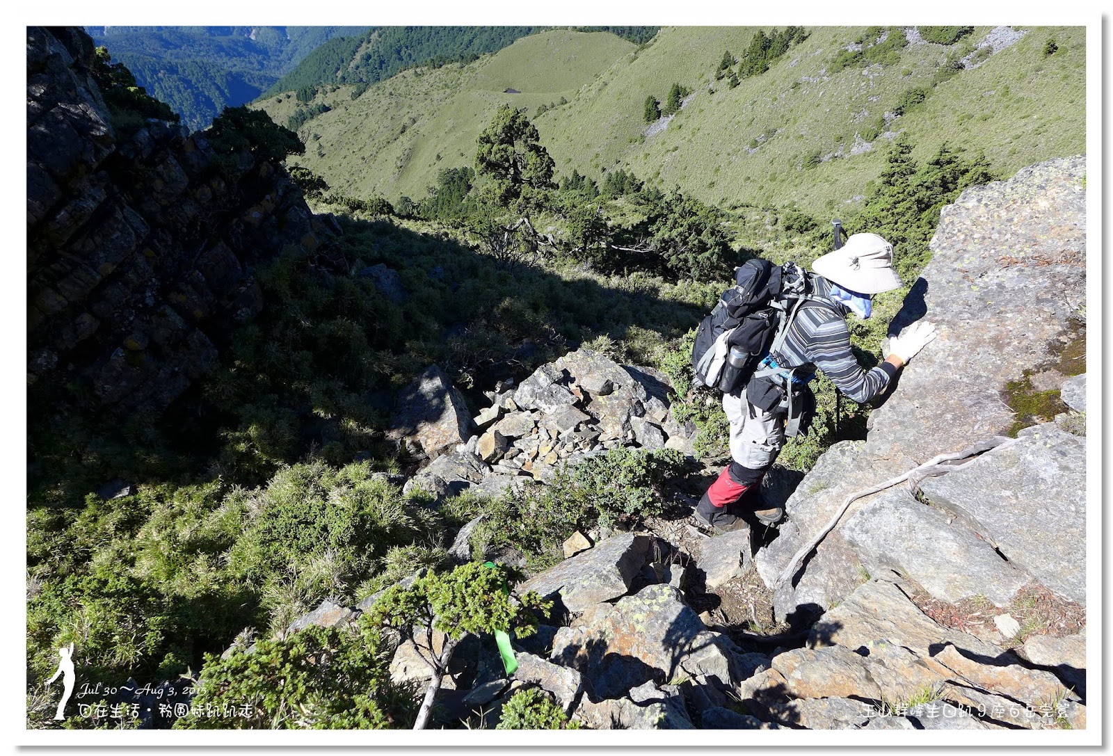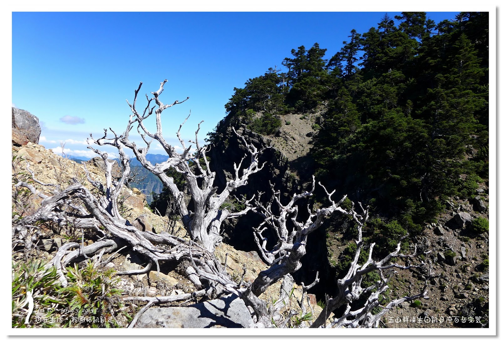 南玉山前段的懸崖危地,確實是有驚險度,天候不佳,就不適宜前往,很幸運二次來都是艷陽天。這裡布條、疊石很多,但常常不注意,也會忽略,隊友太健腳了,我常常在後面落單,雖然第二次來,還是不免會走錯,在山林裡與隊友間隔3分鐘呼叫就聽不到,人就像螞蟻一樣渺小,或被樹林等天然路障擋住看不到隊友,所以要全神貫注,這時候手機GPS就是預防迷失的好工具,第5天玉山西峰就救了自己一命(後篇再補述)。