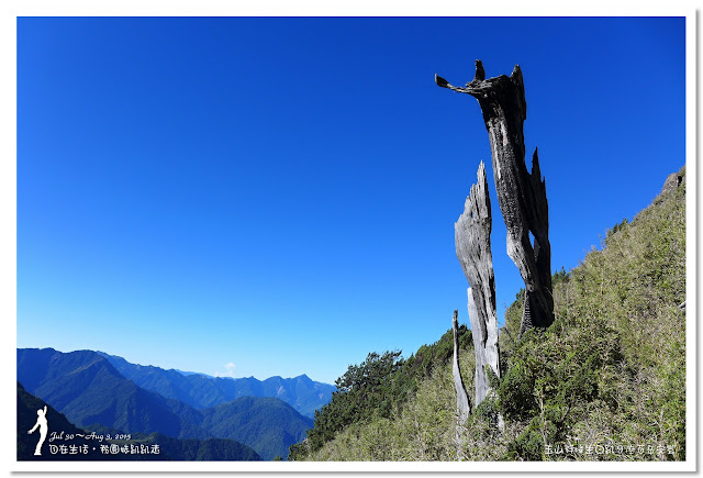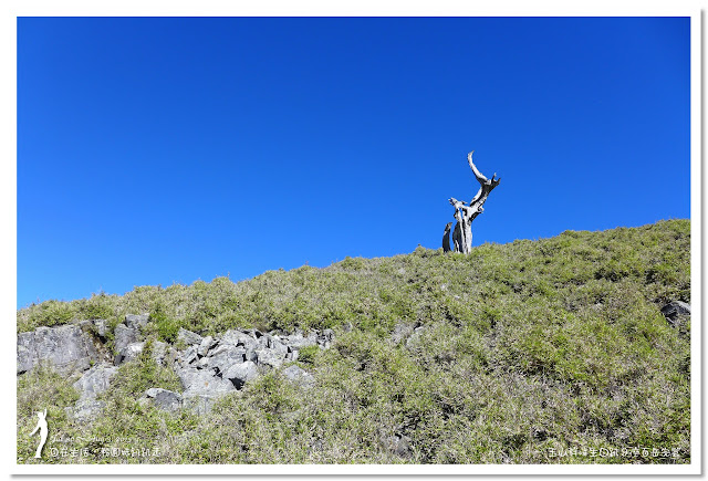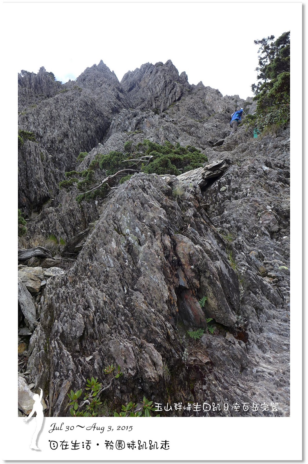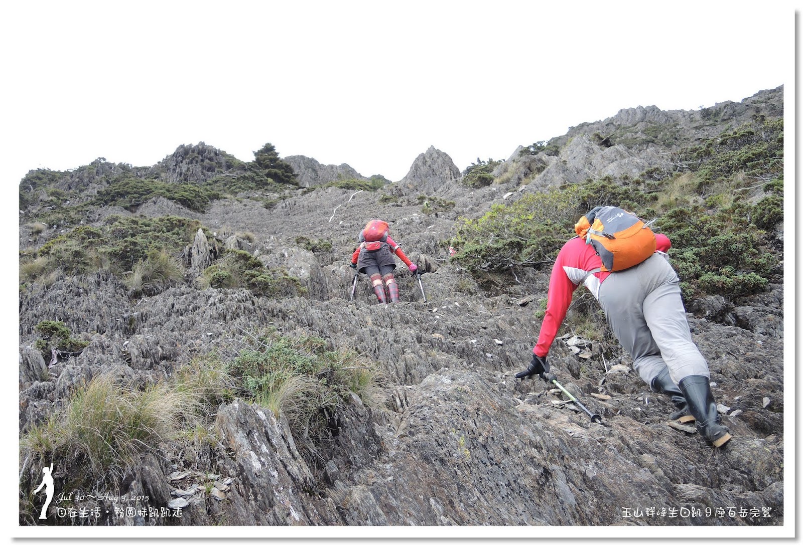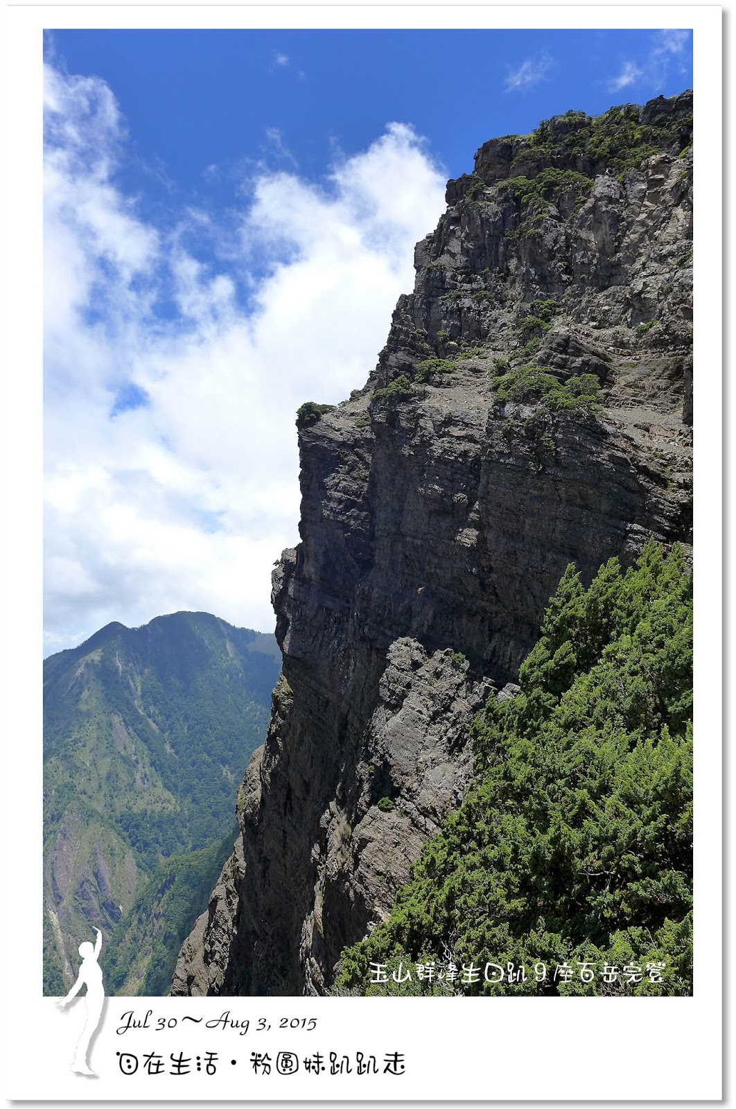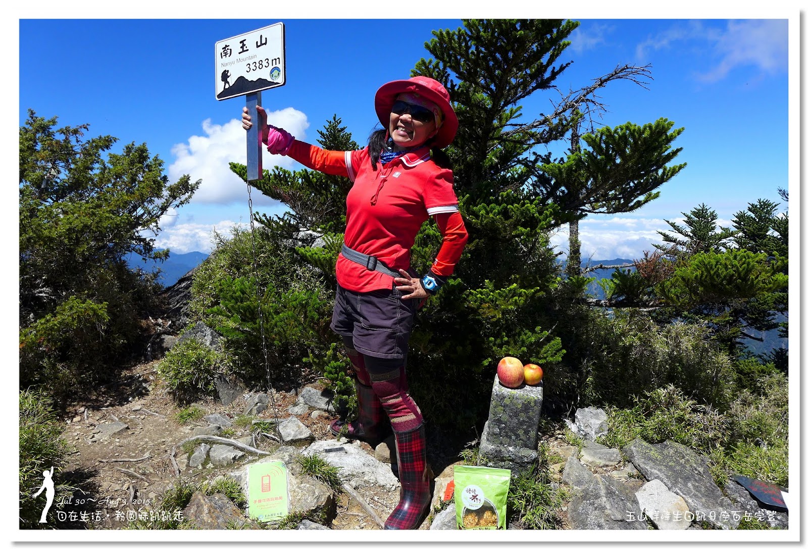 南玉山前段的懸崖危地,確實是有驚險度,天候不佳,就不適宜前往,很幸運二次來都是艷陽天。這裡布條、疊石很多,但常常不注意,也會忽略,隊友太健腳了,我常常在後面落單,雖然第二次來,還是不免會走錯,在山林裡與隊友間隔3分鐘呼叫就聽不到,人就像螞蟻一樣渺小,或被樹林等天然路障擋住看不到隊友,所以要全神貫注,這時候手機GPS就是預防迷失的好工具,第5天玉山西峰就救了自己一命(後篇再補述)。