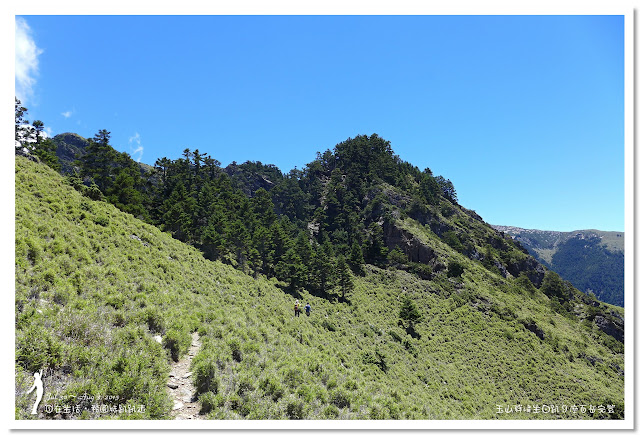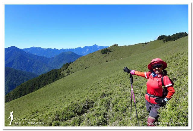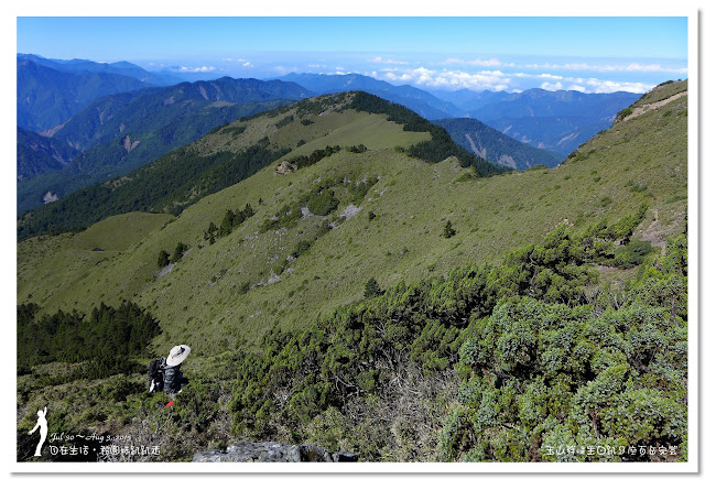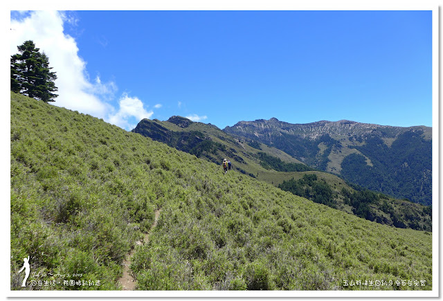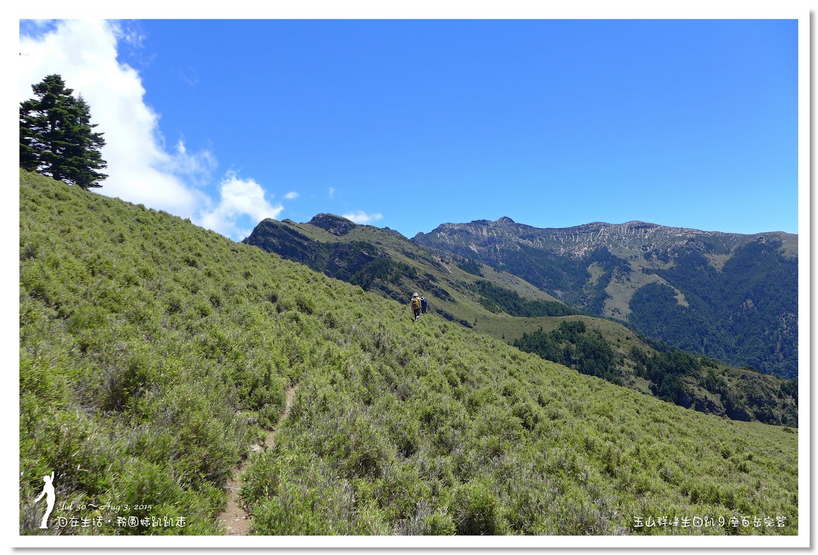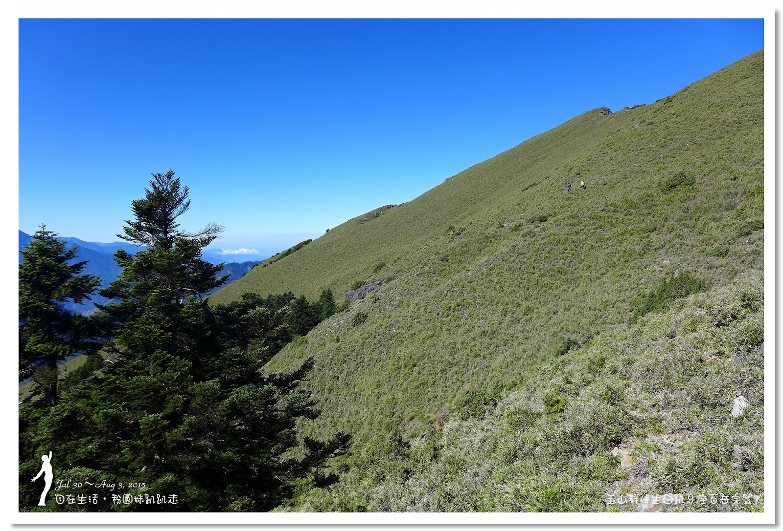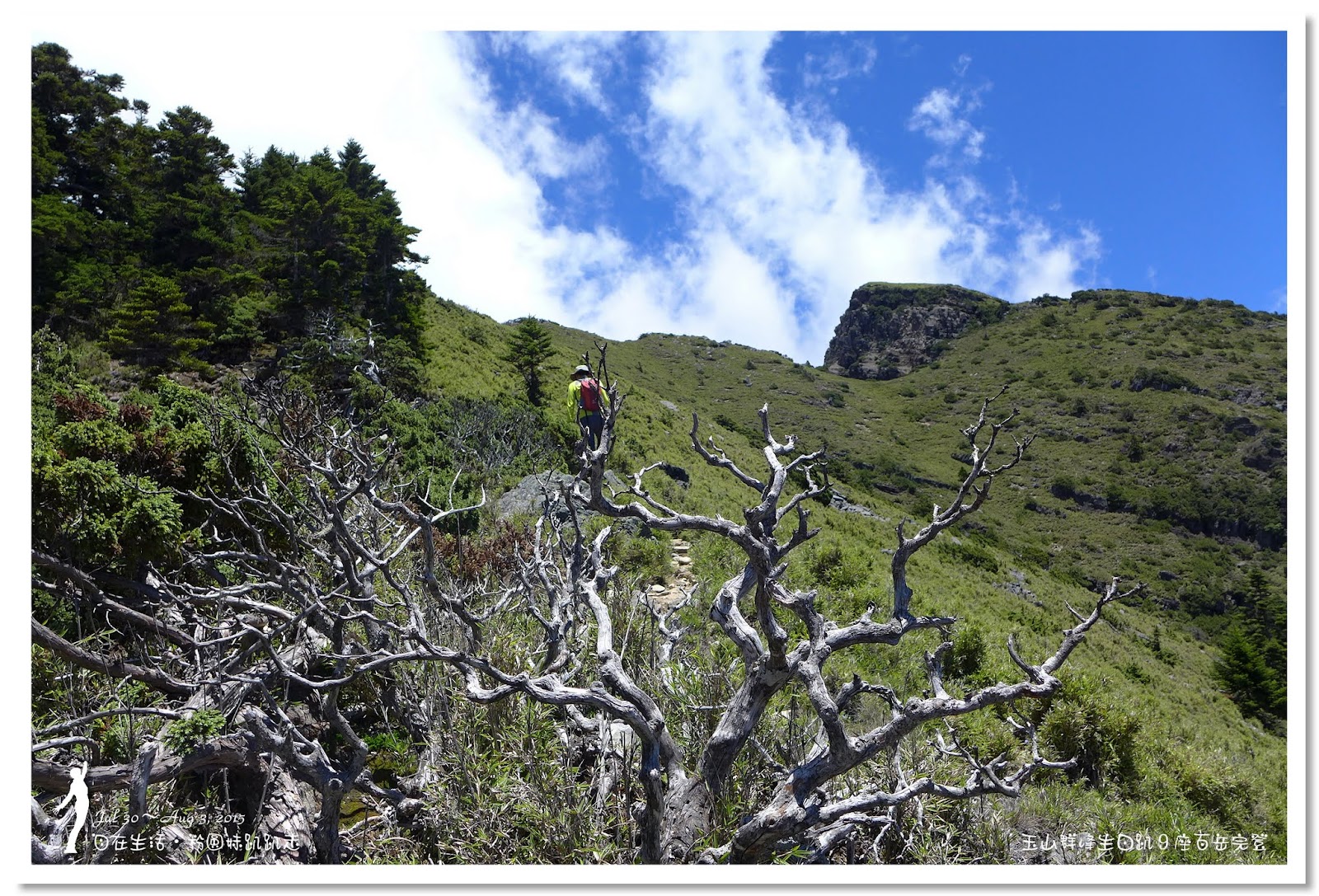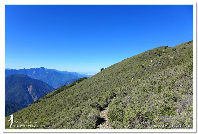 走過了懸崖危地,就進入一片草原,我最愛這一段路,往前望關山、南一段都清晰可見,回頭望主峰、圓峰、三叉峰、南峰、東小南山近如咫尺,走在這段路,讓我想起南華山也有如此美麗的草坡,邊走邊欣賞著遠方層層山巒,綠草如蔭,完全會忘了艷陽高照,特意與隊友拉開距離,拍起照片大家都像個小螞蟻一般在草地裡穿梭。南玉山,也是一個沿路看不到山頭的一座山,但是它的美麗風光,並不會讓人有走不到的崩潰感,是我很愛的一座山。