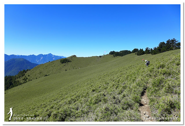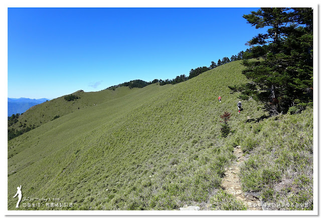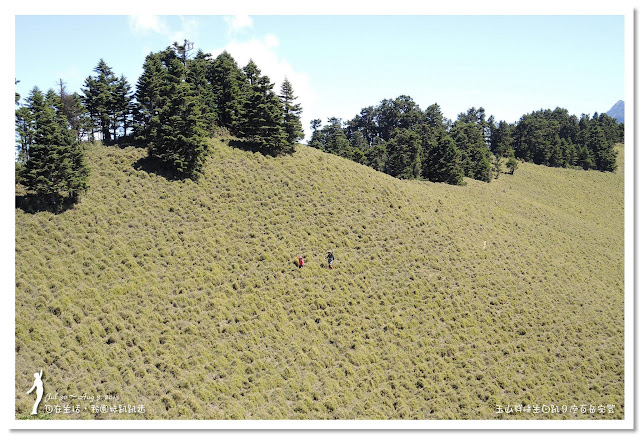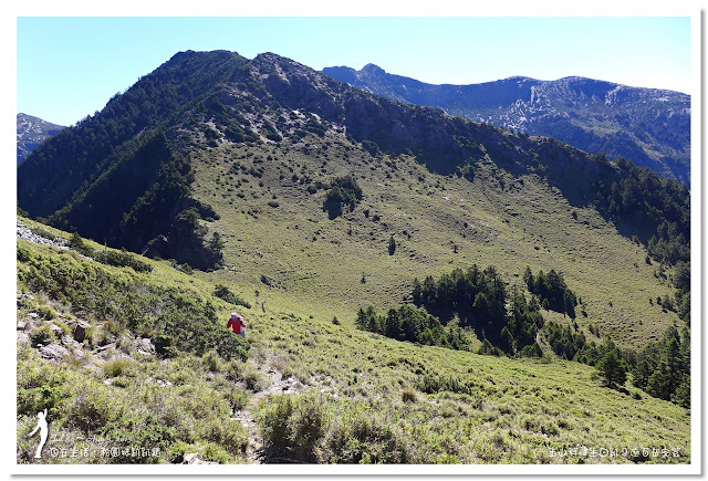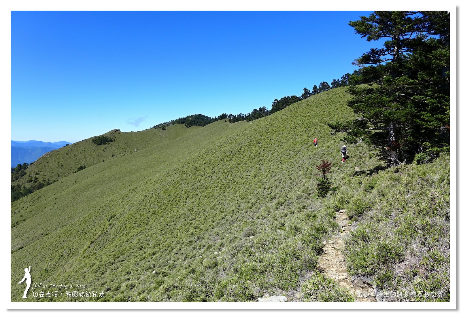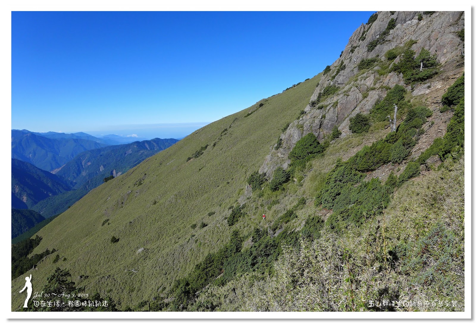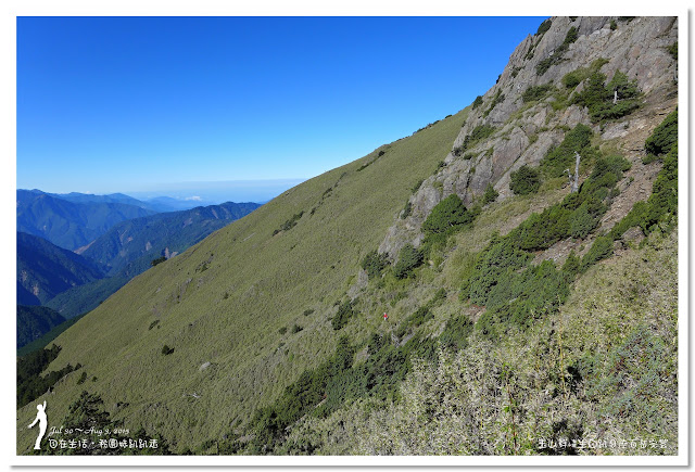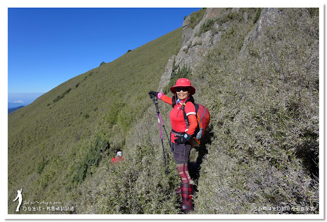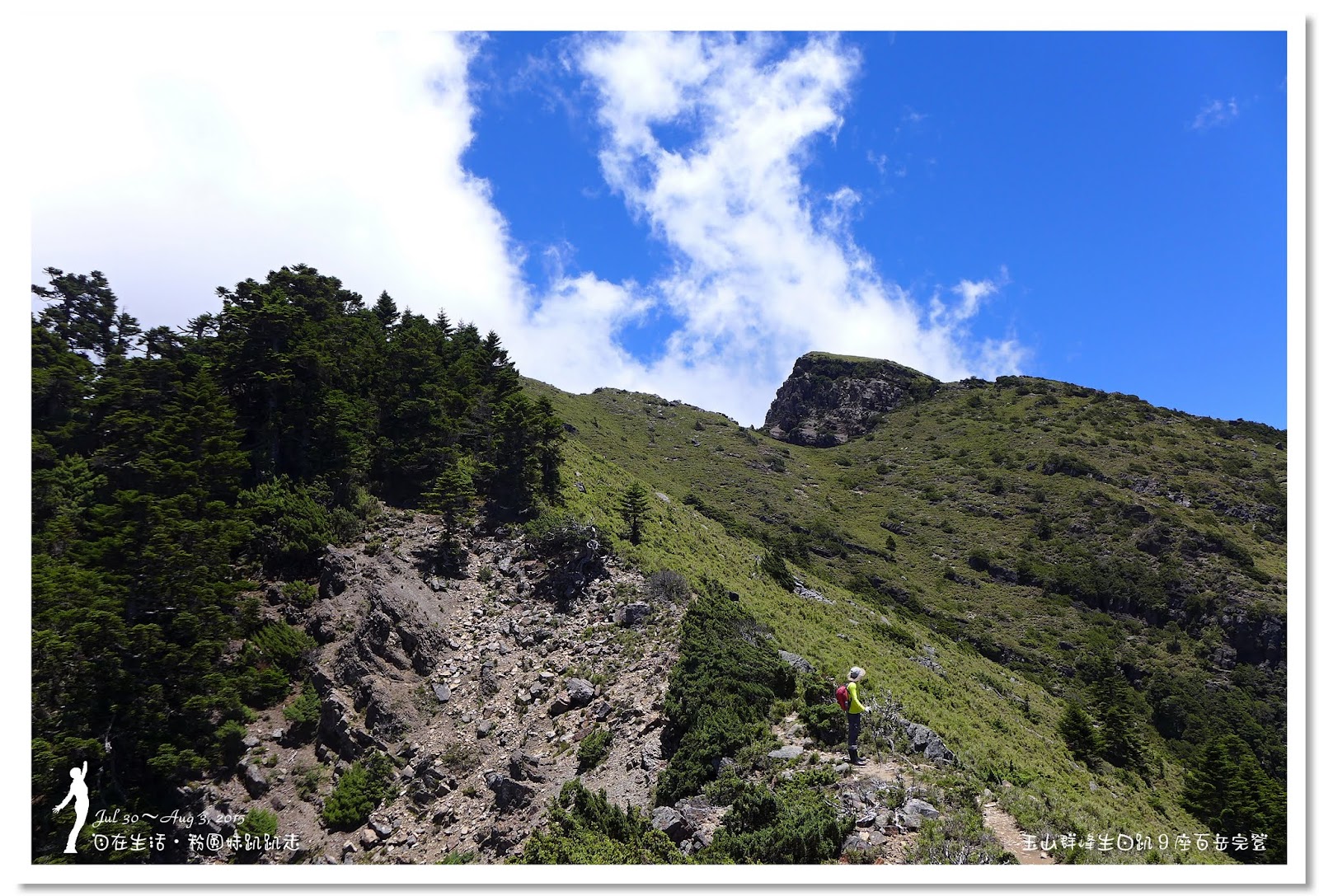 走過了懸崖危地,就進入一片草原,我最愛這一段路,往前望關山、南一段都清晰可見,回頭望主峰、圓峰、三叉峰、南峰、東小南山近如咫尺,走在這段路,讓我想起南華山也有如此美麗的草坡,邊走邊欣賞著遠方層層山巒,綠草如蔭,完全會忘了艷陽高照,特意與隊友拉開距離,拍起照片大家都像個小螞蟻一般在草地裡穿梭。南玉山,也是一個沿路看不到山頭的一座山,但是它的美麗風光,並不會讓人有走不到的崩潰感,是我很愛的一座山。