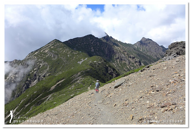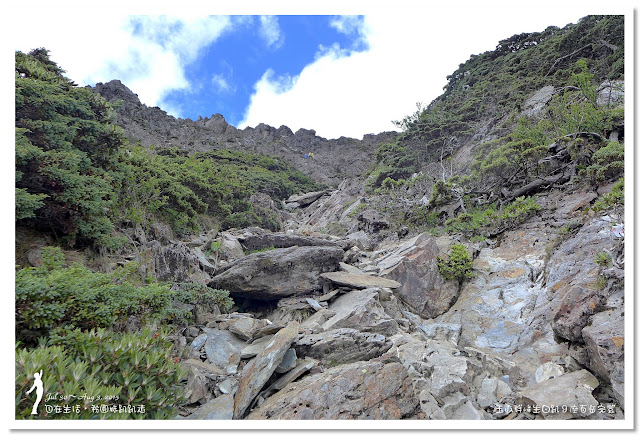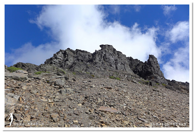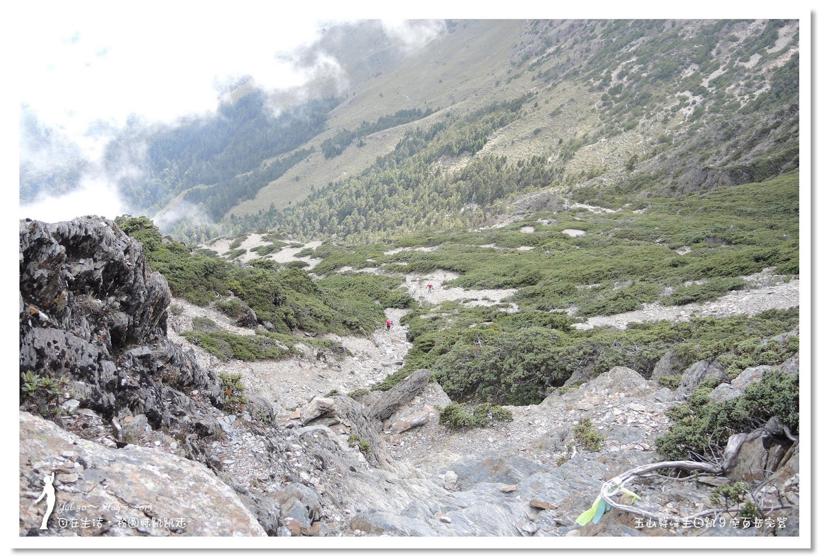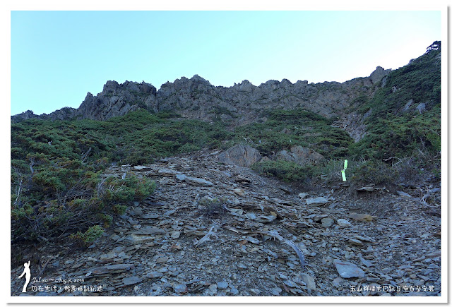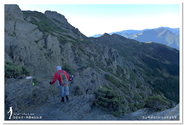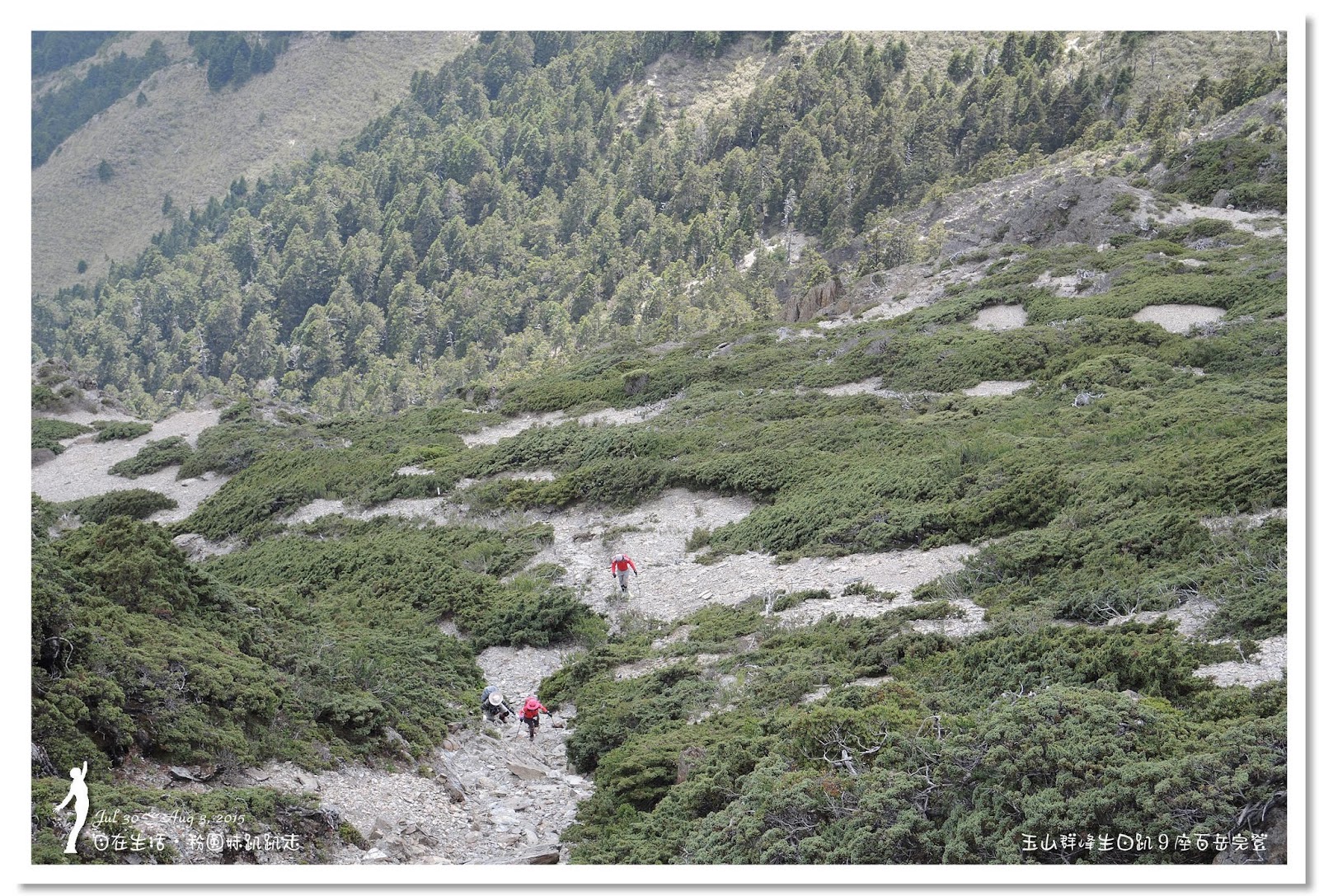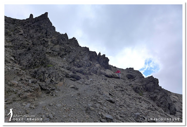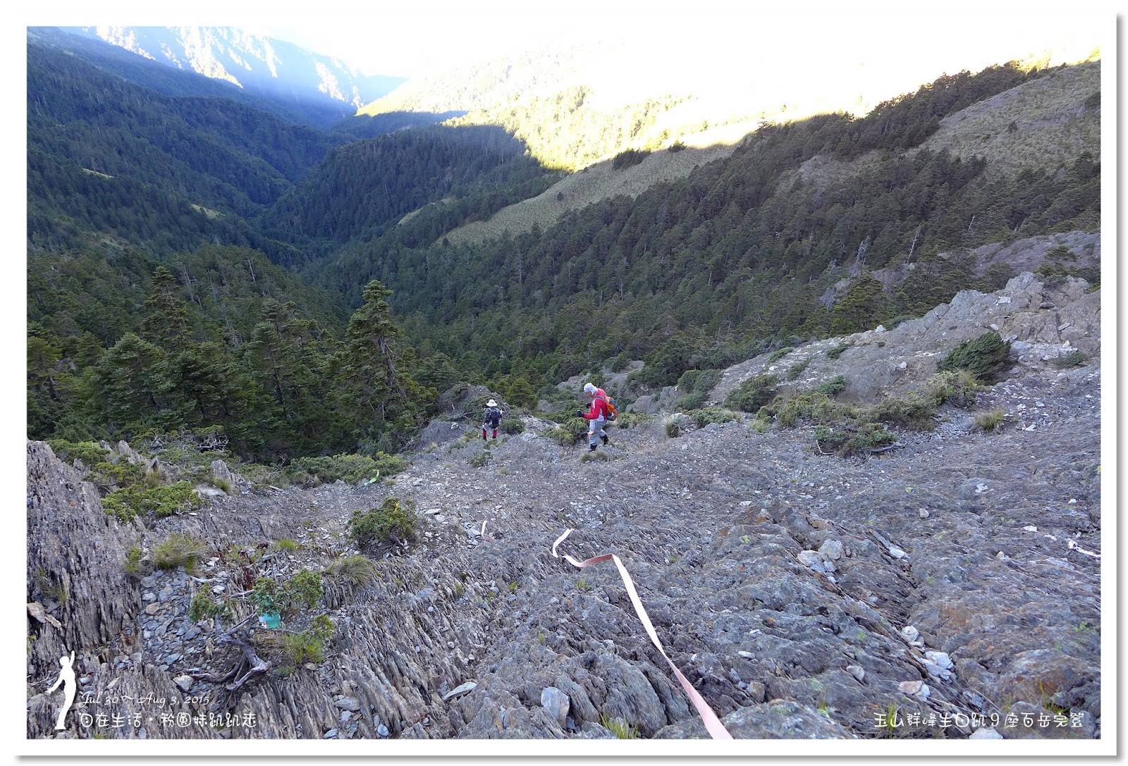 今天單走南玉山,是幾天裡面最輕鬆的一天,難得早上不用摸黑,天亮了才出發。小心心經過昨天的休息,今天又恢復了神腳的速度。而我仍一樣慢熱,早上都要先度過吸不到氧氣的適應期,只好一路在後面苦苦追趕。爬上碎石坡,過了三叉峰,就是不停的陡下斷崖,上回是摸黑走,只看到眼前的路,反而糊里糊塗就走下去了,回程才知道下到那麼深。這次天亮走,有了第一次經驗,這回心裡有了準備,從三叉峰下到水源1約下降海拔100公尺,再到水源2又再下降海拔100公尺。夏季的水源1水量較大,同伴們裝了很多水,打算藏在半路喝,上次我是冬季來,水源很小幾乎沒有,缺水季時水源很不穩定要留意。練習降低喝水量,可以省很多麻煩,我帶1000cc,全程都沒有喝完,是被上次的缺水嚇到了吧。鹽糖到是吃很多,補充電解質,亦可以幫助分泌唾液。