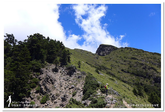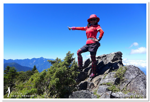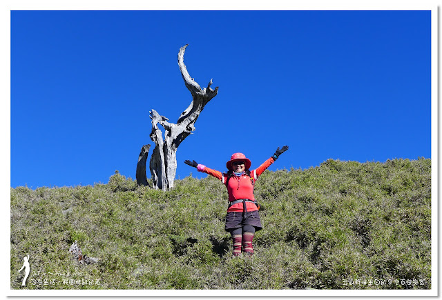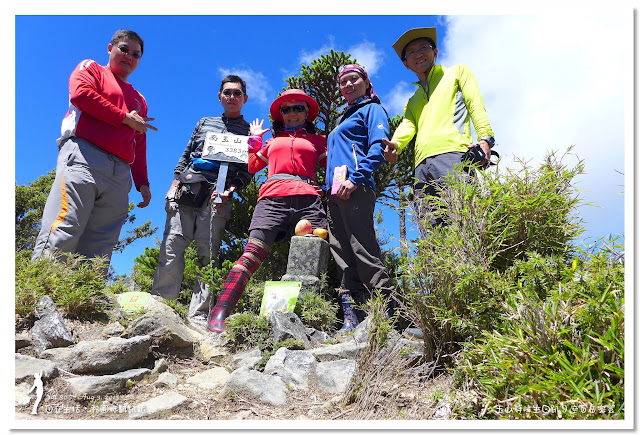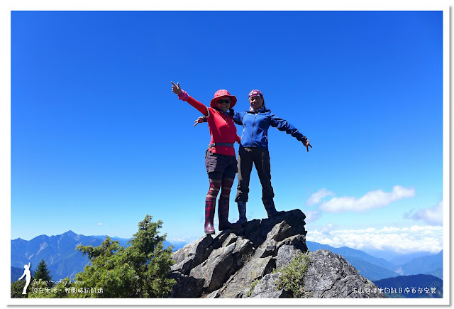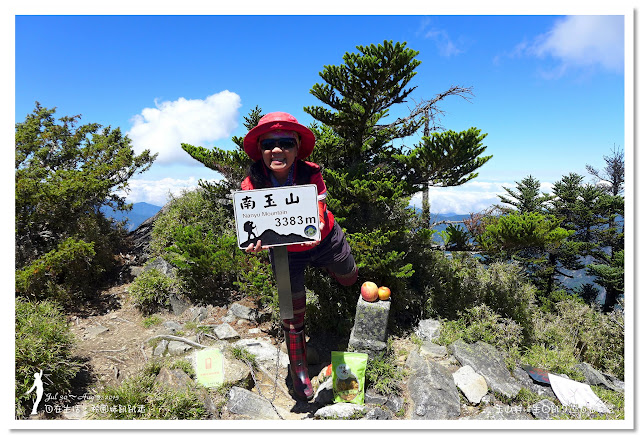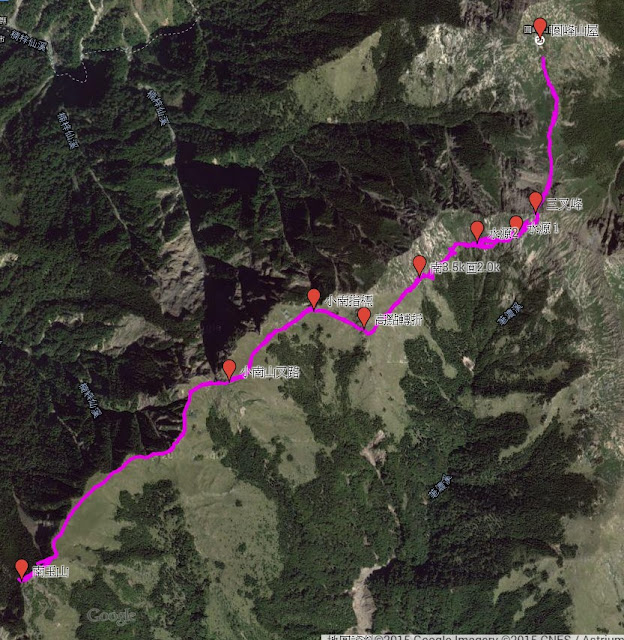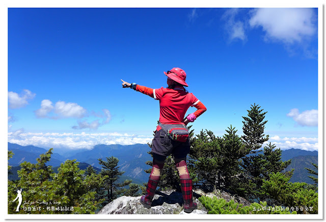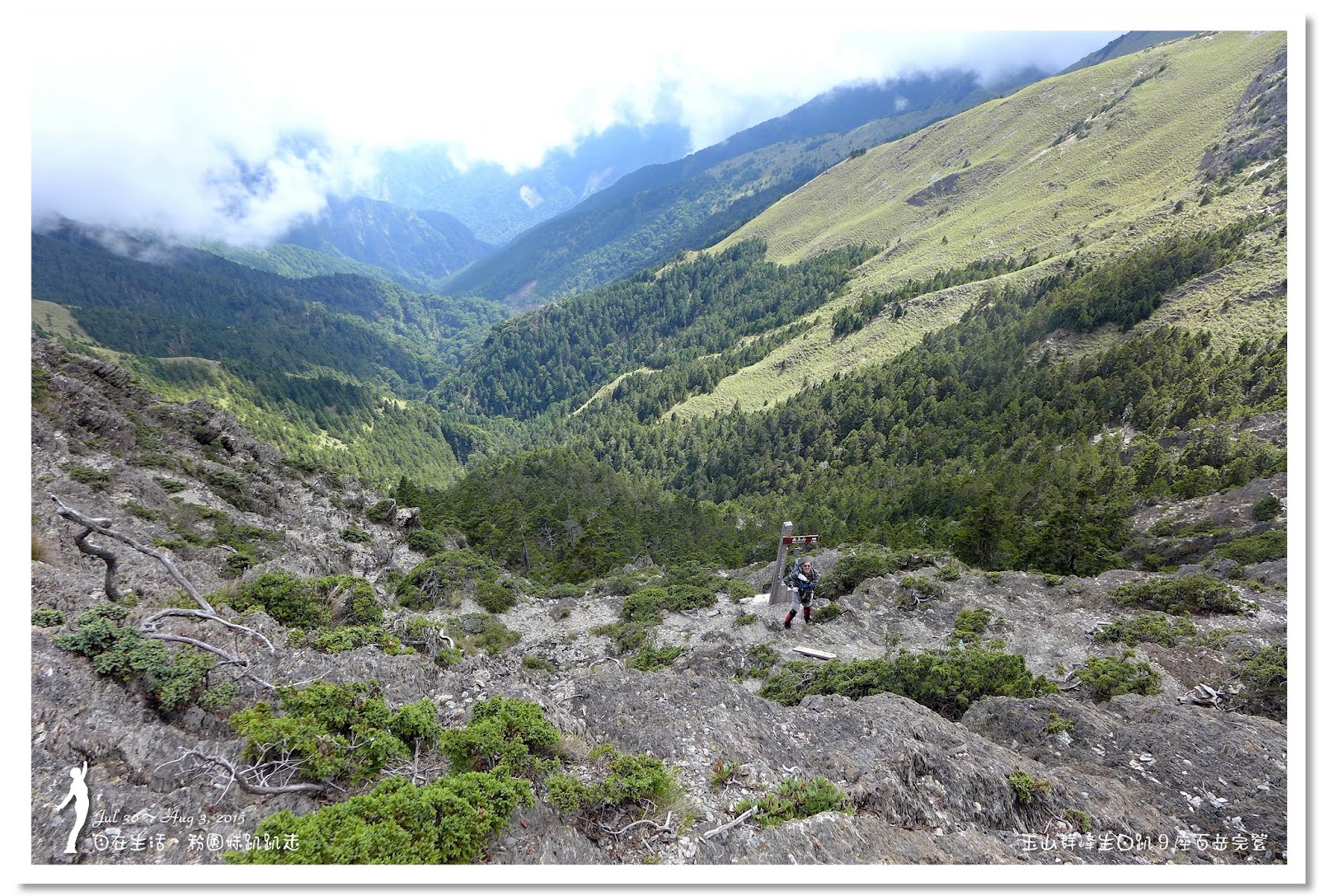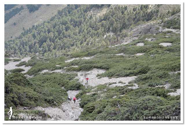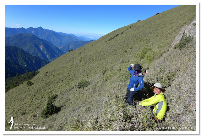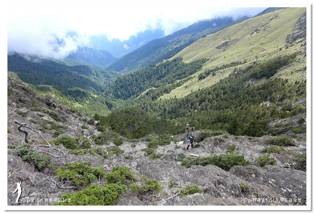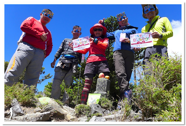 一路上都只是小休3分鐘,好不容易有一次大休10分鐘,10:02到南玉山,因為不用趕其它山頭,終於可以休1小時了,上次因為要趕其它山頭登頂匆匆,沒有好好看看山頂四周景觀,我看資料上寫南玉山展望很好,可惜都沒看到,這回可要好好看看,原來三角點牌子後面的大石頭,真是拍照的好地點,可以拍「站在高崗上」的英姿,這是我最愛的場景。大家狂拍照,還幫我們二位壽星唱生日快樂歌,才快樂的下山。本來說好要上小南山看看的,結果有人喝醉了,只好放棄了,慢慢的往山屋前進,哇~這段慢慢走的路,真是這幾天我走得最舒服的一段路,可以慢到不喘,否則南玉山回程陡上200公尺的懸崖,可真的會折磨死人呢~