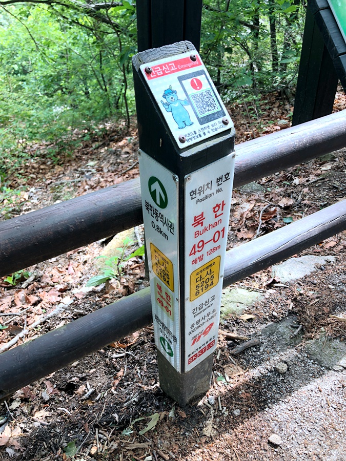 在韓國登山,大概每走一段距離,你就有機會看到這樣的一個木樁,上面記載了非常多的資訊,包括救援木樁編號(如49-01)、目前所在地海拔、路線指標與行進方向、座標與緊急聯繫電話。沒錯,上述那張地圖就是用來標示這些木樁的所在位置的。若你有登過加里山,大概就有看過類似救援木樁的設計,只是韓國的救援木樁上承載了更多的訊息,再加上地圖,所以每個人都可以輕易地知道哪一支木樁在哪裡。今天當你有求援需求時,即使你不會用手機查閱GPS座標,你也可以直接回報你的救援木樁編號即可。是不是很平易近人呢?